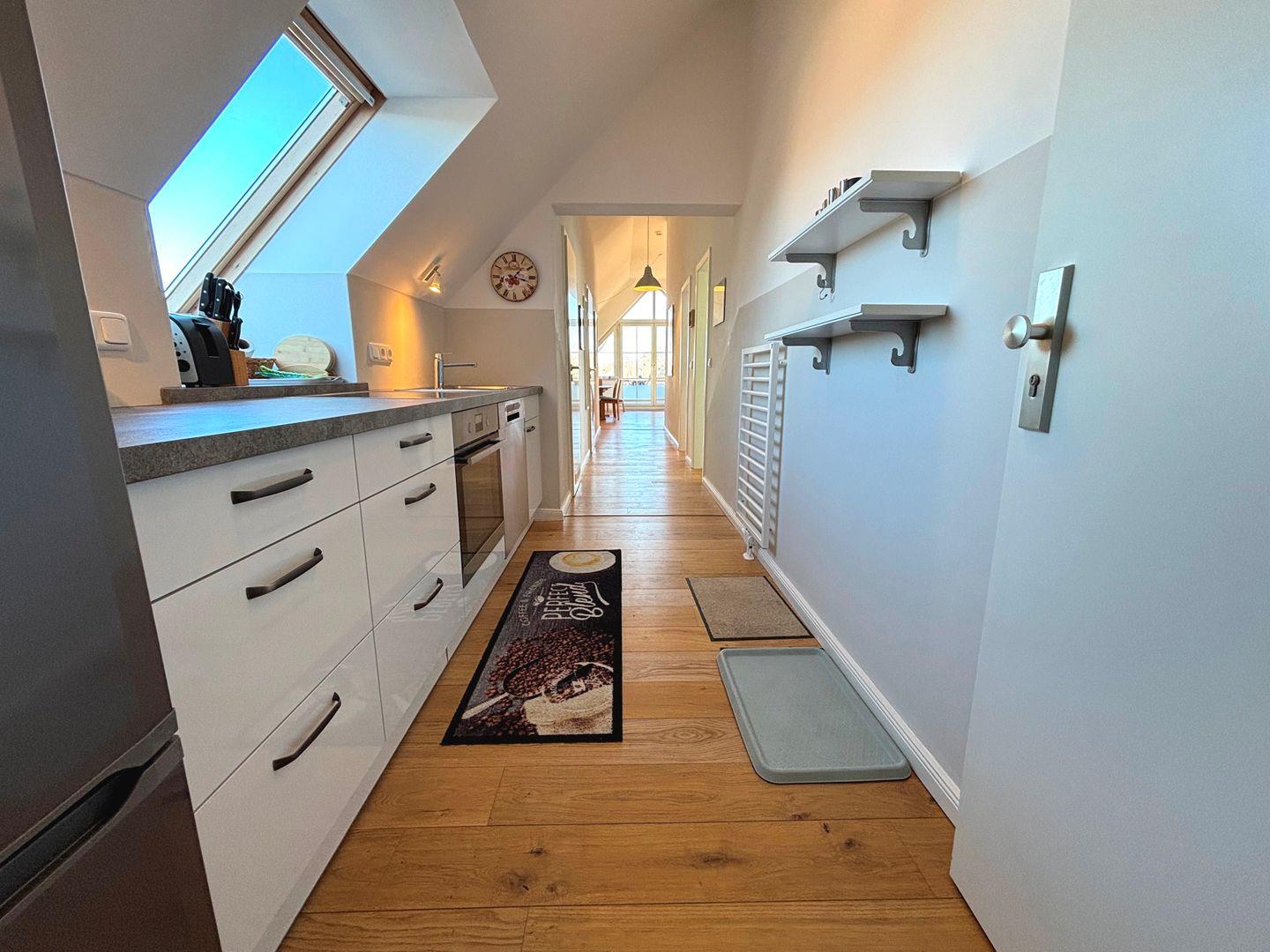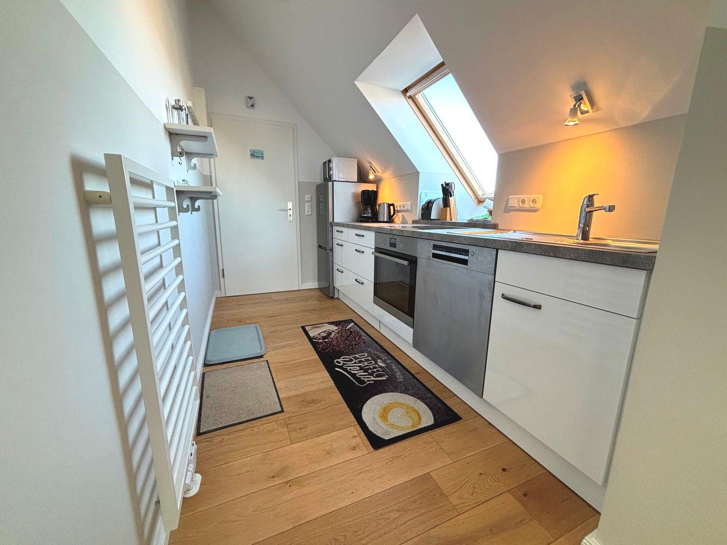 Schreiten Sie in das Innere des Objekts und lassen Sie sich von der hochwertigen Innenausstattung verzaubern. Die Einbauküche ist komplett eingerichtet und lässt keine Wünsche offen. Sie verfügt über ein Cerankochfeld, einen Backofen, eine Mikrowelle, einen Geschirrspüler, einen Kühlschrank mit Gefrierschrank (2 Fächer), einen Toaster, einen Wasserkocher und eine Kaffeemaschine. Bereiten Sie köstliche Mahlzeiten zu und genießen Sie Ihre Speisen im kombinierten Ess- und Wohnbereich. Der Wohnbereich lädt mit einem gemütlichen Ecksofa, einem Flachbildfernseher und einem Sessel zum Entspannen ein. Von hier aus haben Sie auch direkten Zugang zum Balkon, um die frische Luft und die herrliche Aussicht zu genießen.