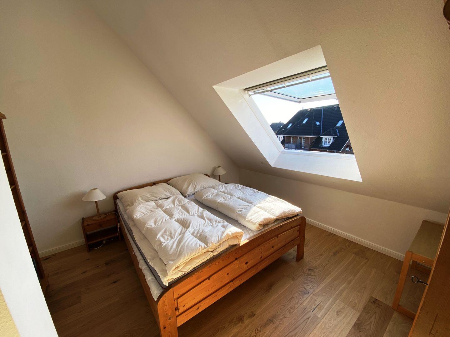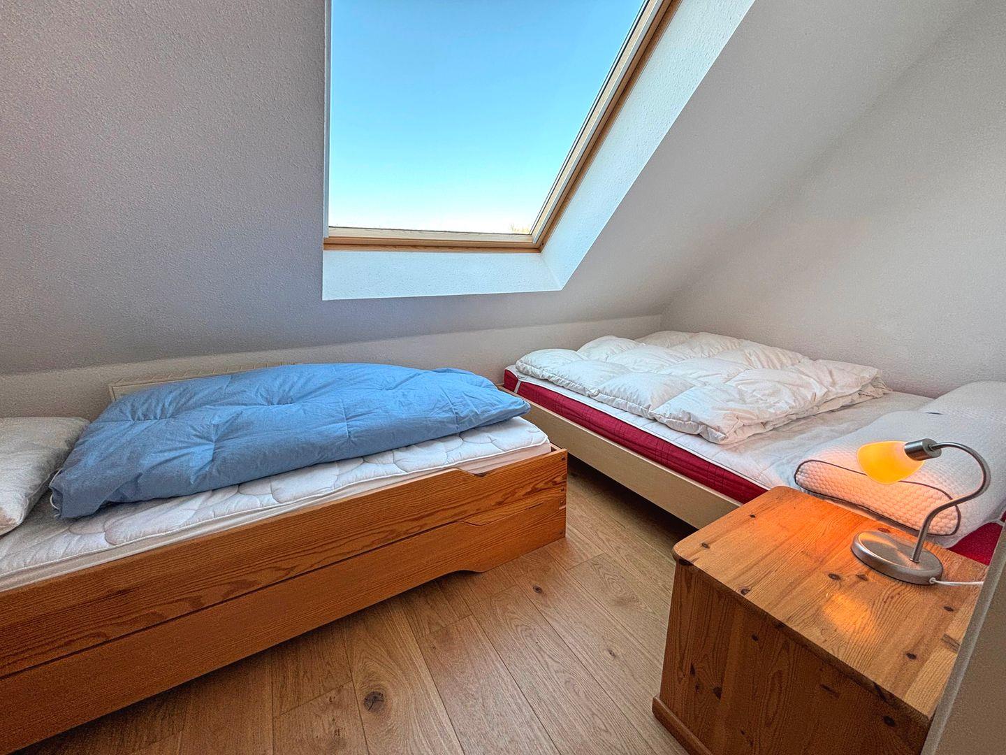 Erholung finden Sie in den liebevoll eingerichteten Schlafzimmern. Das erste Schlafzimmer bietet Ihnen ein komfortables Doppelbett mit speziellen Komfort-Matratzen und einem Topper der über beide Matratzen geht. Hier werden Sie traumhaft schlafen und sich rundum wohl fühlen. Zwei Nachttische und ein geräumiger Kleiderschrank bieten ausreichend Platz für Ihre persönlichen Gegenstände. Die Wohnung wurde 2022 komplett mit einem hochwertigen Parkettfußboden verlegt und ist dadurch auch für Allergiker geeignet. Das zweite Schlafzimmer verfügt über ein Einzelbett und ein Doppelbett, sodass auch Familien oder größere Gruppen bequem Platz finden. Ein kleiner Schrank und ein Beistelltisch komplettieren das Zimmer.