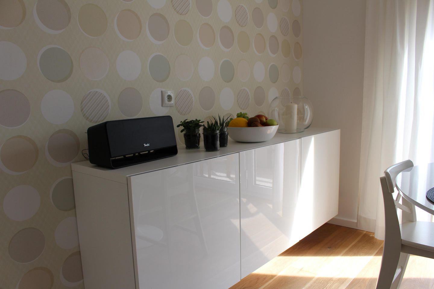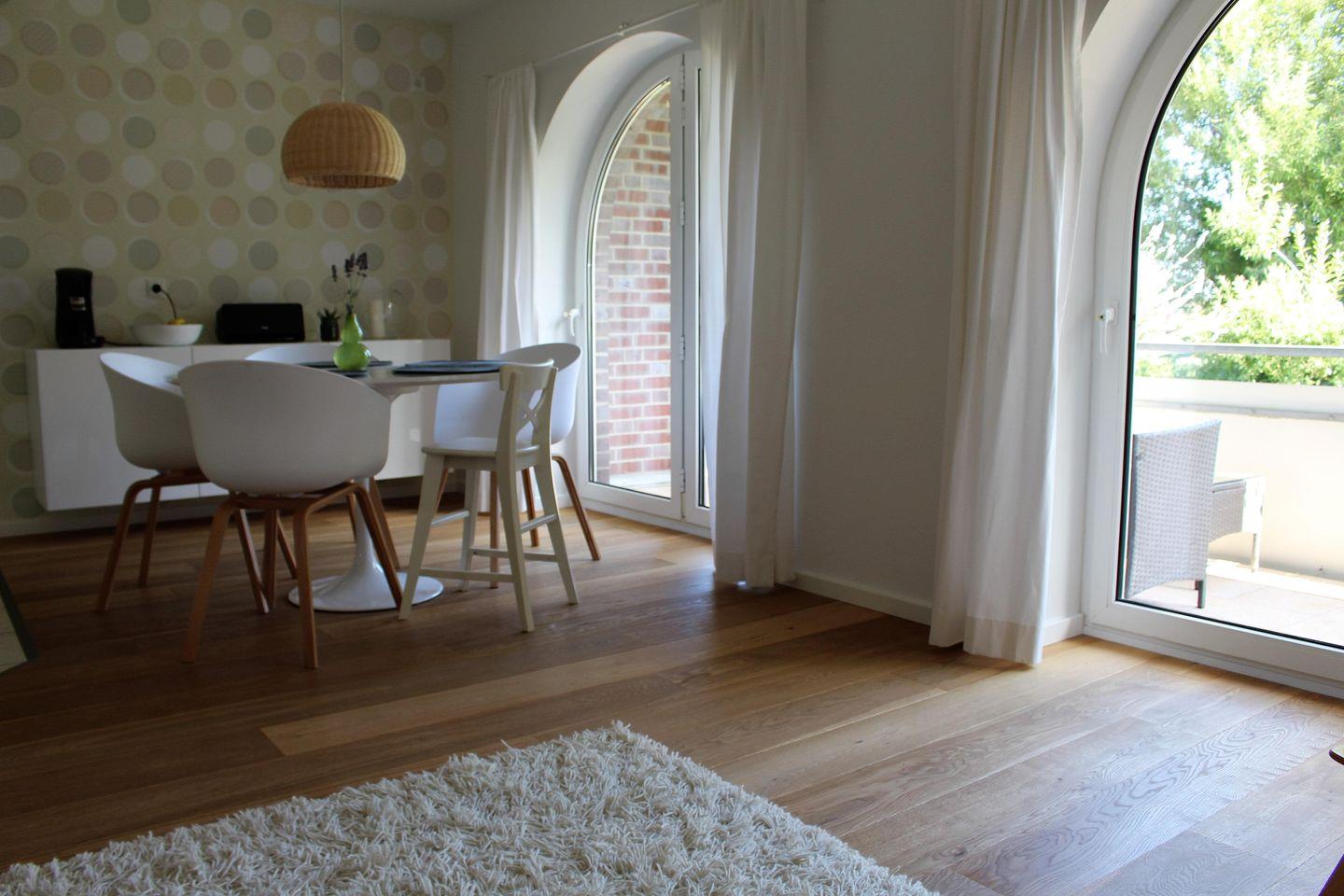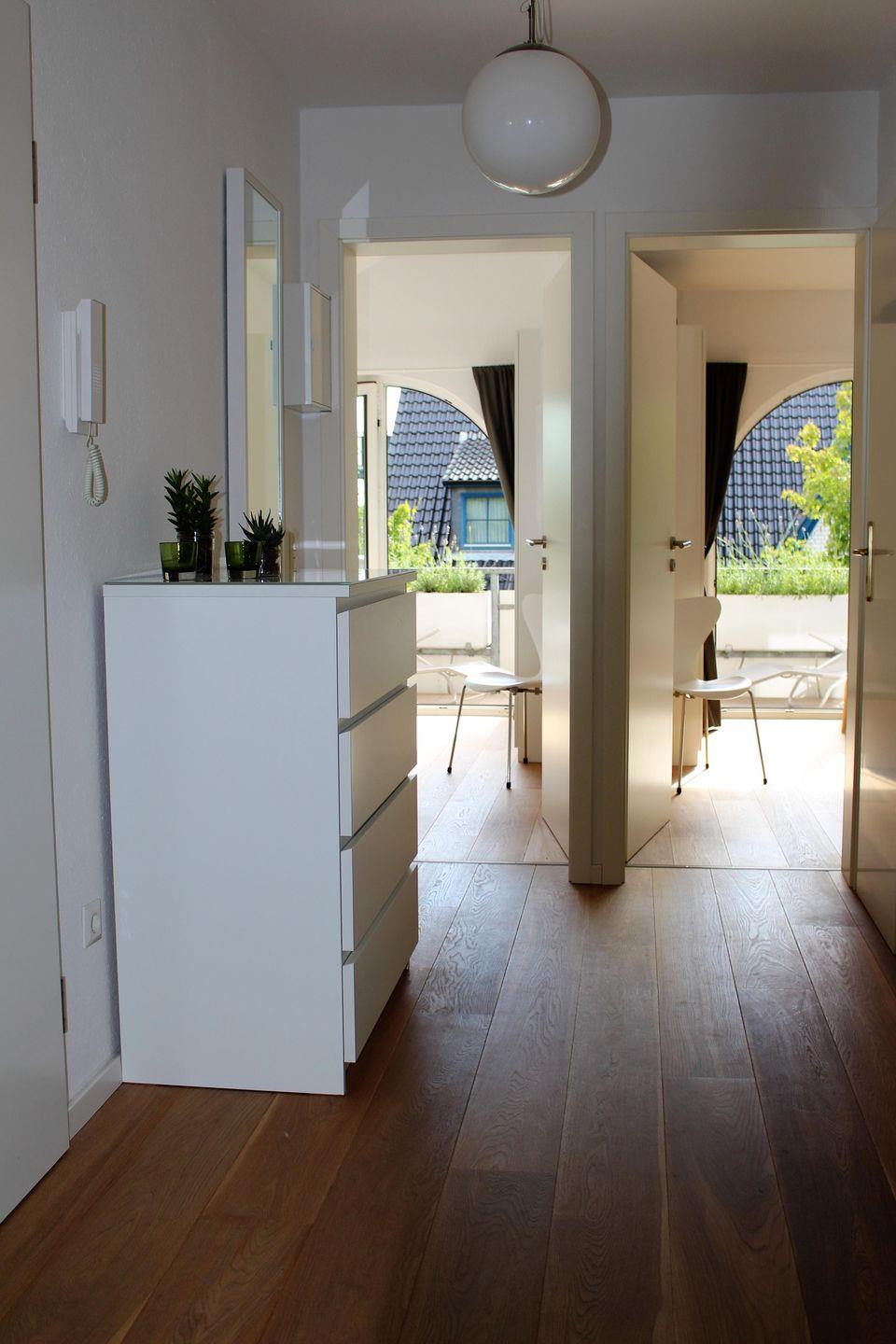 Die im April 2016 neu renovierte Wohnung wirkt mit den weißen Möbeln und dem Echtholzfußboden sehr einladend und hochwertig.