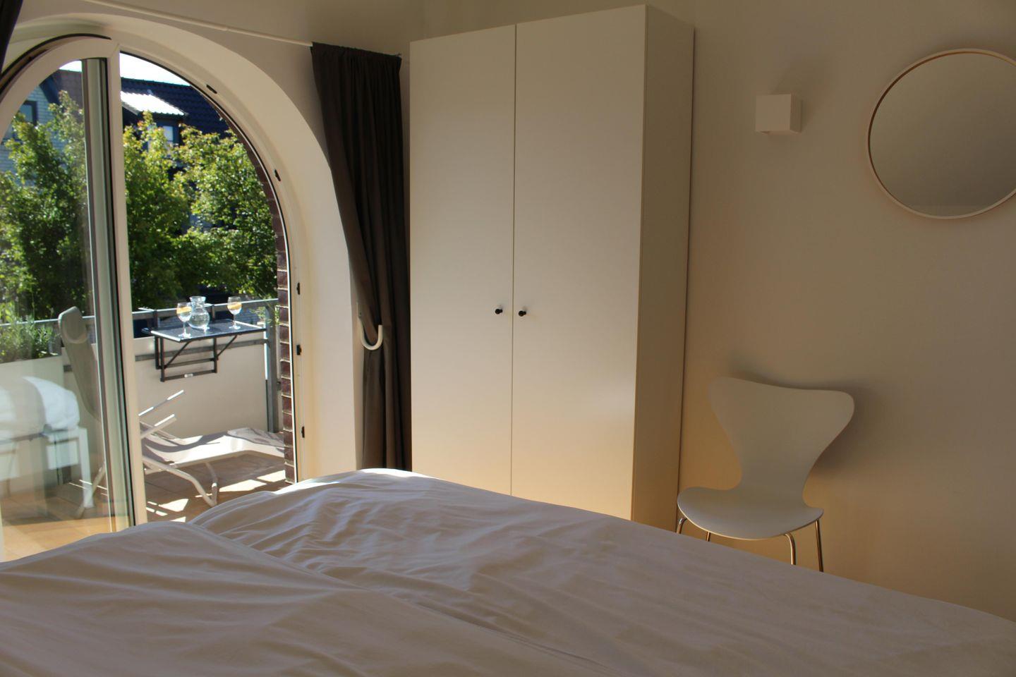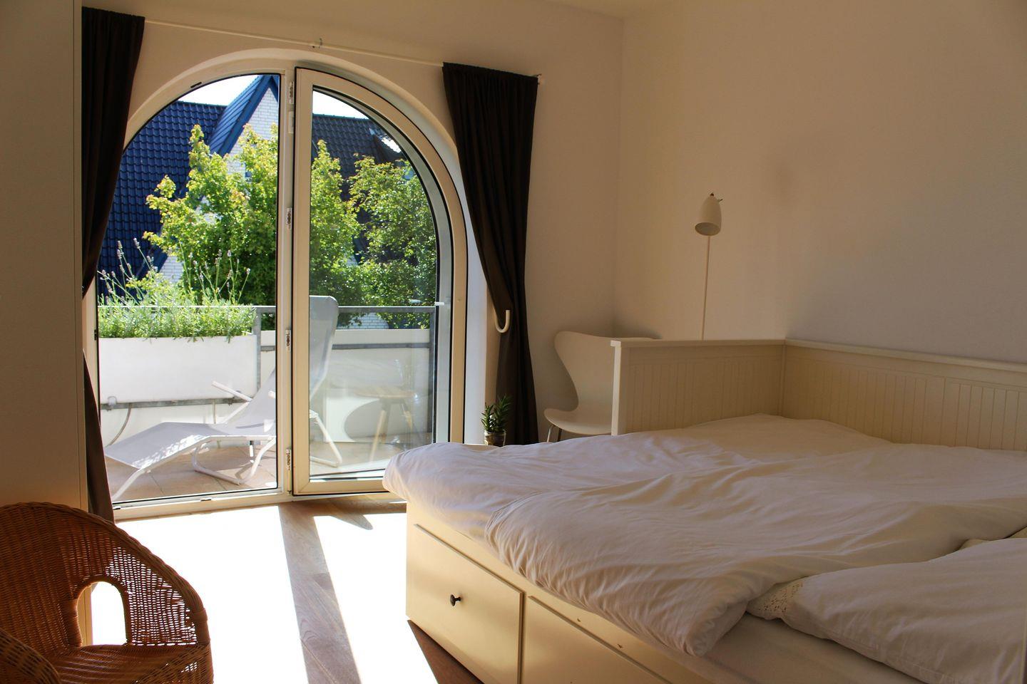 Von den Schlafzimmern erreichen Sie über ebenfalls große Designer-Rundbogentüren den Westbalkon, auf dem Sie die Nachmittagssonne auf 2 Liegen genießen können. Die Liegen können Sie gern mit an den Strand nehmen. Am Strand wartet weiterhin während der Saison ein Strandkorb auf Sie, der Ihnen während Ihres Urlaubs kostenlos zur Verfügung steht.