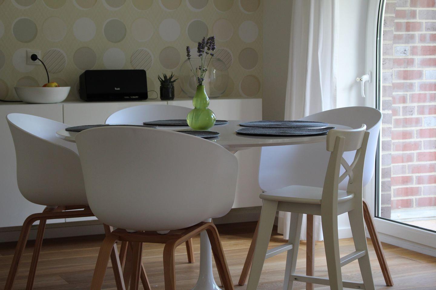 Der Essbereich ist mit einem Esstisch und vier Stühlen ausgestattet. Für die kleinen Gäste steht zudem ein Kinderhochstuhl, genannt Tripp Trapp, bereit. Hier können Sie gemeinsam Mahlzeiten einnehmen und gemütliche Stunden verbringen.