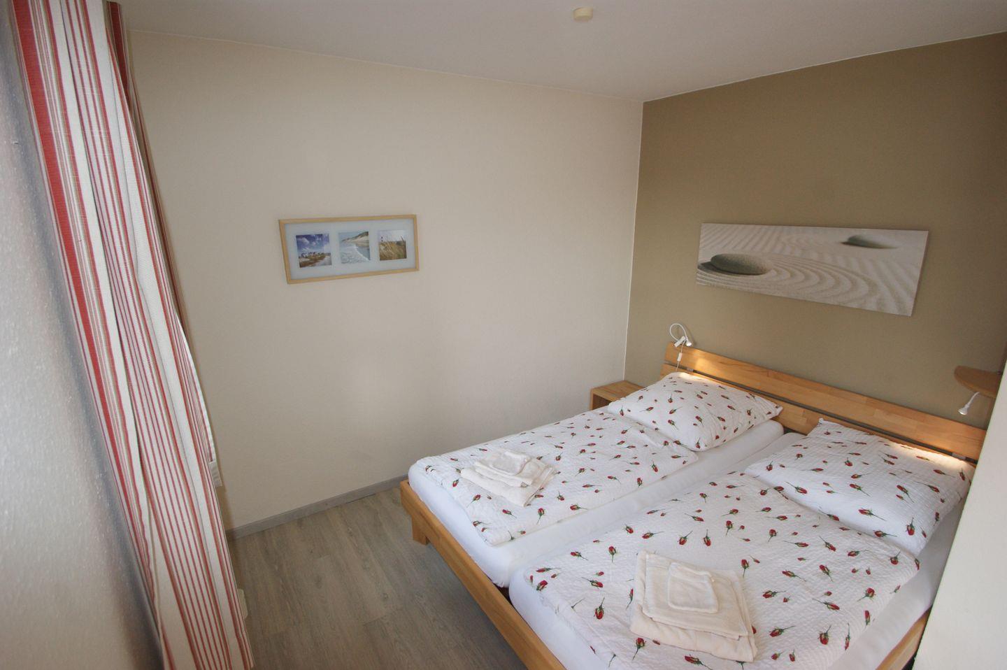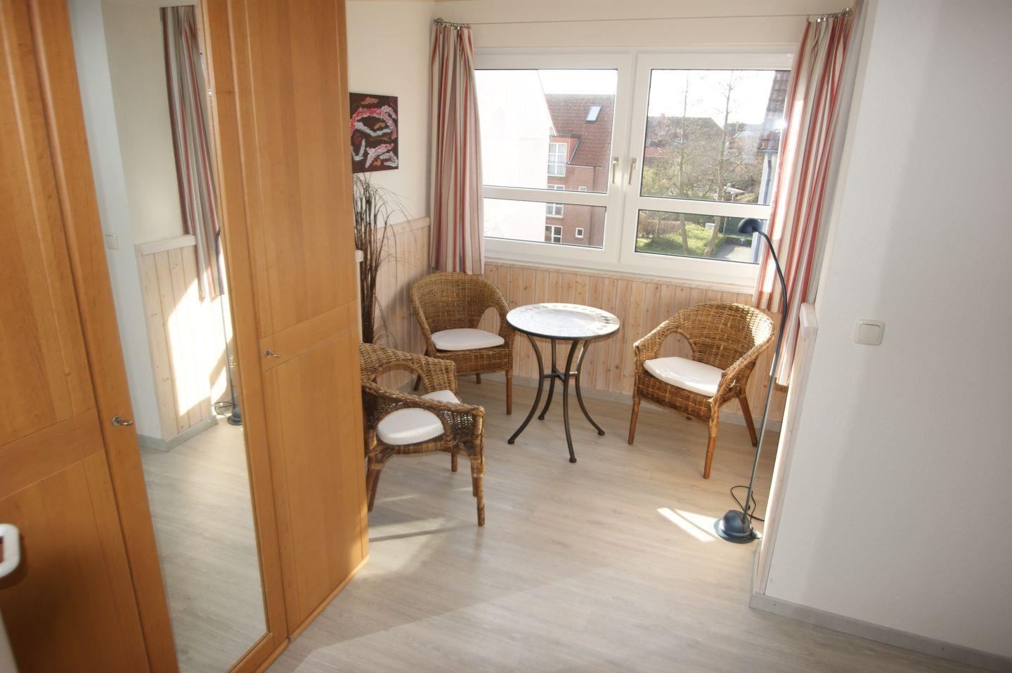Das Schlafzimmer verfügt über ein komfortables Doppelbett, einen großzügigen Kleiderschrank und eine gemütliche Sitzecke mit drei bequemen Korbstühlen in der Loggia. Hier können Sie sich zurücklehnen, ein Buch lesen und die frische Meeresbrise genießen.