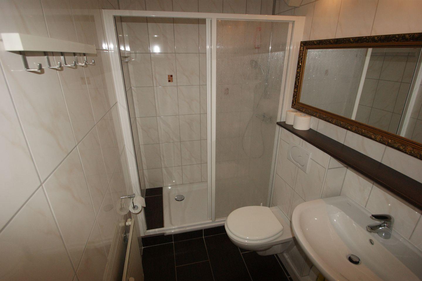Das moderne Badezimmer verfügt über eine erfrischende Dusche, ein WC, ein Waschbecken und einen Fön. Hier können Sie sich entspannen und erfrischen, bevor Sie sich ins Abenteuer stürzen.