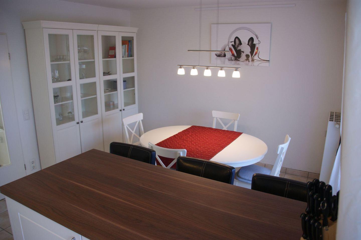 Beim Betreten der Wohnung werden Sie sofort von der geschmackvollen Inneneinrichtung beeindruckt sein. Die Einbauküche ist modern und komplett ausgestattet, mit einem Cerankochfeld, einem Hoch-Backofen, einer Mikrowelle, einer Spülmaschine, einem Kühlschrank mit Gefrierfach und allen weiteren Utensilien, die Sie zum Kochen benötigen. Ein Tresen mit drei Barstühlen lädt zu geselligen Kochabenden ein. Der offene Küchen- und Essbereich bietet einen Esstisch mit vier bequemen Stühlen, an dem Sie gemeinsame Mahlzeiten genießen können.
