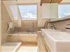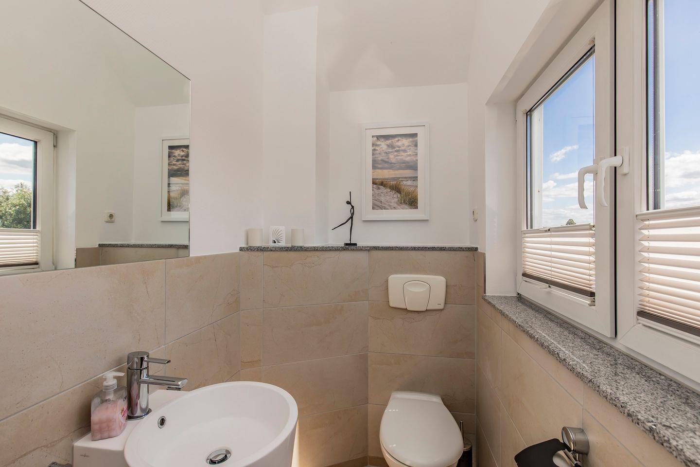 Das Badezimmer ist elegant gestaltet und verfügt über eine Badewanne, eine Dusche, eine Toilette und einen Fön. Zusätzlich gibt es ein Gäste-WC im Dachgeschoss für Ihre Bequemlichkeit.