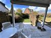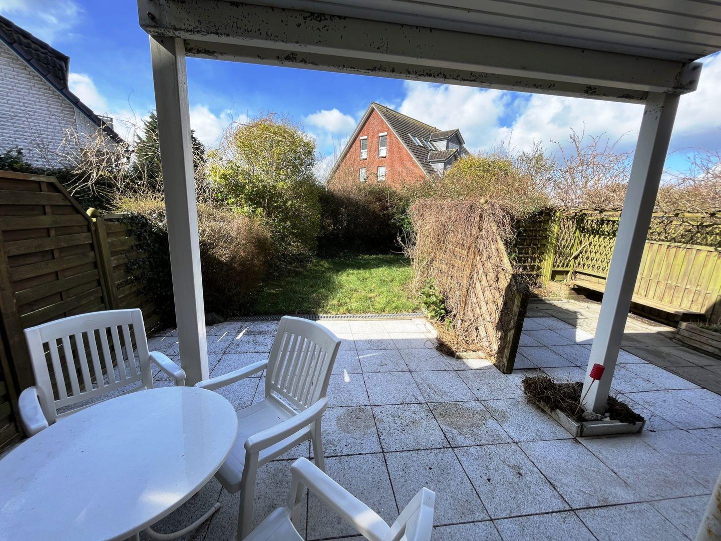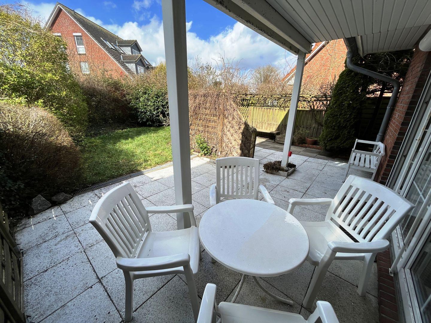 Außenausstattung: möblierte Terrasse, PKW-Stellplatz und ein Carport mit Abstellmöglichkeiten für das Auto und Fahrräder