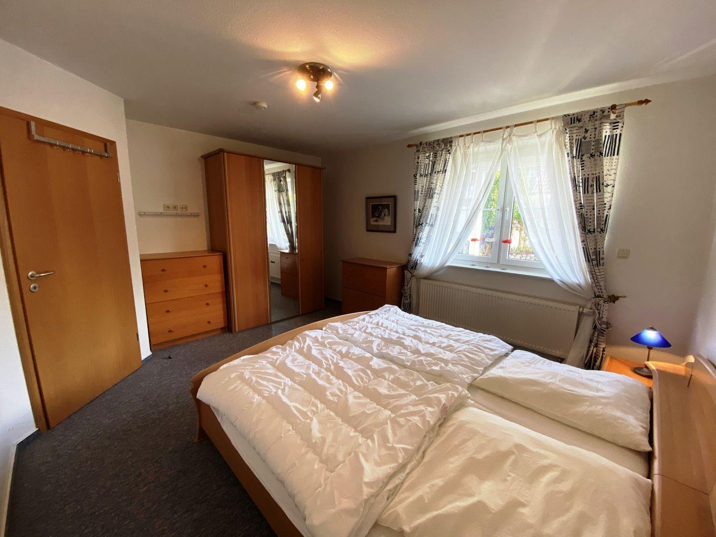 Schlafzimmer: Doppelbett (1,80 x 2 m - 2 Matratzen), Kleiderschrank, Kommoden mit Leselampen, Außenjalousie