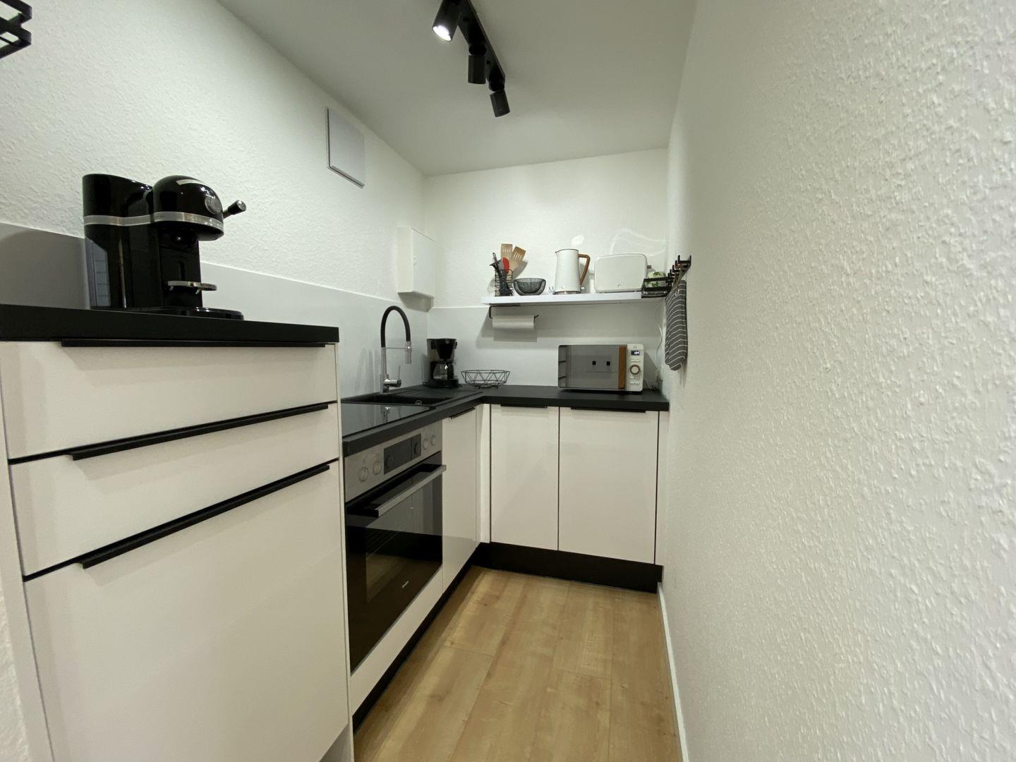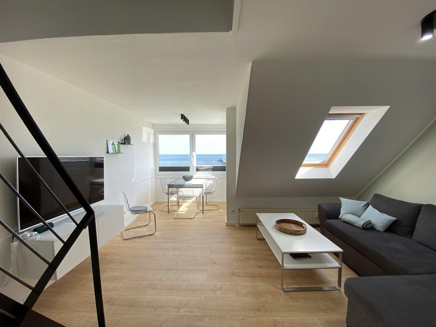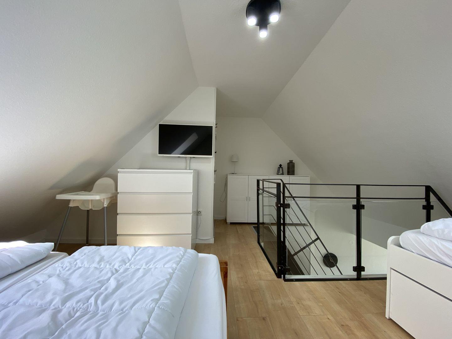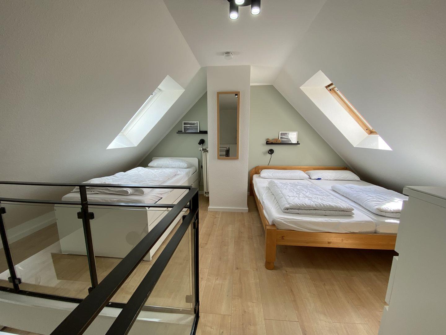 Die Ferienwohnung besteht aus insgesamt drei Zimmern, darunter zwei behagliche Schlafzimmer, die mit liebevollen Details und ausreichend Stauraum ausgestattet sind. Ein helles und einladendes Wohnzimmer bietet mit einer gemütlichen Sofaecke viel Platz zum Entspannen, Spielen oder einfach zum gemeinsamen Verweilen. Ein Esstisch lädt zu gemeinsamen Mahlzeiten ein, die Sie in der gut ausgestatteten Kochnische zubereiten können. Hier finden Sie alles, was Sie für einen kulinarischen Abend benötigen, von der Spülmaschine über den Herd bis zur Mikrowelle.