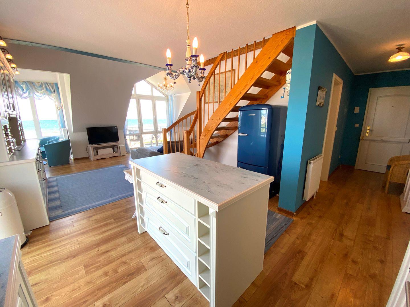 Diese exklusive Ferienwohnung in erster Reihe hinter dem Deich bietet einen unvergleichlichen Blick auf das Meer aus fast allen Räumen und verspricht höchsten Wohnkomfort über zwei Etagen mit behaglichem Kamin, voll ausgestatteter Küche sowie zwei Schlaf- und Badezimmern.