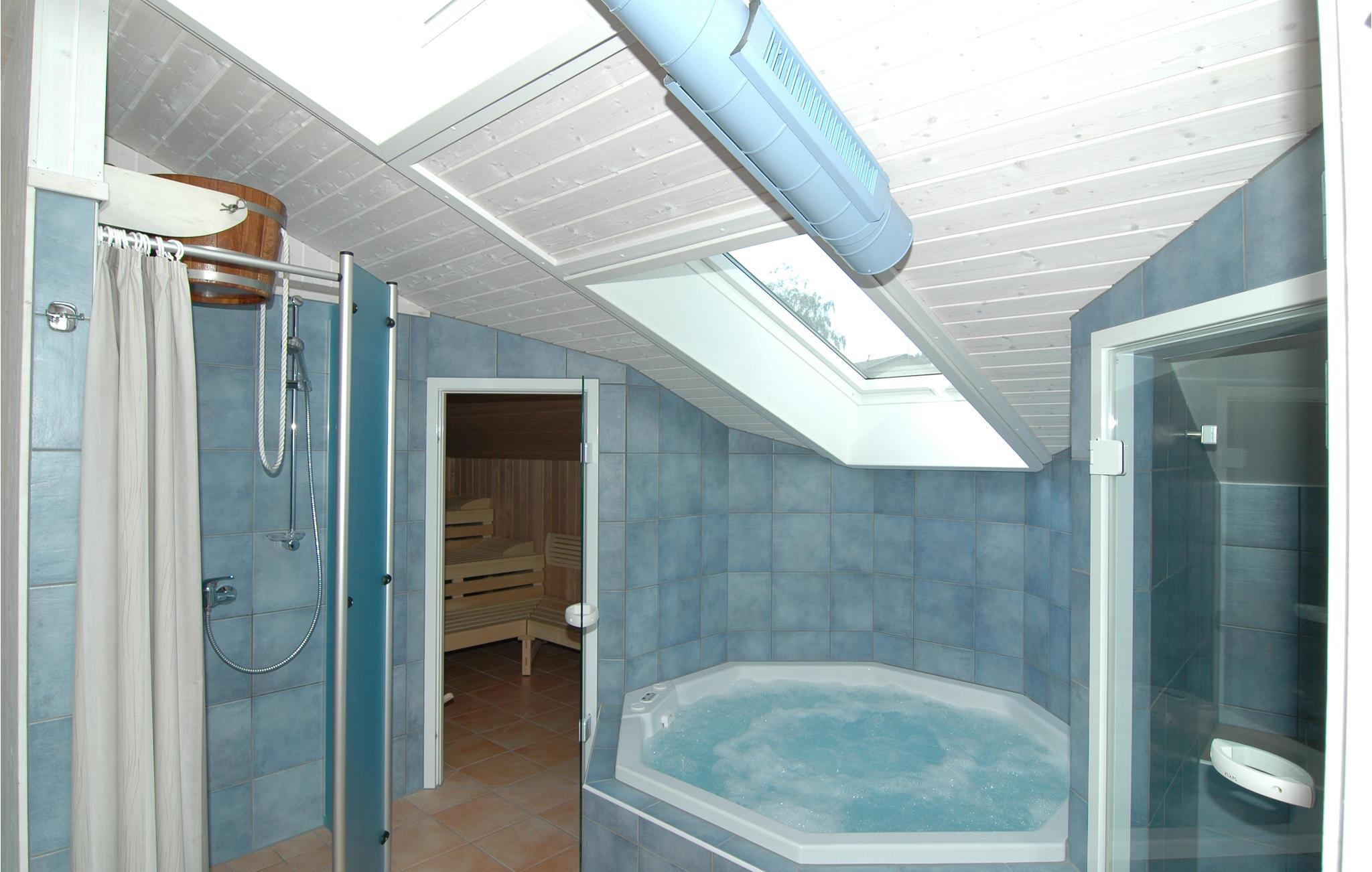 Med et tryk på en knap kan I vælge mellem klassisk sauna, tropebad, soft-dampbad, aromabad eller varmluftsbad. Den gode oplevelse understøttes af et specielt 'lyd- og farvevandfald'. Bagefter anbefaler vi et koldt brusebad og en pause på hvile- og massagebænken. Prøv også stenfeltet på gulvet, der benyttes til zoneterapi eller tag et bad i det sprudlende 5-personers spabad.