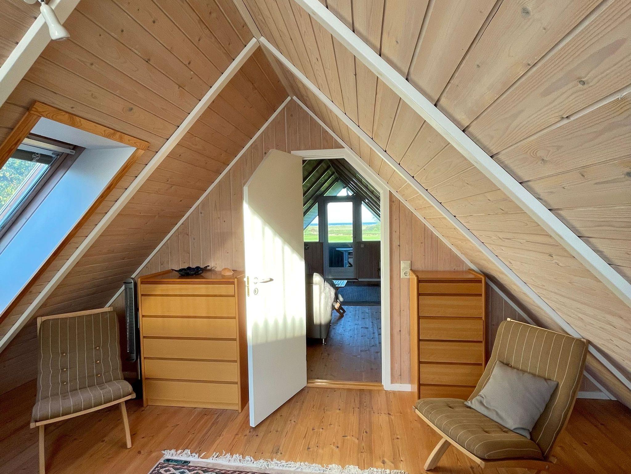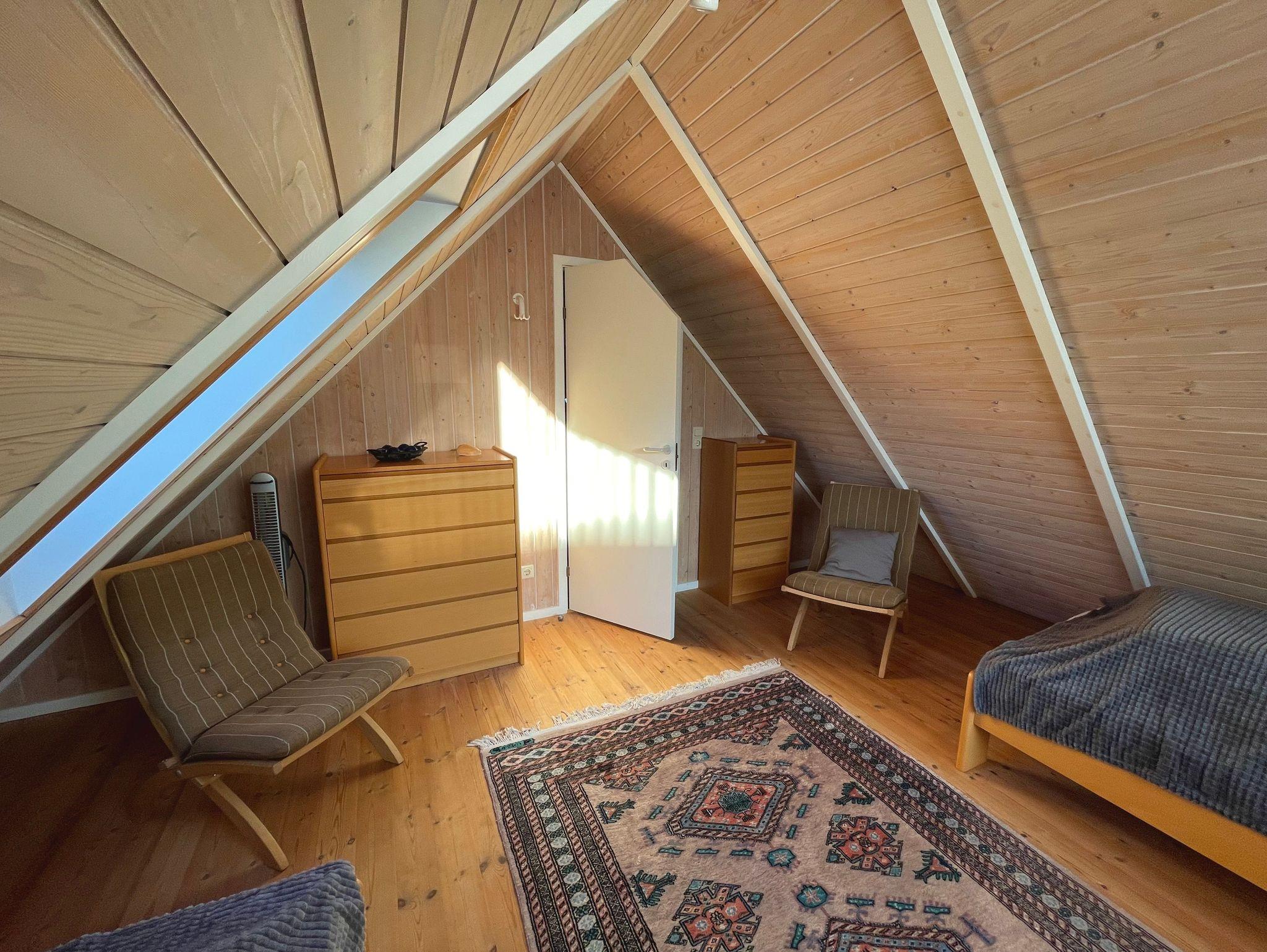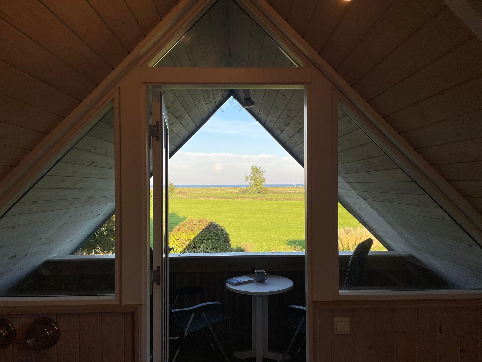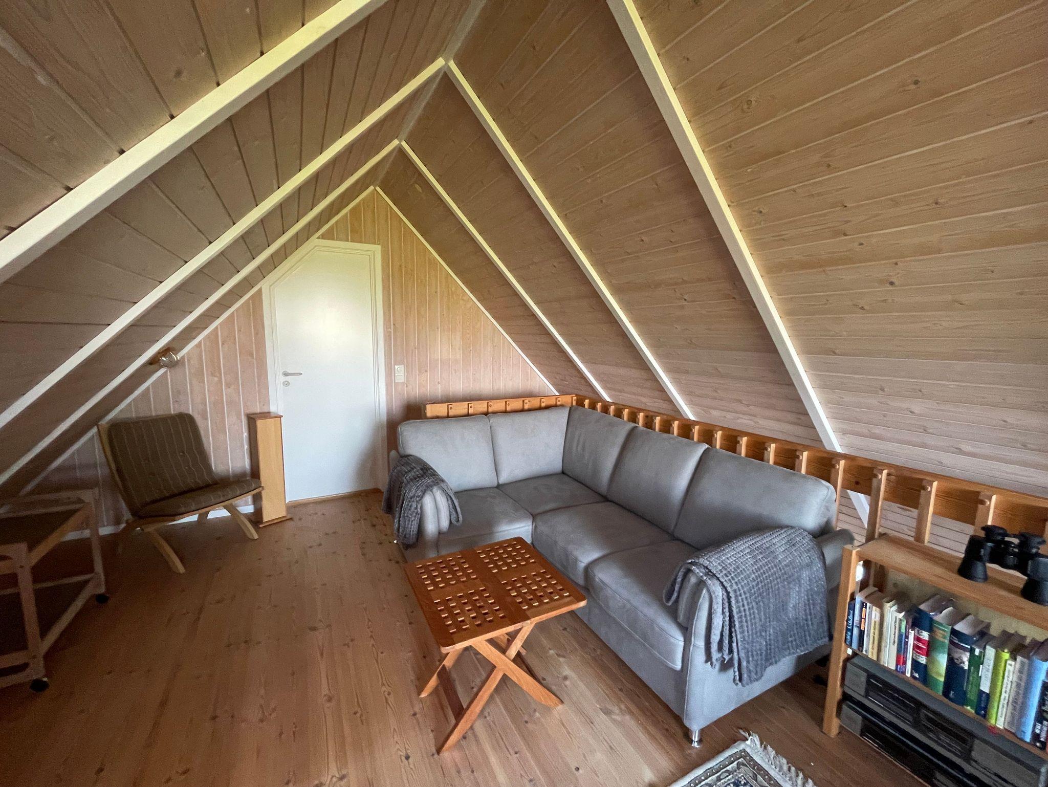 Vom Wohnbereich führt eine offene Treppe ins Obergeschoß. Dort erwartet sie ein zweites Schlafzimmer mit zwei getrennt stehenden Betten sowie zwei Kommoden und ein weiteres Wohnzimmer, von dem Sie auf den kleinen, möblierten Balkon gelangen. Dort genießen Sie die Ruhe und einen fantastischen Blick über die Felder zur Ostsee. In dem 2. Wohnbereich gibt es ebenfalls ein TV-Gerät.