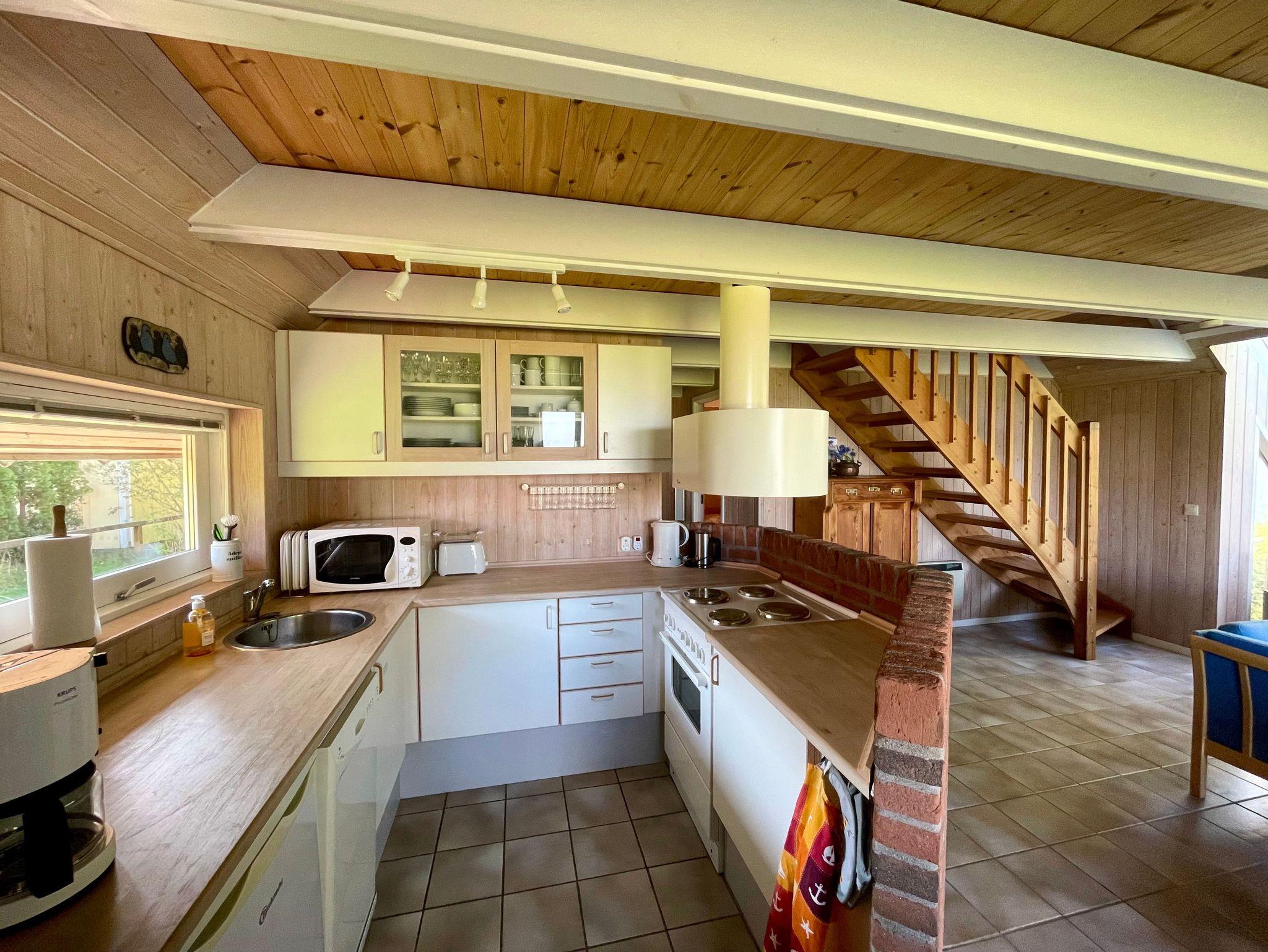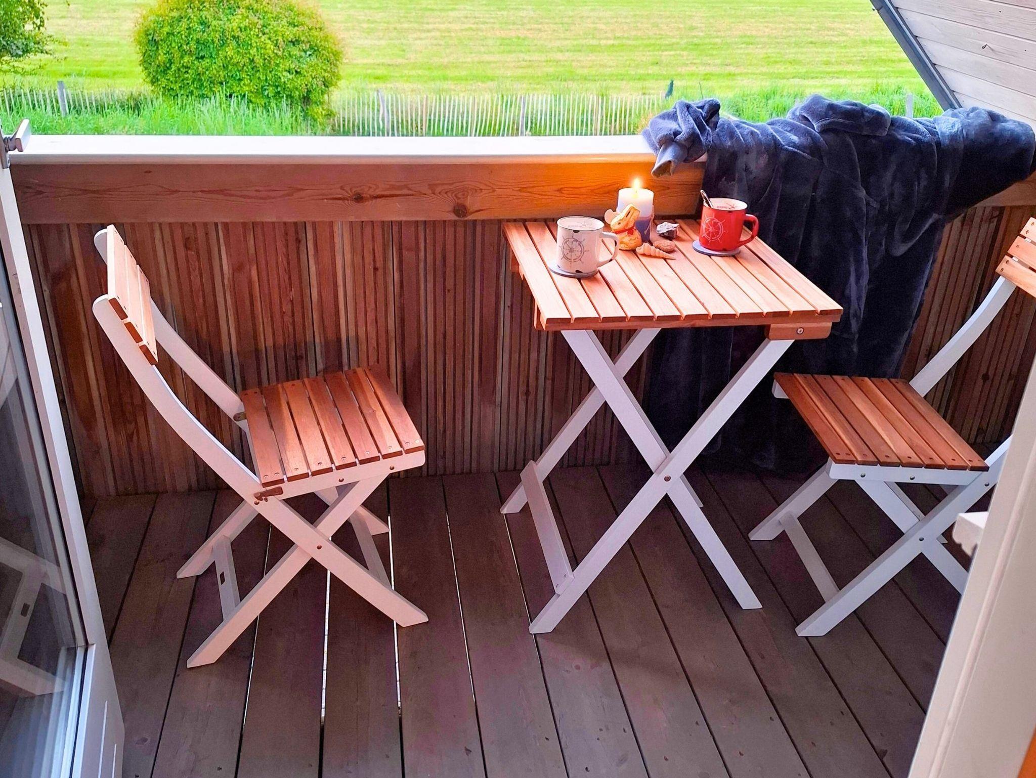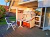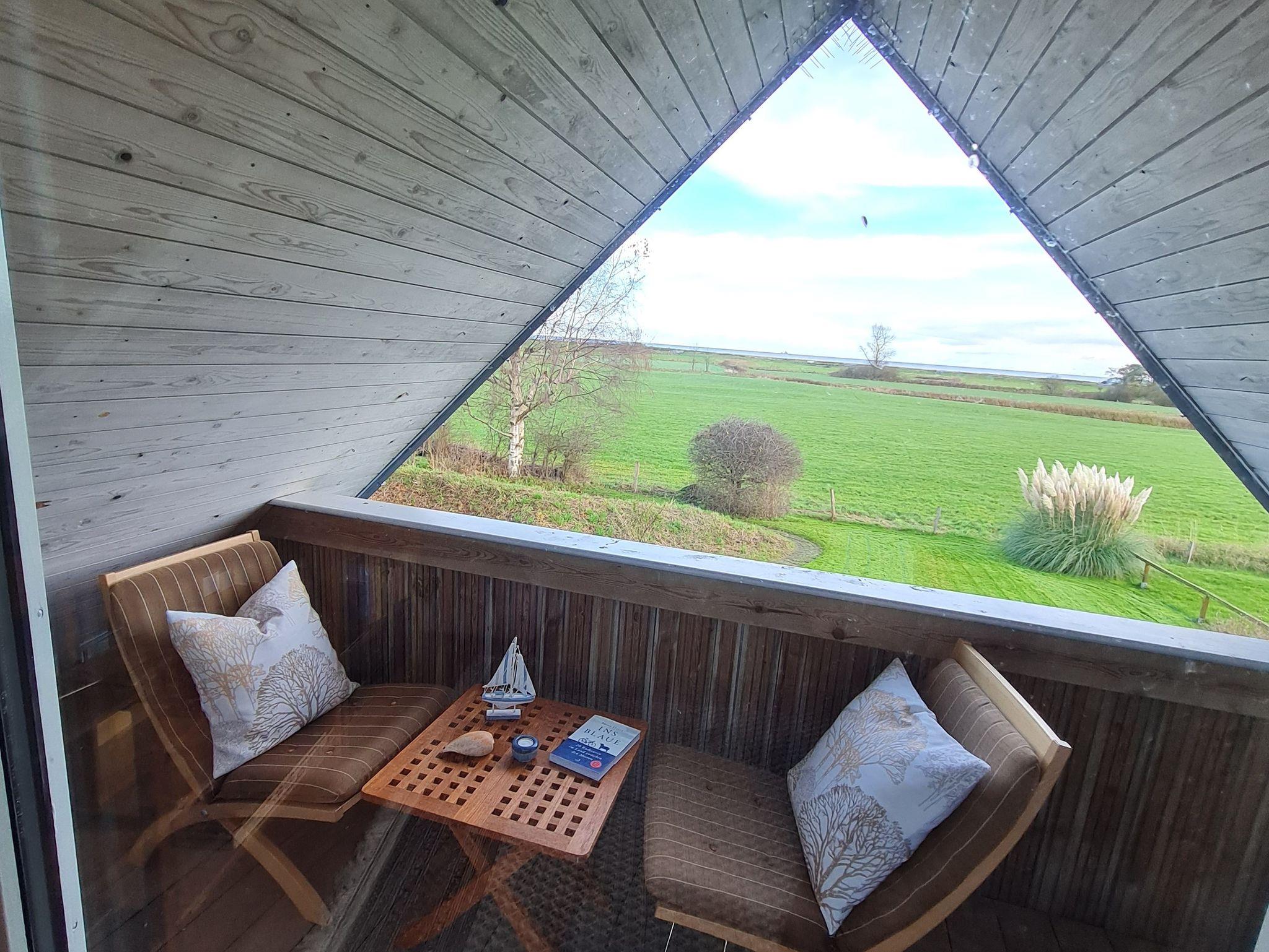 Vom Wohnbereich führt eine offene Treppe ins Obergeschoß. Dort erwartet sie ein zweites Schlafzimmer mit zwei getrennt stehenden Betten sowie zwei Kommoden und ein weiteres Wohnzimmer, von dem Sie auf den kleinen, möblierten Balkon gelangen. Dort genießen Sie die Ruhe und einen fantastischen Blick über die Felder zur Ostsee. In dem 2. Wohnbereich gibt es ebenfalls ein TV-Gerät.