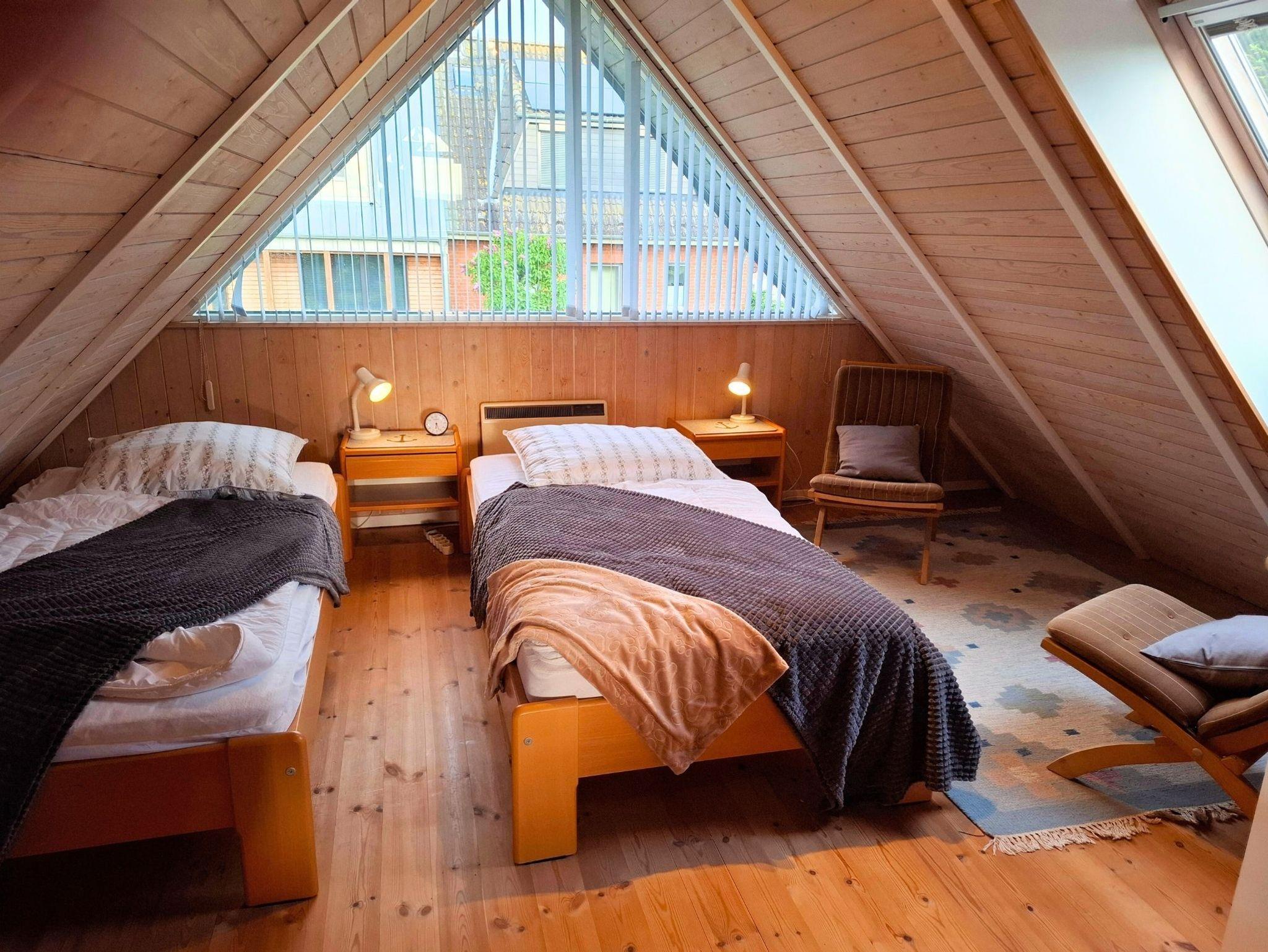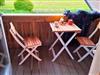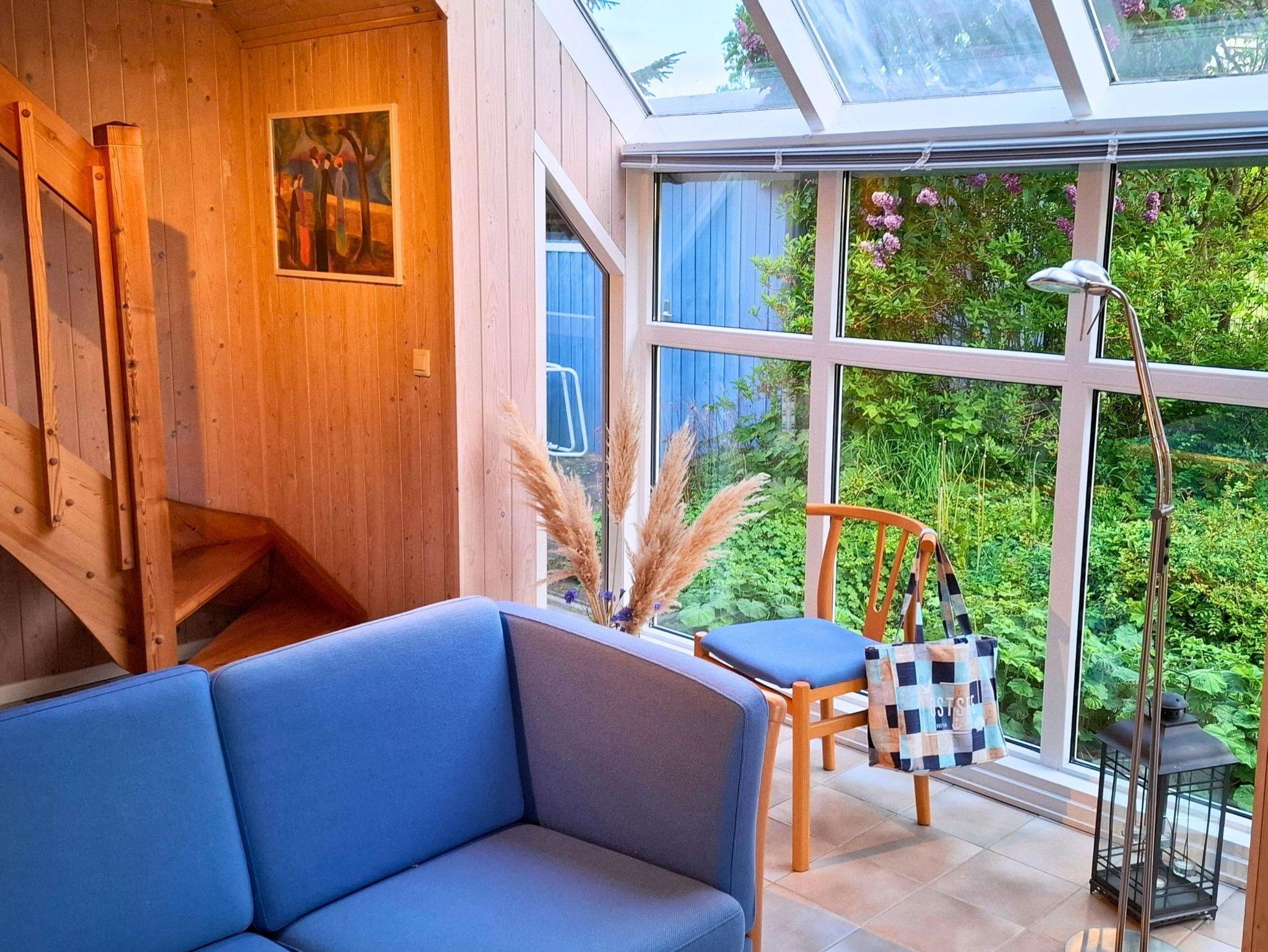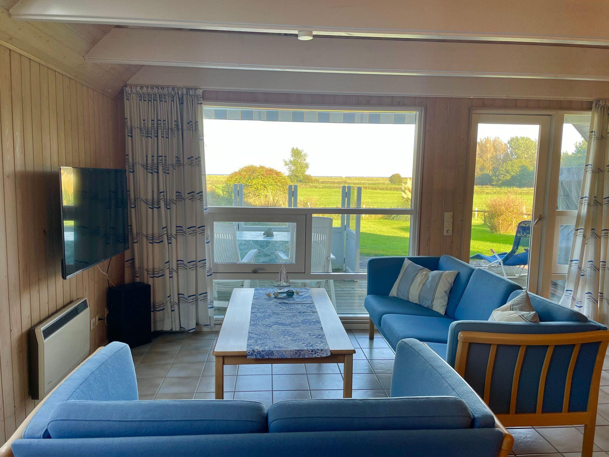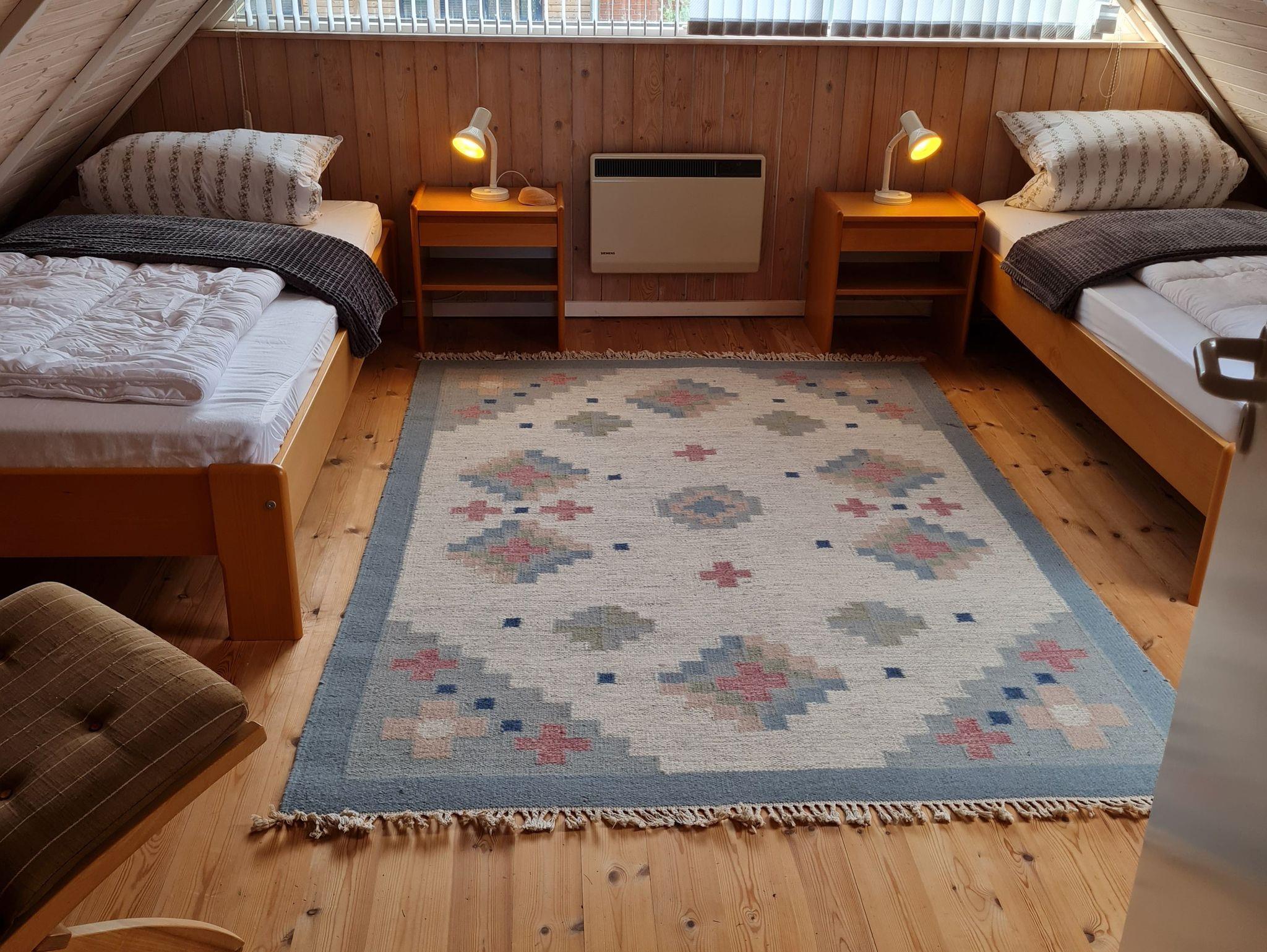 Vom Wohnbereich führt eine offene Treppe ins Obergeschoß. Dort erwartet sie ein zweites Schlafzimmer mit zwei getrennt stehenden Betten sowie zwei Kommoden und ein weiteres Wohnzimmer, von dem Sie auf den kleinen, möblierten Balkon gelangen. Dort genießen Sie die Ruhe und einen fantastischen Blick über die Felder zur Ostsee. In dem 2. Wohnbereich gibt es ebenfalls ein TV-Gerät.