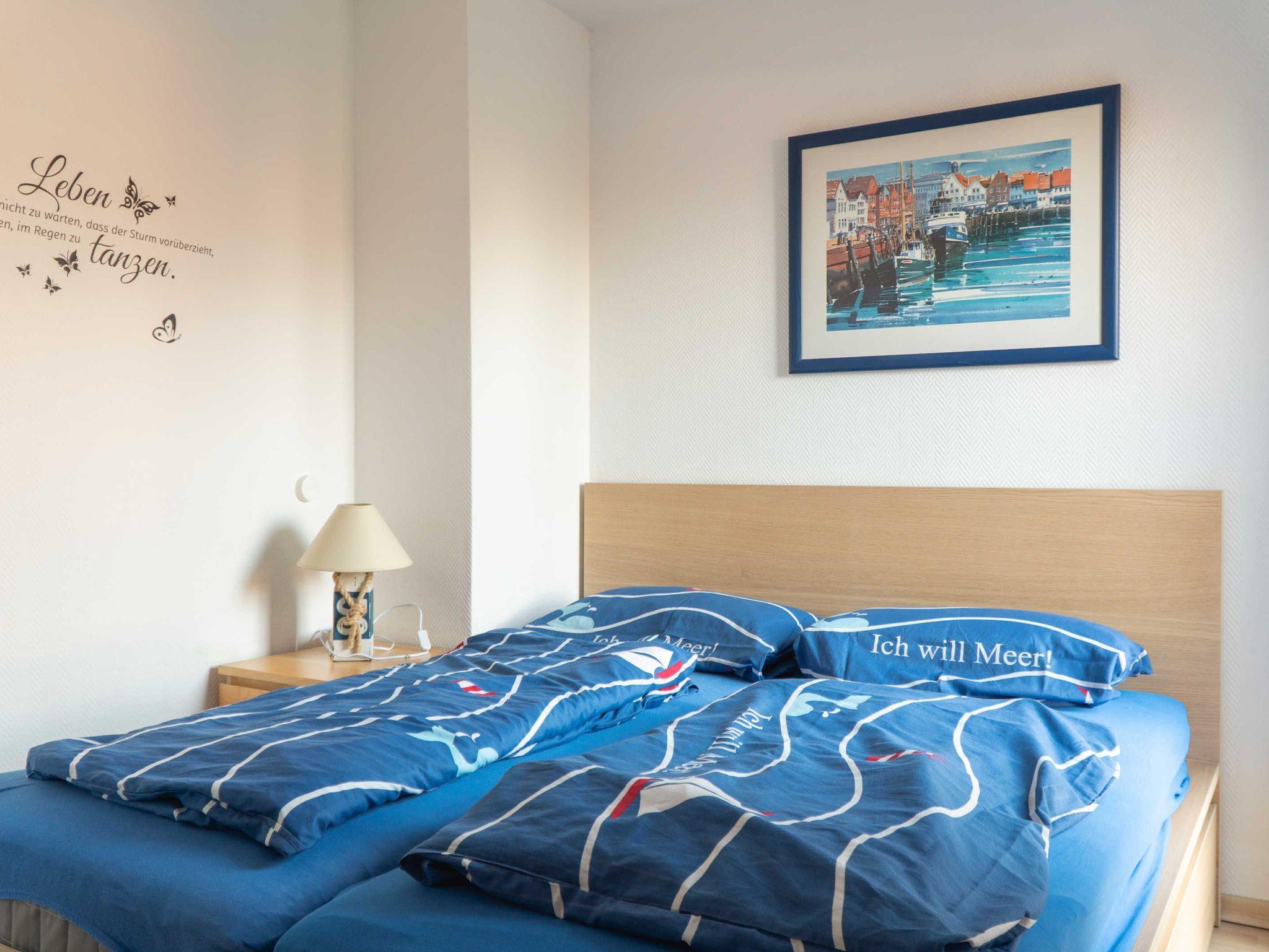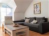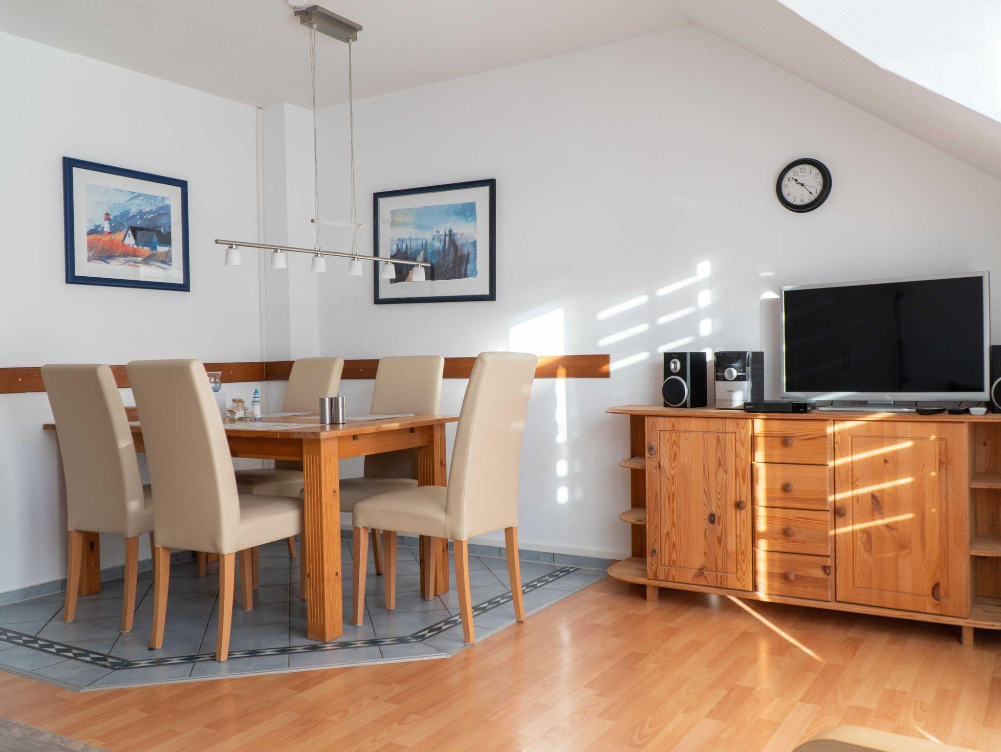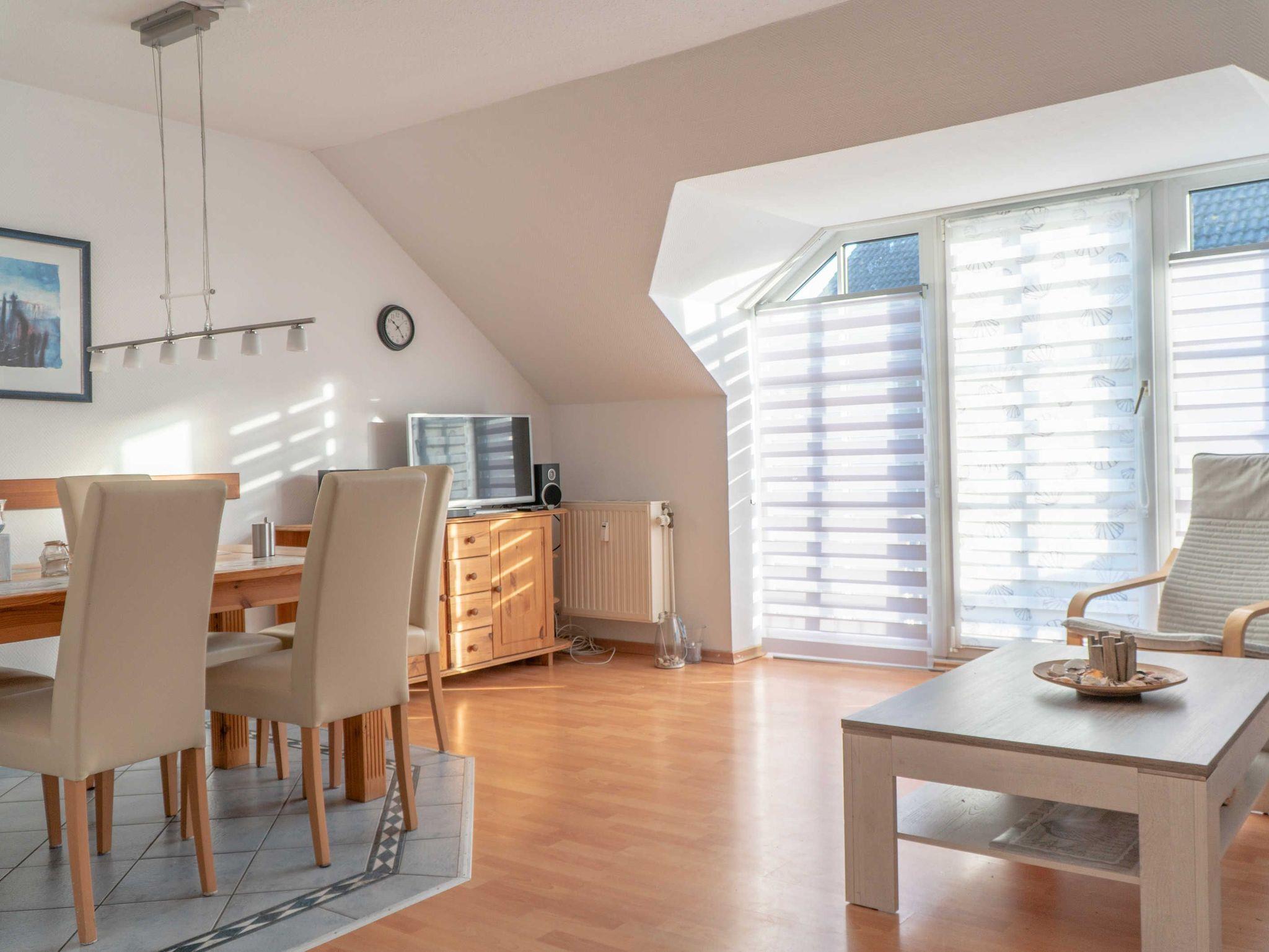 Ein großzügiges lichtdurchflutetes Wohnzimmer mit Essbereich für 5 Personen, Flachbildfernseher und DVD-Player ist das Herzstück der Ferienwohnung. Von hier haben Sie Zugang auf den zur Meerseite gelegenen Balkon, auf dem Sie beim Frühstück die ersten Sonnenstrahlen genießen oder den perfekten Urlaubstag ausklingen lassen können.