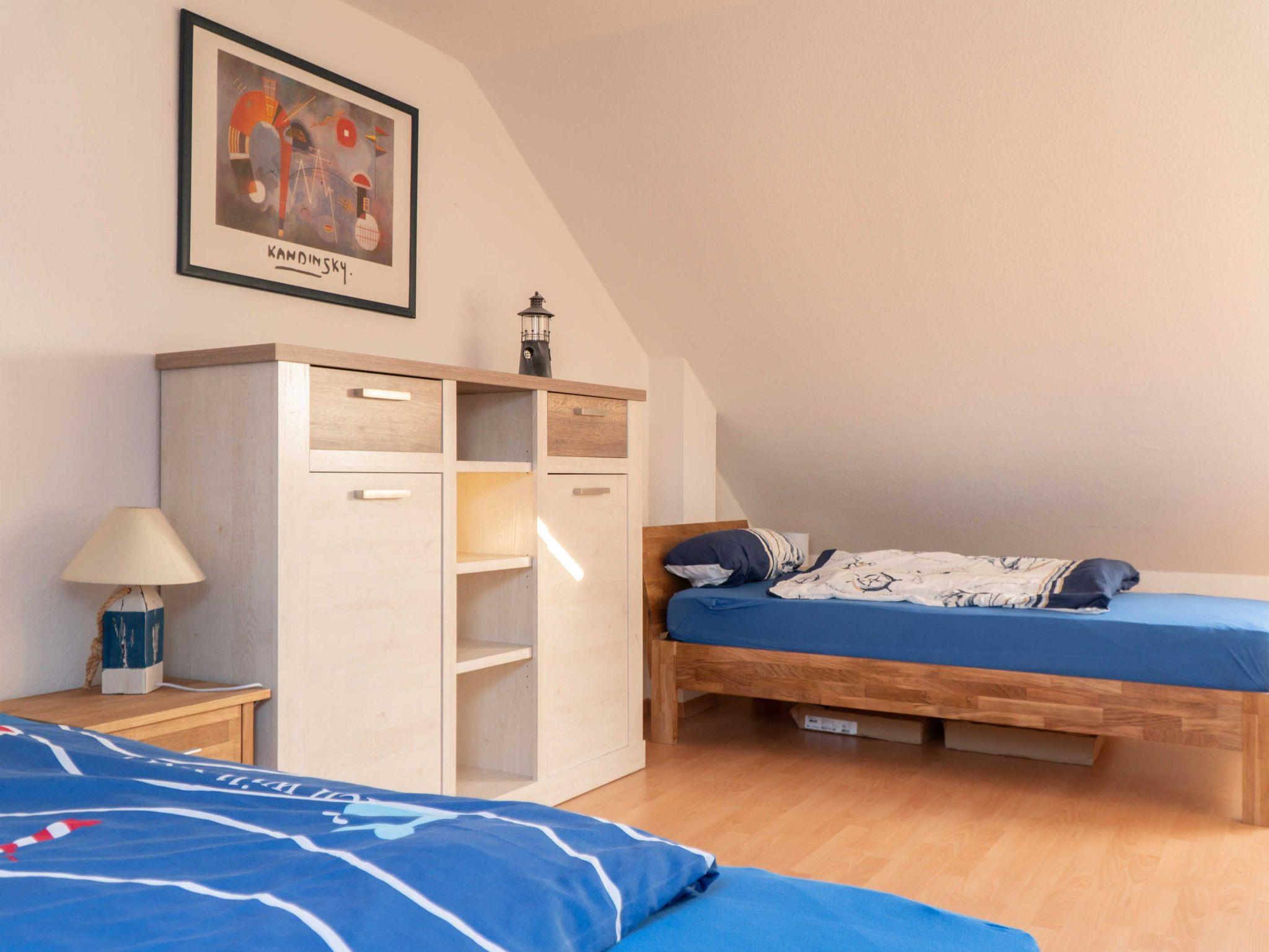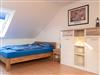 Eine Holztreppe führt in das helle Obergeschoss, in dem sich ein Raum mit drei weiteren Schlafgelegenheiten (1 Doppelbett 1,80m x 2m und 1 Einzelbett 1m x 2m) befindet. Ein Schreibtisch sowie ein zweites TV-Gerät mit DVD runden das Angebot ab. Auch hier steht Ihnen ausreichend Stauraum in einem begehbaren Kleiderschrank sowie einer Kommode zur Verfügung. Elektrische Verdunkelungsrollos ermöglichen einen ruhigen Schlaf.