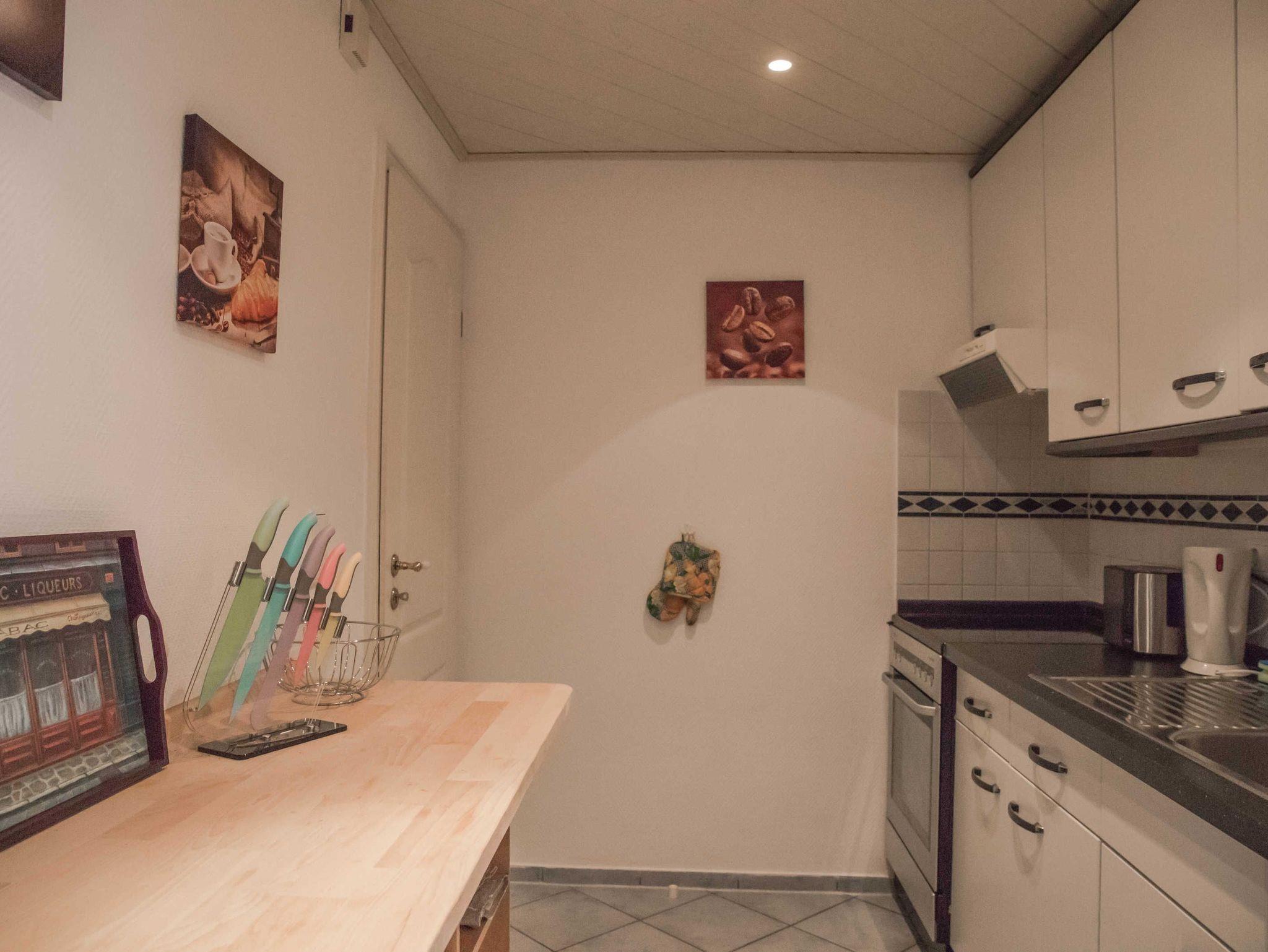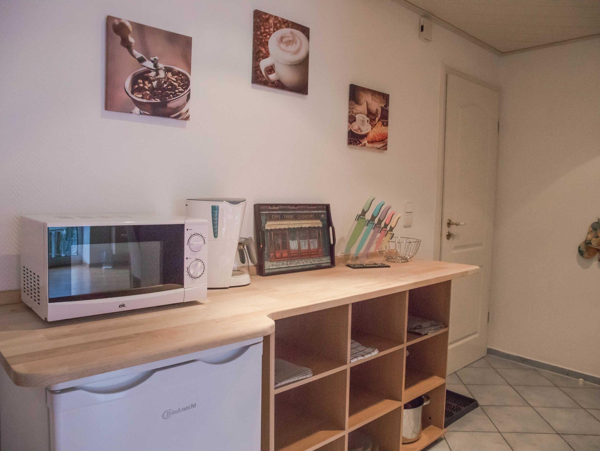 Sie betreten die Ferienwohnung durch die offene Küchenzeile, die mit reichlich Geschirr (auch für Kinder) und Gläsern, Herd mit Ofen, Wasserkocher, Kaffeemaschine, Eierkocher, Mikrowelle, Kontaktgrill, Sandwichmaker, Waffeleisen, Kühlschrank mit Gefrierfach und Geschirrspülmaschine ausgestattet ist.