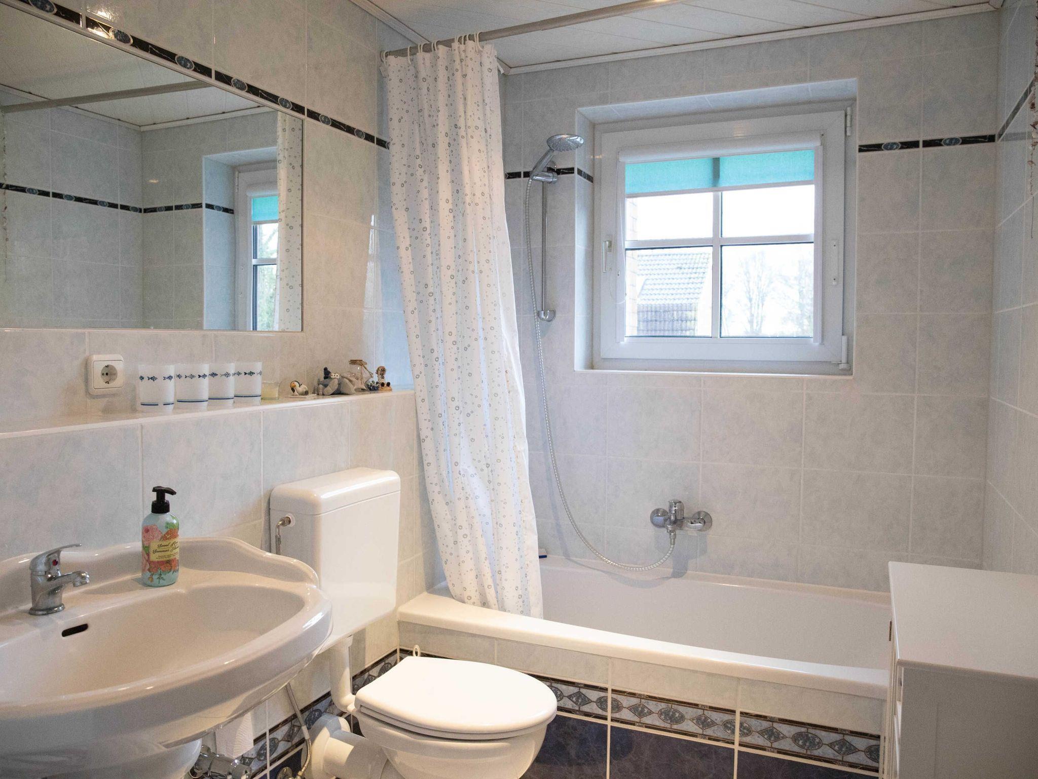 Das Badezimmer mit Tageslicht verfügt neben dem WC und Waschbecken über eine Badewanne mit Regenduschkopf sowie einen kleinen Schrank für Ihre Badutensilien. Ein Fön liegt hier für Sie bereit.