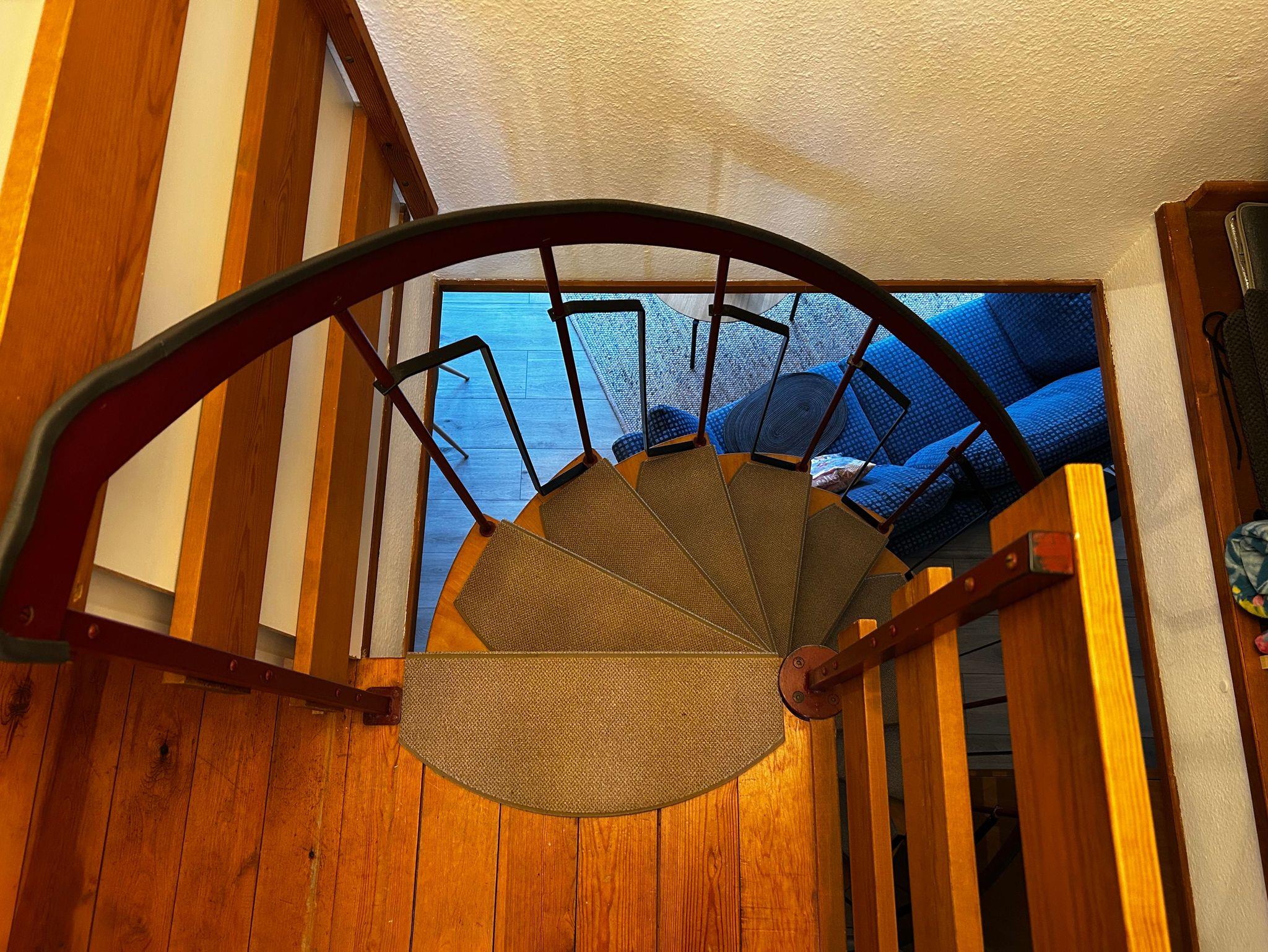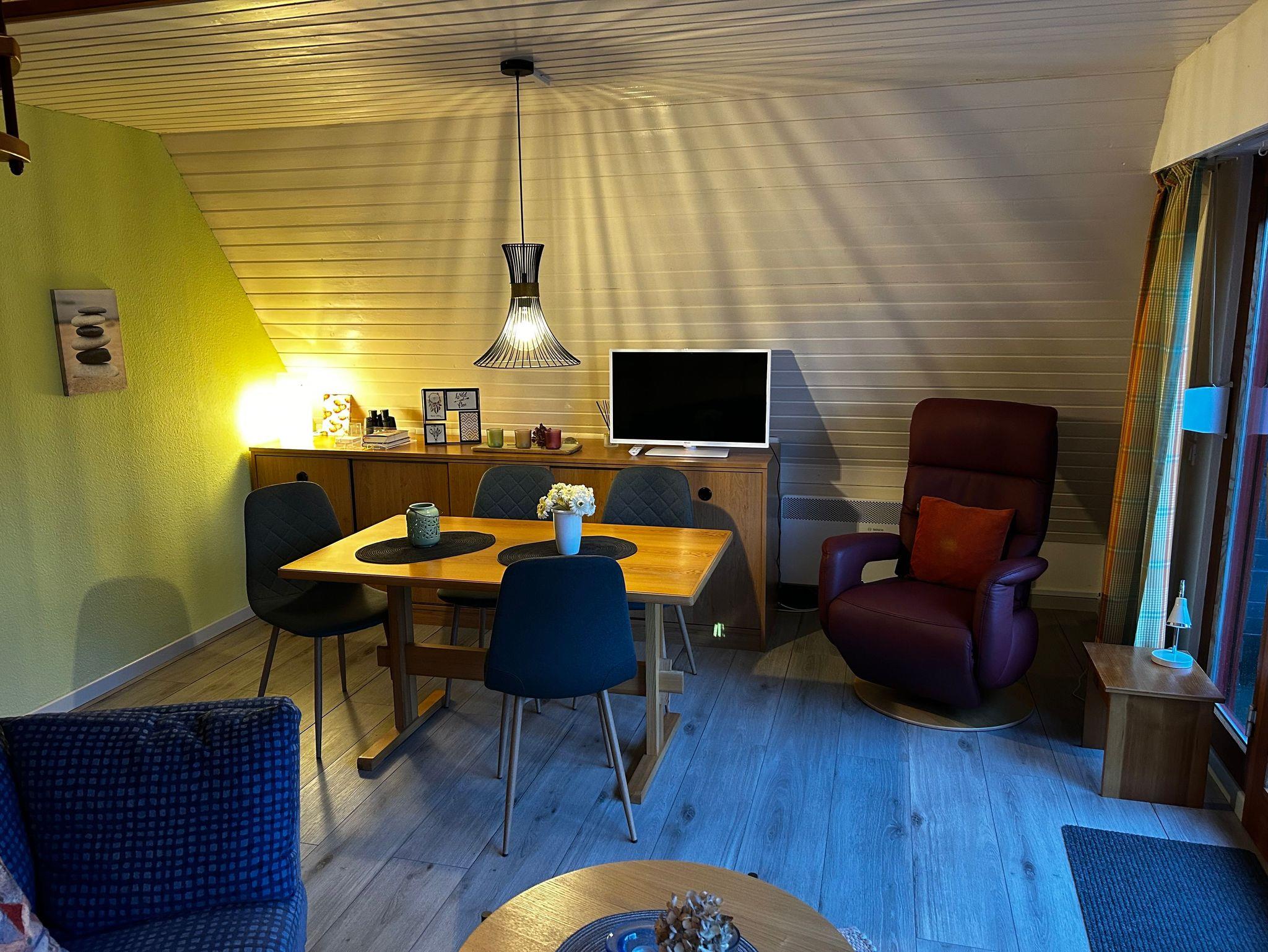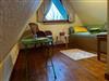 Eine Wendeltreppe führt vom Wohnzimmer aus in das Dachgeschoss, wo sich ein Schlafzimmer mit 2 Einzelbetten (je 90 cm) befindet. Ein kleines Zimmer mit Couch und Sitzecke ist zur Gartenseite gelegen.