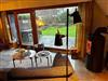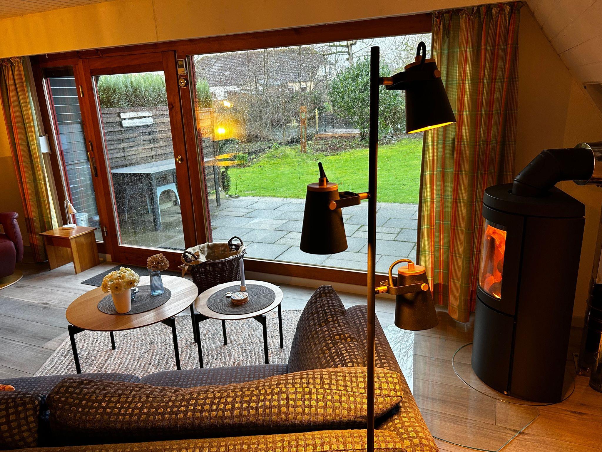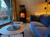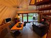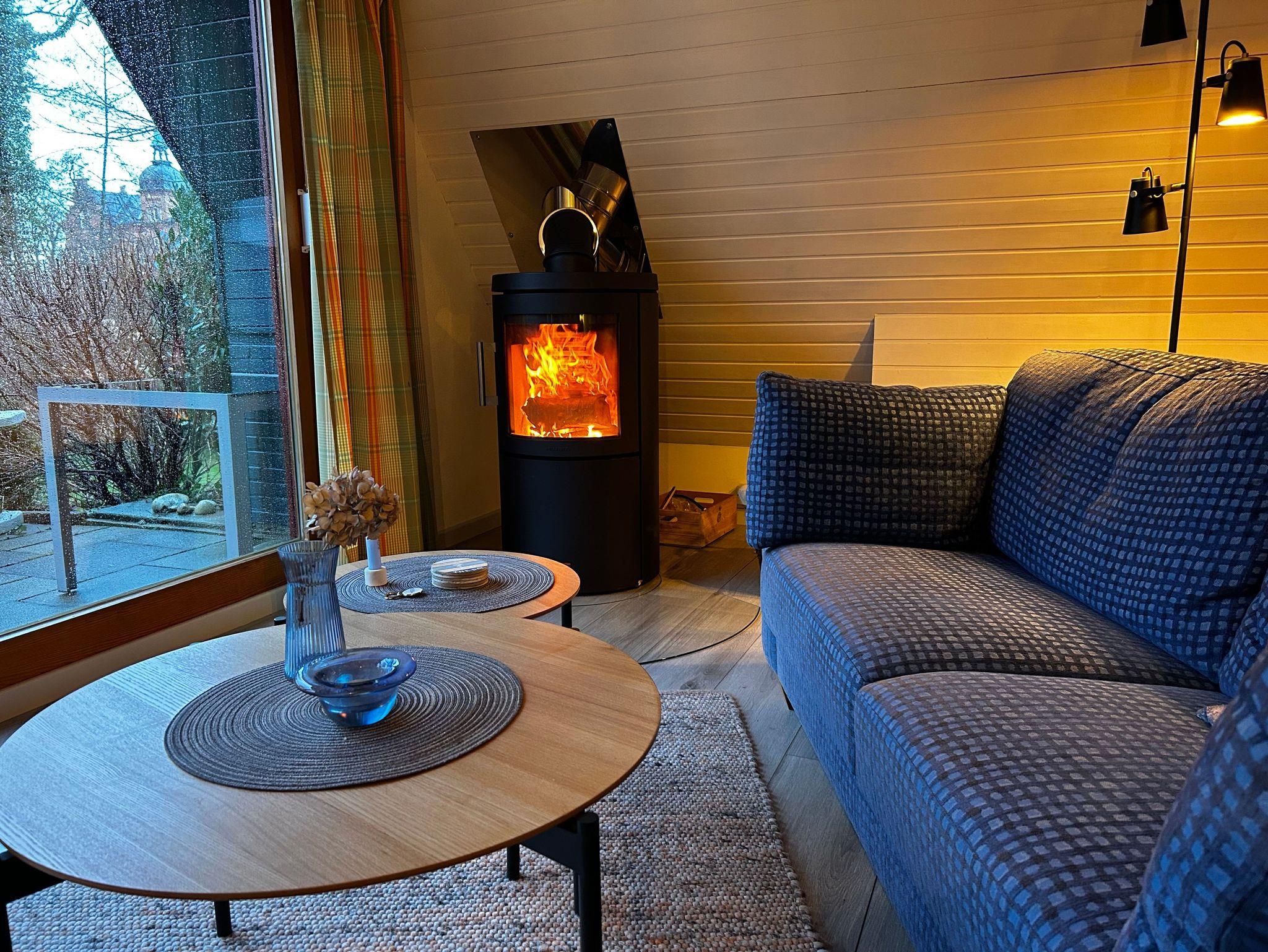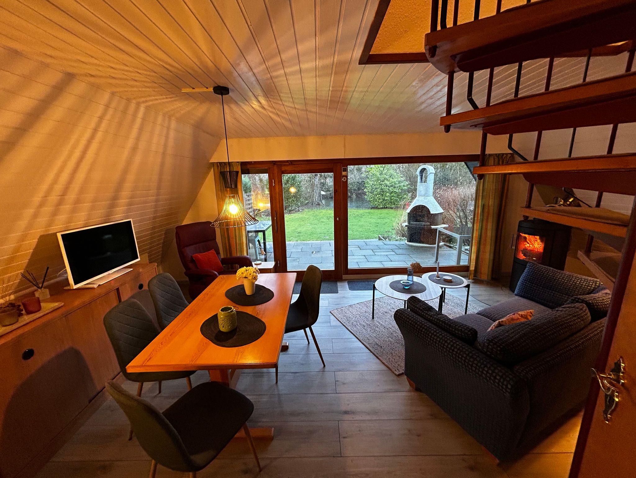 Im Eingangsbereich befinden sich eine Garderobe und eine Küchenzeile. Sie gelangen in das geräumige Wohnzimmer mit einer Essecke, dem Relaxsessel und einer Couchgarnitur vor dem Kamin. Von hier aus hat man einen herrlichen Ausblick in den Garten und auf die Teichterrasse bis hin zum Schloss. Eine Anrichte mit einem Flachbildfernseher sowie ein Wandschrank dienen als Aufbewahrungsmöglichkeit für Garderobe u.a.