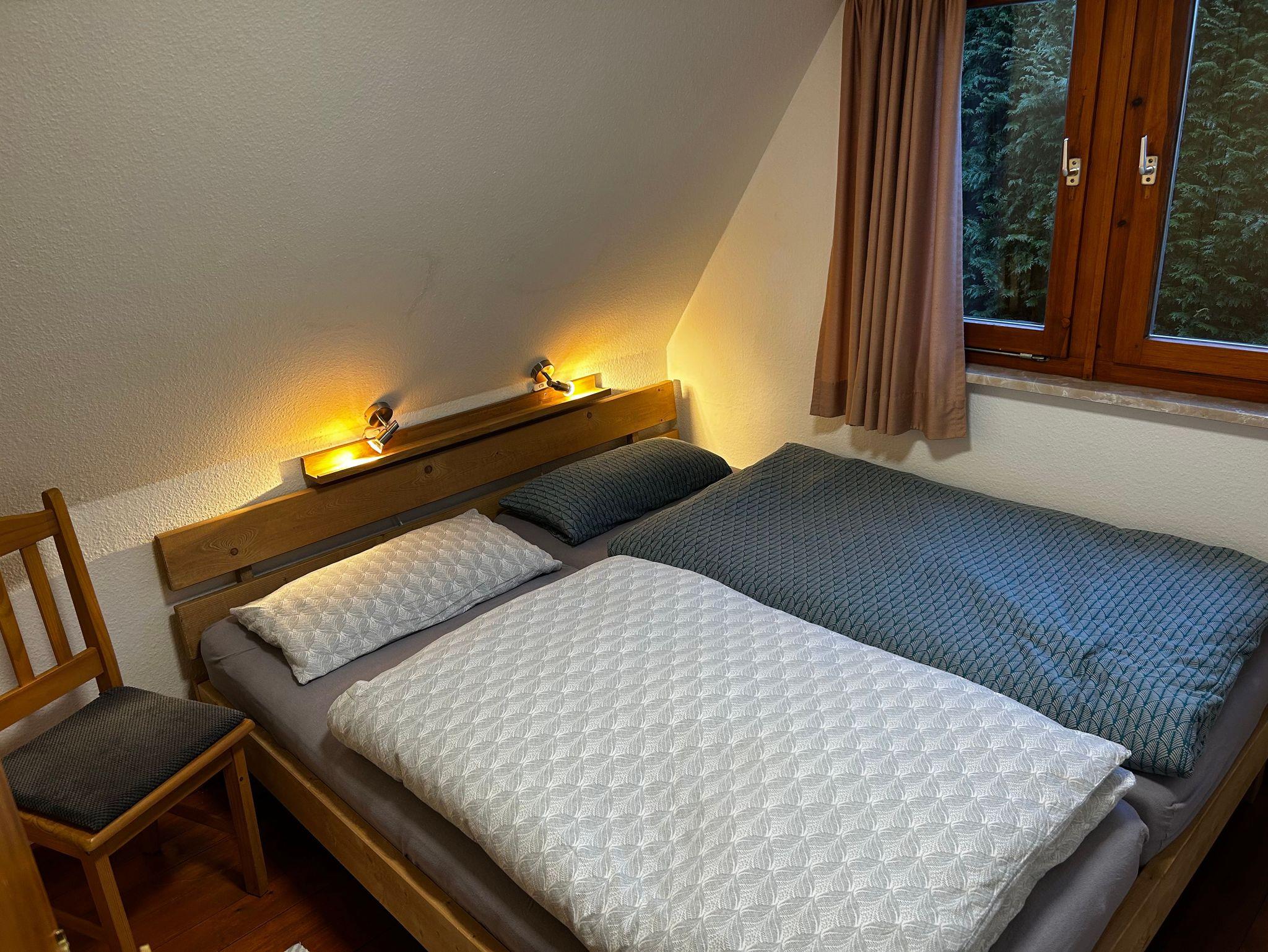 Das Schlafzimmer im Erdgeschoss ist mit einem Doppelbett (1.80m x 2.00m) und einem Wandschrank ausgestattet. Gegenüber dem Schlafzimmer kommt man in das Bad mit Dusche und WC.