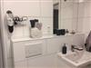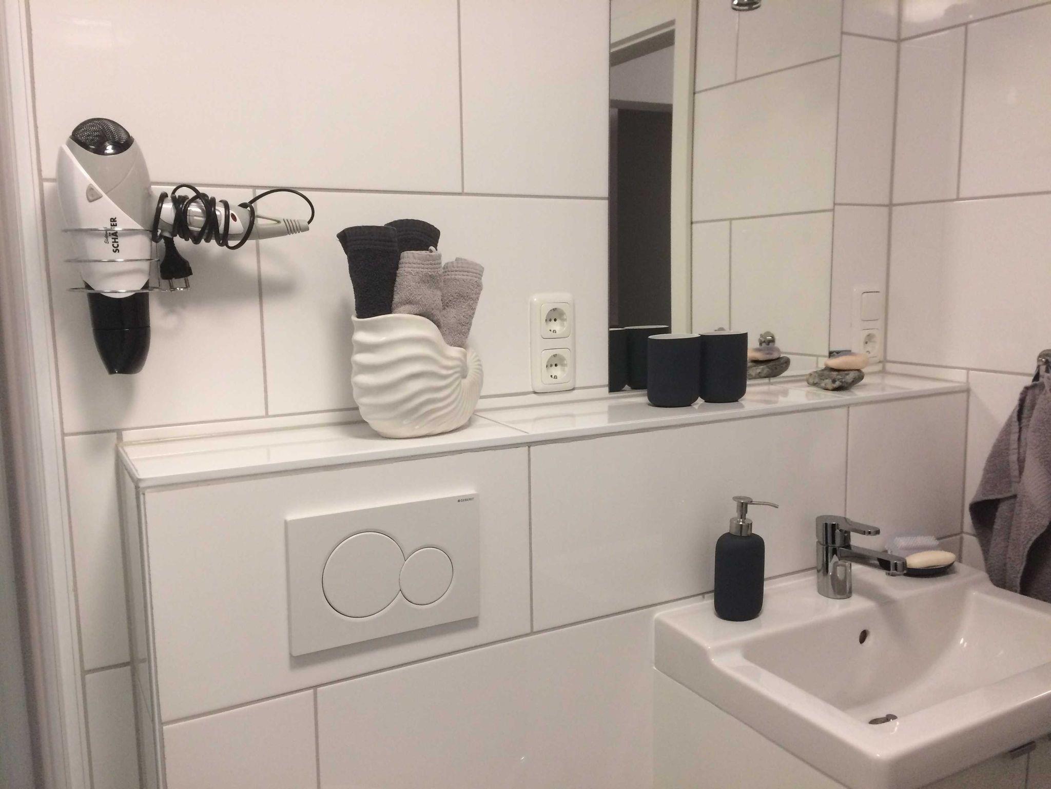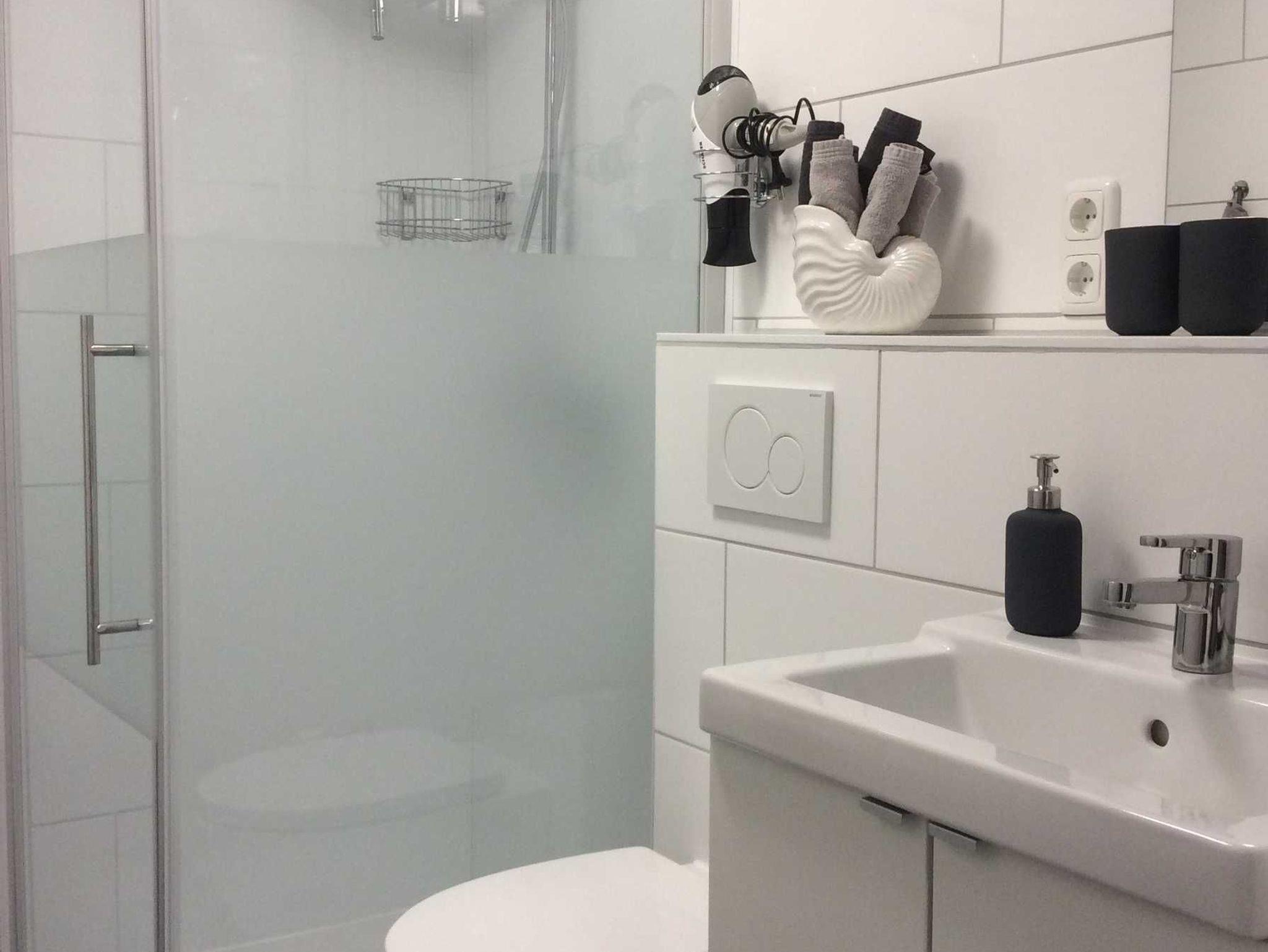 Das deckenhoch geflieste Duschbad verfügt über eine Regendusche, Handtuch-Heizkörper und einen Föhn.