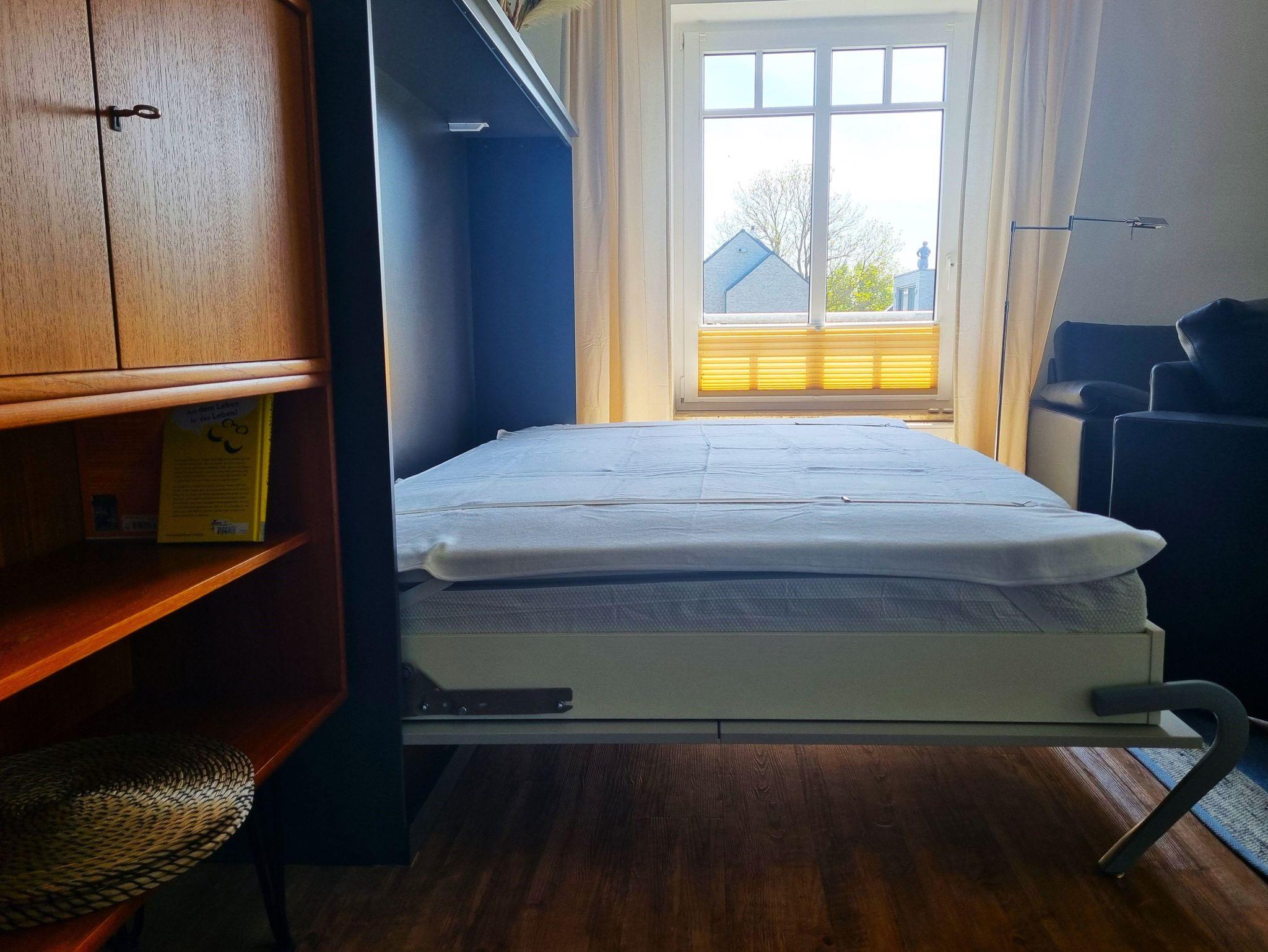 Im Wohnbereich befindet sich zudem ein hochwertiges Wandklappbett mit Federkernmatratze (1,40m x 2,00m).