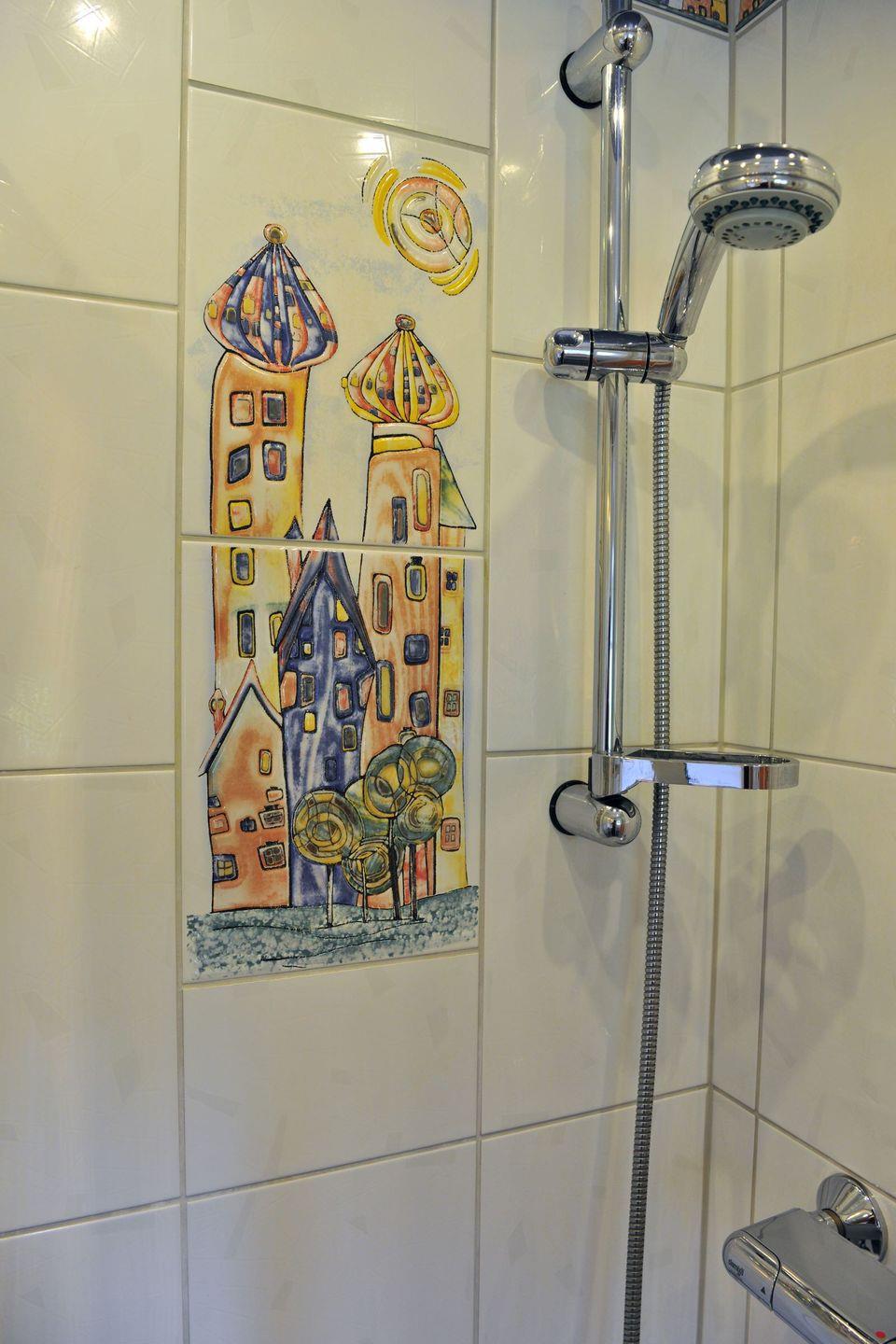 Die stilvollen Bäder sind mit limitierten Hundertwasser-Fliesen ausgestattet, die jedem Raum eine besondere Note verleihen.