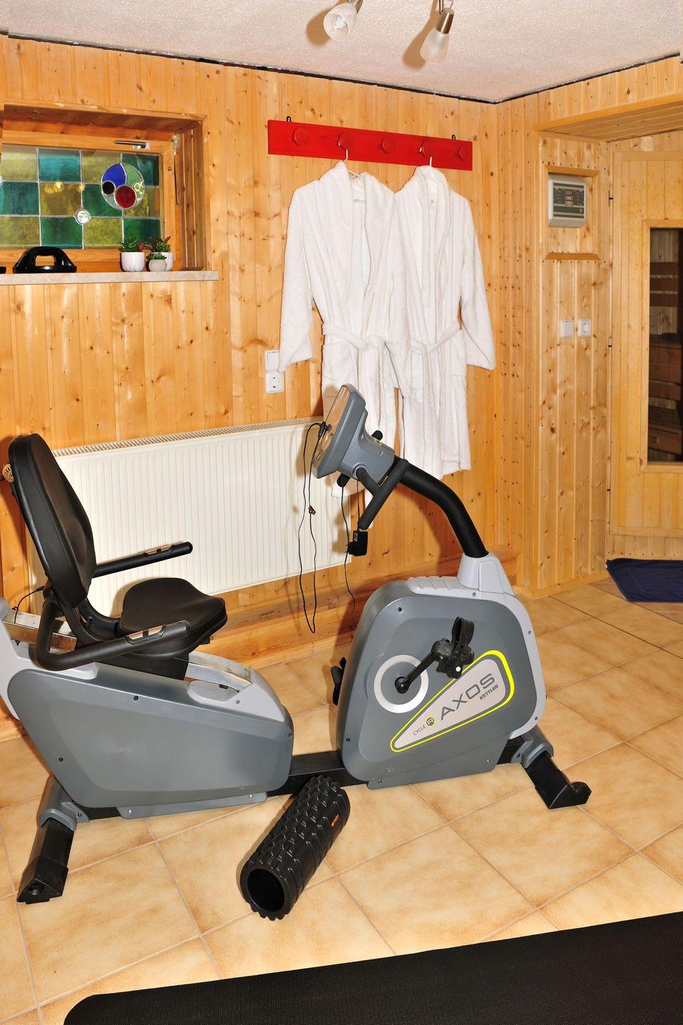 Ein großer, wunderschön gestalteter Saunabereich mit Fitnessgerät machen Ihr Wohlbefinden perfekt.