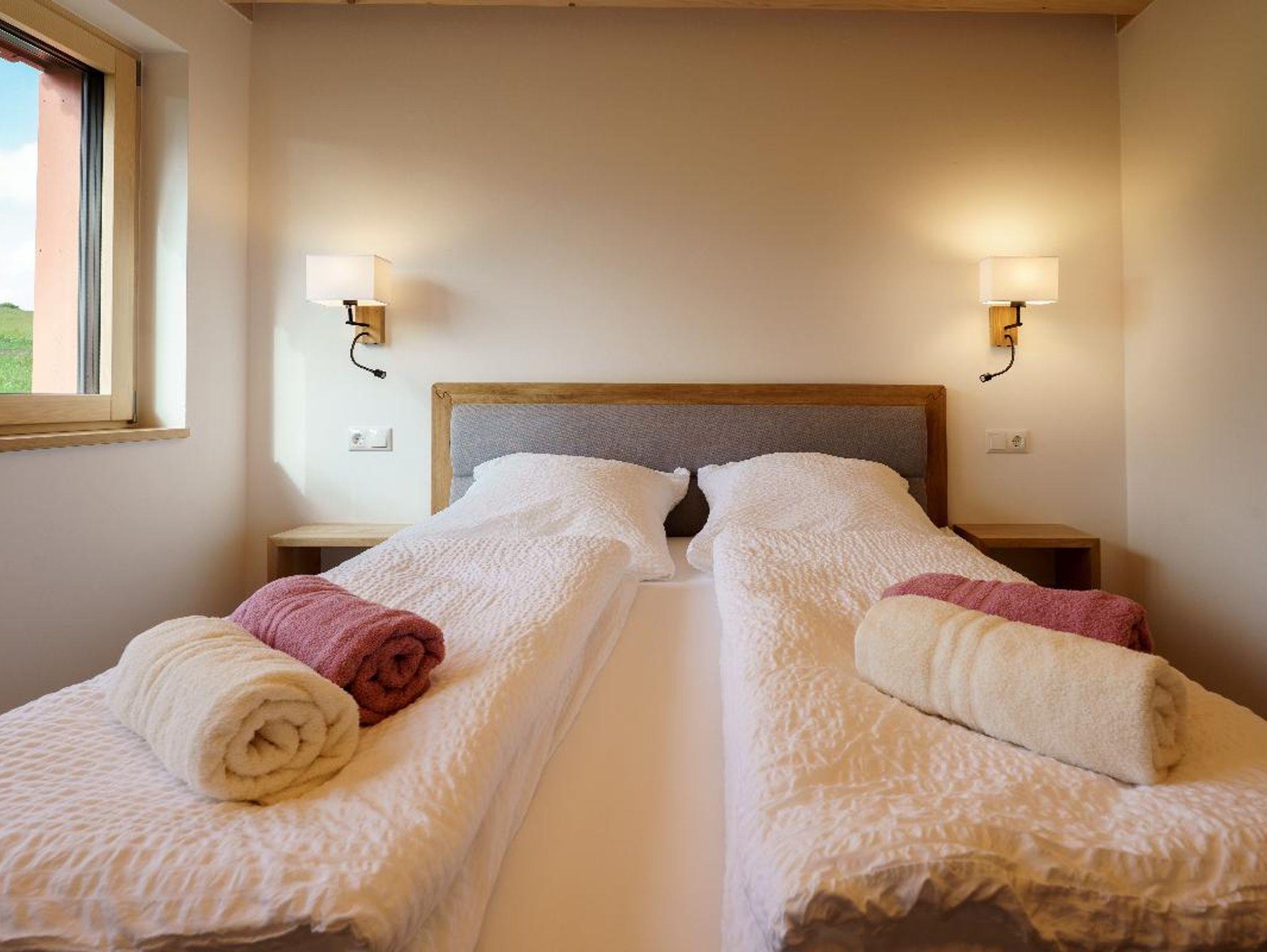 Auf 80?Quadratmetern finden bis zu fünf Personen Platz. Ein gemütliches Elternschlafzimmer mit Boxspringbett befindet sich im Erdgeschoss, zwei weitere Schlafzimmer mit Einzelbetten – eines davon mit zusätzlichem Schlafsessel für ein Kind – liegen im Obergeschoss. Herzstück des Hauses ist der helle Wohn- und Essbereich mit großer Fensterfront, offener Galerie und voll ausgestatteter Küche. Das moderne Bad verfügt über eine begehbare Regendusche, Fußbodenheizung sorgt für behagliche Wärme. Auf der großzügigen Terrasse lädt ein beheizter Außen-Whirlpool zum Entspannen ein – mit Blick auf die stille Natur ringsum.