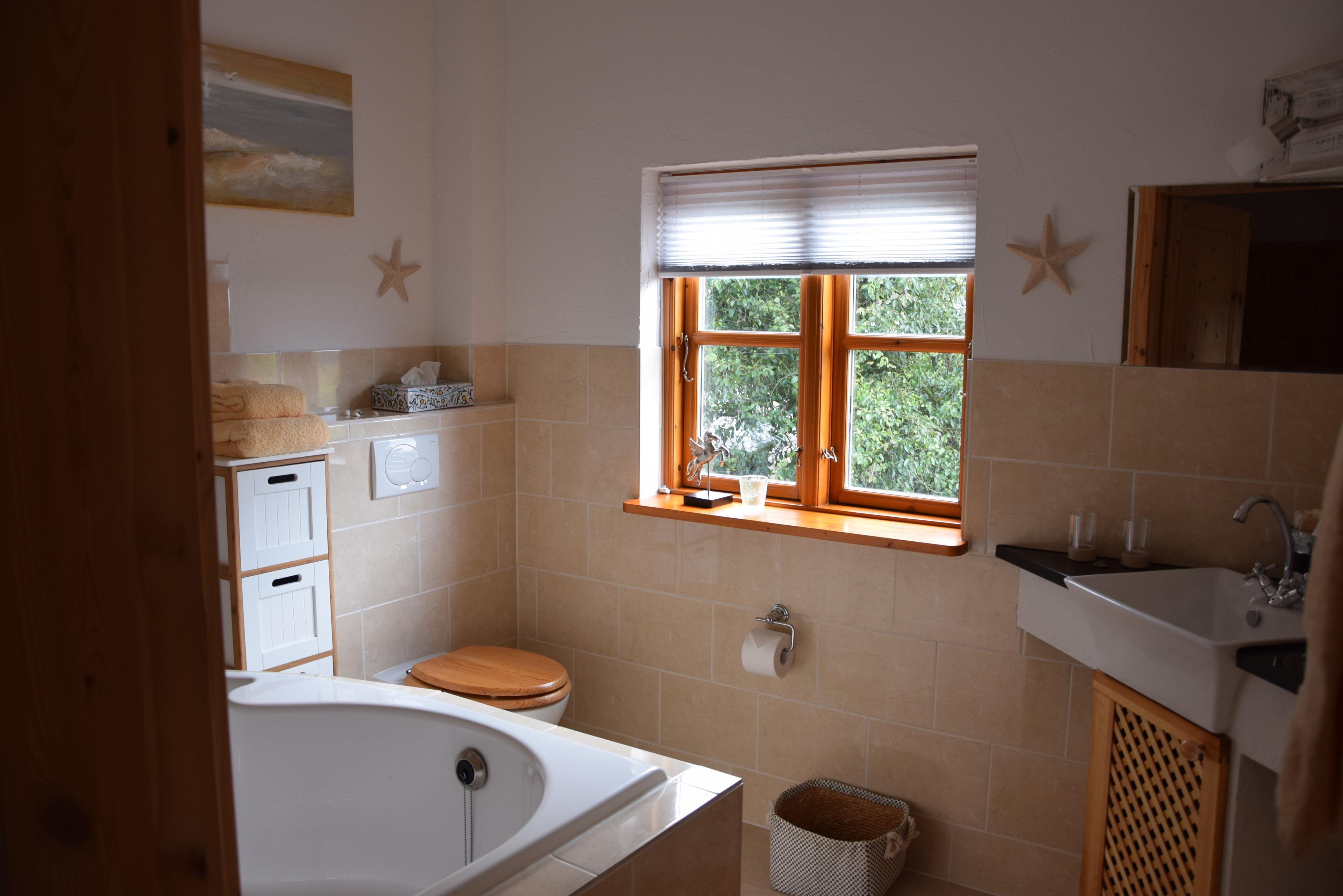 Die Ferienwohnung erstreckt sich über zwei Etagen und besitzt im Erdgeschoss einen offenen Küchen- und Esszimmerbereich mit Geschirrspülmaschine. Des Weiteren befinden sich in dieser Etage der Ausgang zur geräumigen Terrasse und ein Badezimmer mit Dusche und WC. Aus dem Flur führt eine Treppe nach oben. Dort finden Sie ein separates Schlafzimmer inklusive begehbarem Kleiderschrank, das Wohnzimmer mit TV-Flachbild und Stereoanlage und ein Wannenbad mit Waschmaschine.