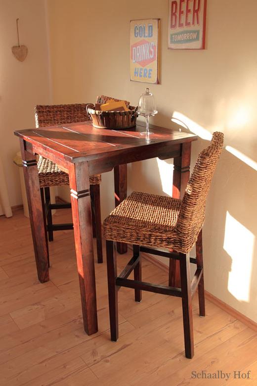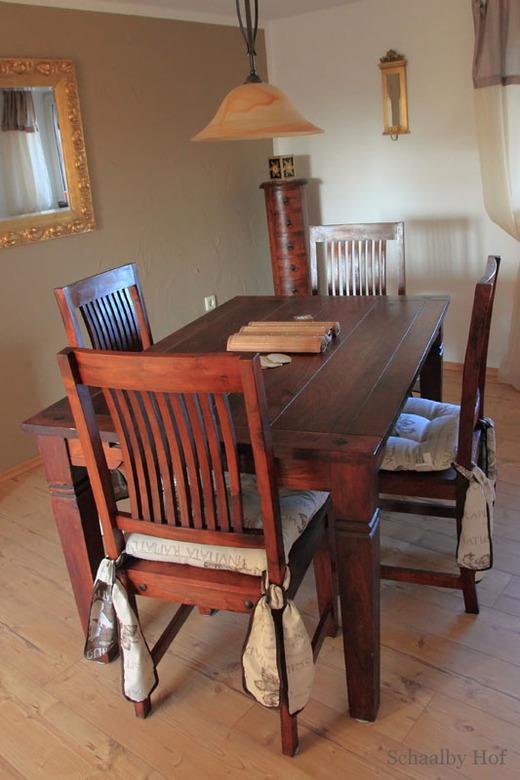 Die Ferienwohnung "Utkiek" befindet sich in der ersten Etage des Hauses und bietet auf 80 qm Platz für 4 Personen. Neben zwei komfortablen Schlafzimmern gibt es außerdem ein großzügiges Duschbad mit 2 Waschtischen, eine komplett eingerichtete Küche mit Durchgang zum angrenzenden Esszimmer und eine anliegende TV-Lounge. Ein terrassenartiger Balkon bietet einen traumhaften Ausblick bis zum Ostseefjord Schlei.