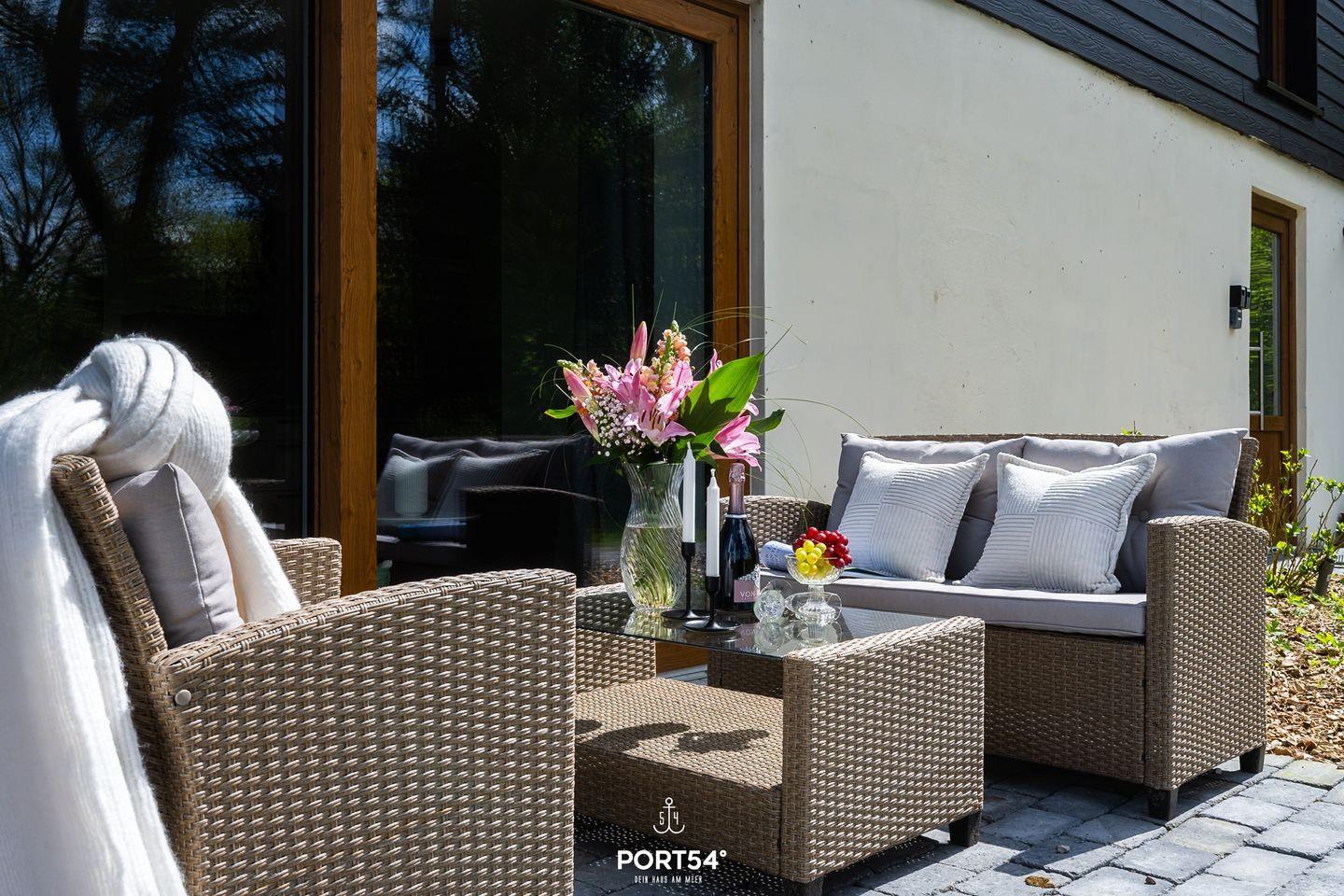 Zu den weiteren Annehmlichkeiten gehören ein Privatparkplatz für bis zu zwei Fahrzeuge sowie eine Terrasse, auf der Sie die frische Seeluft genießen können. Es gibt einen gemeinschaftlichen Außenbereich mit den anderen Ferienwohnungen. Außerdem sind Kinder herzlich willkommen und Haustiere bis zu maximal zwei Tieren sind gern gesehen.
