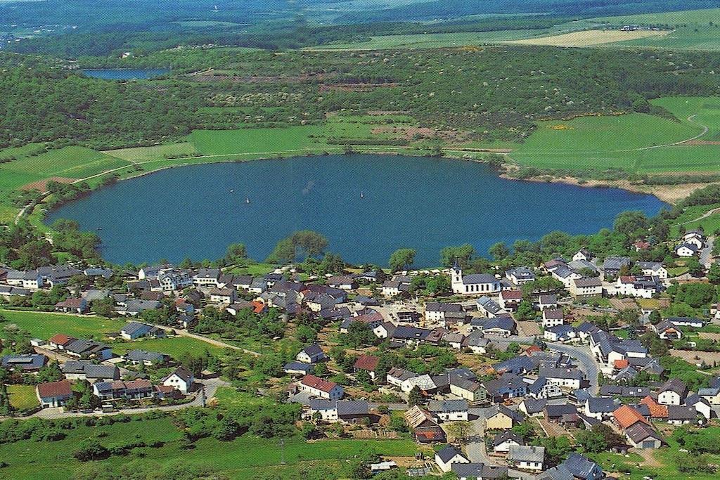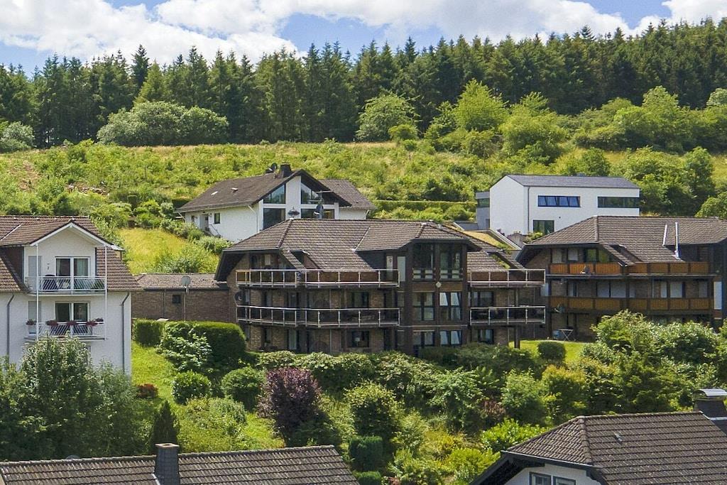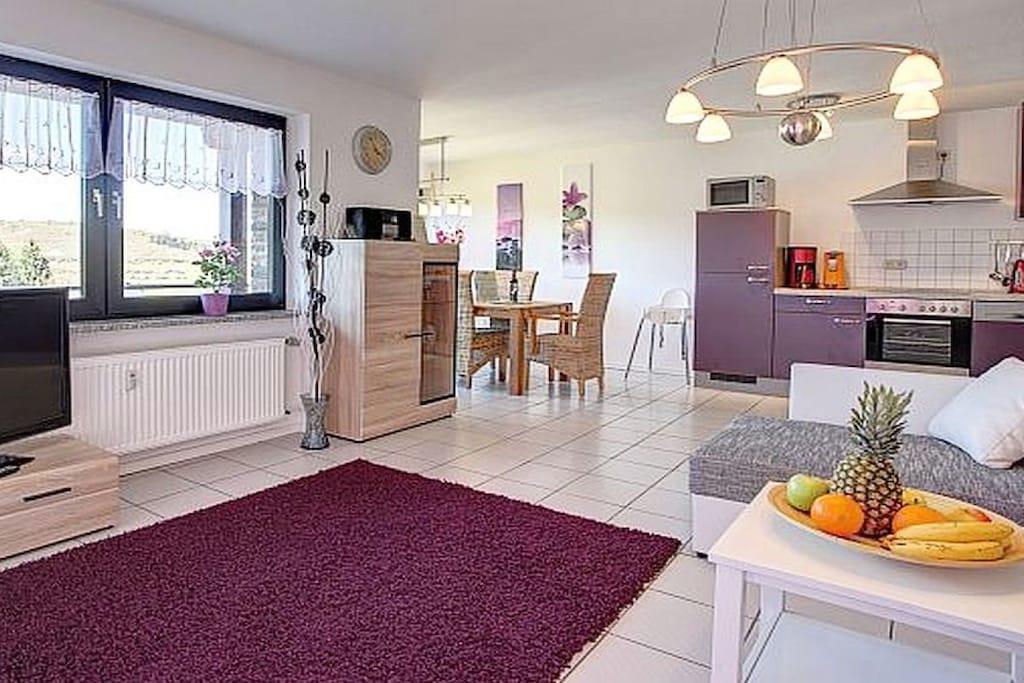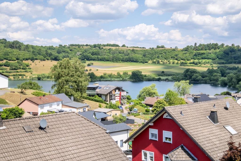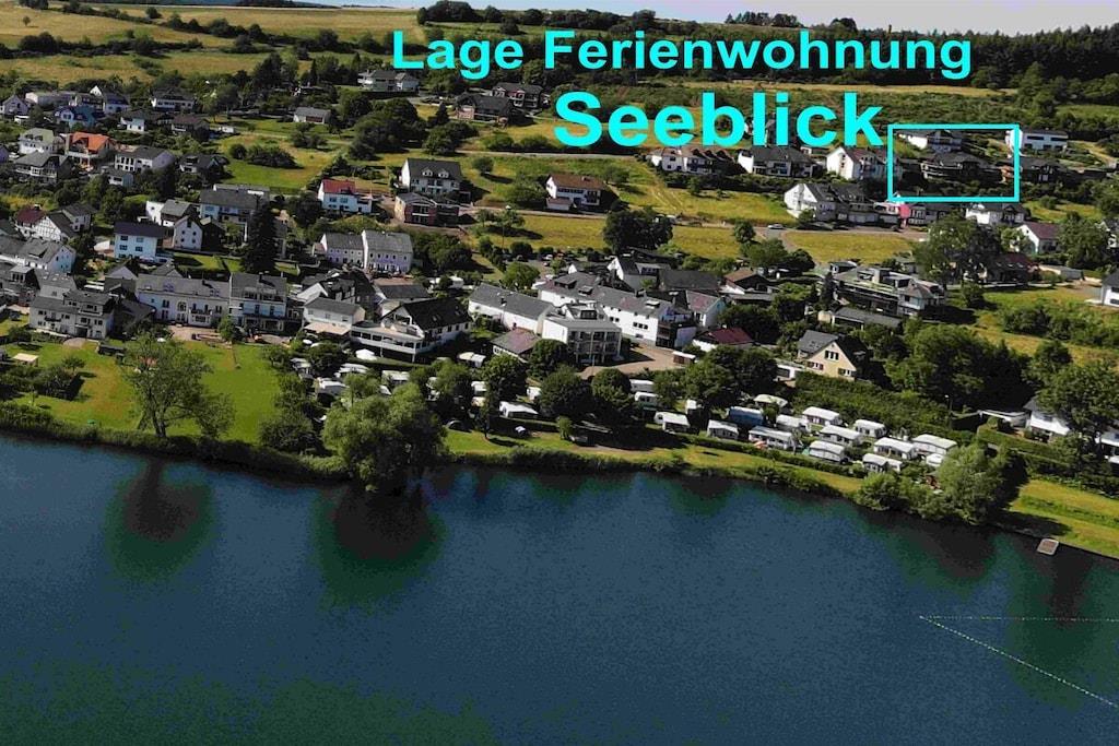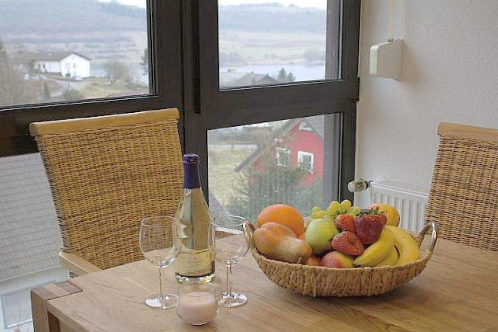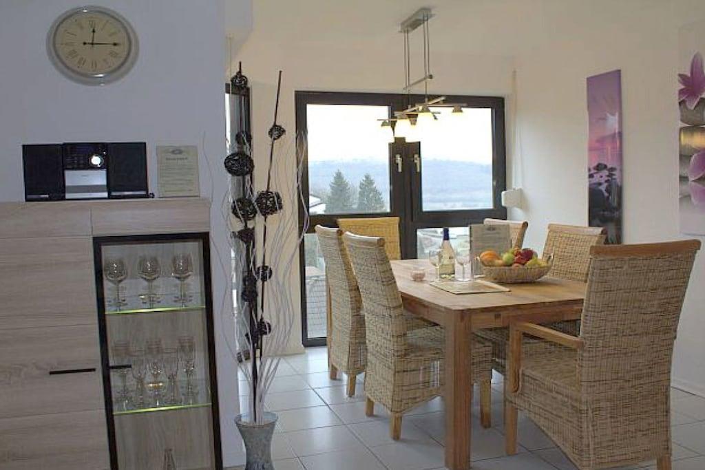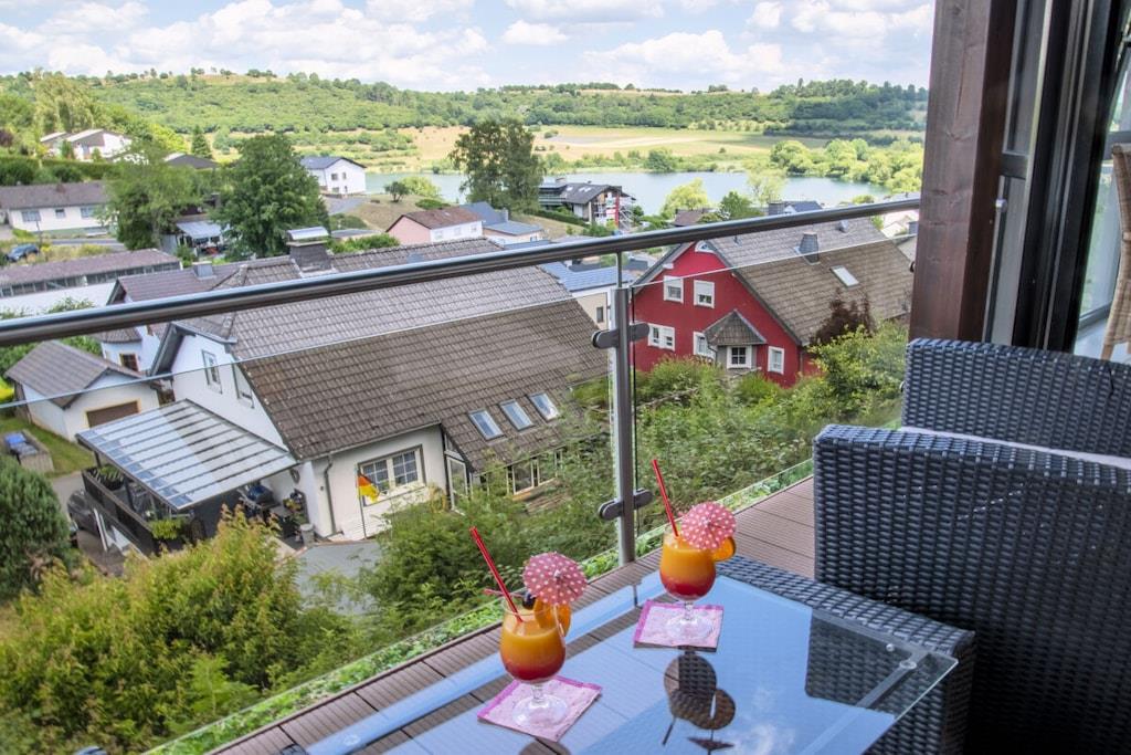 Ferienwohnung Seeblick Diese Ferienwohnung ist hell, modern und elegant eingerichtet. Sie hat einen herrlichen Blick auf den See und den Ort Tal. Bis zum See und dem Ortskern sind es nur wenige Gehminuten. Alle Informationen auch auf unserer Website: www.villa1.de Die Wohnung liegt in einem schönen Wohngebiet. Es handelt sich um eine Nichtraucherwohnung (Raucher bitte auf den überdachten Bakon ausweichen). Die elegante Ferienwohnung verfügt über kostenlosen Internetzugang mit Wlan, Waschmaschine und ein Trockner können im nahe gelegenen Maarberg Resort benutzt werden. Ferienwohnung Seeblick: Die Wohnung ist ca. 76 qm groß und für 2 bis 6 Personen geeignet. Großer Wohn-Schlafraum mit Doppelschlafsofa, Essecke mit See- und Panoramablick, 2 separate Schlafräume, davon ein Schlafraum mit großem Doppelbett (2,00 m x 1,80 m) und ein Schlafraum mit franz. Doppelbett (1,40 m breit), hochwertige Küche mit Spülmaschine, 4 Platten-Ceranfeld, Backofen, Kühlschrank mit Gefrierfach, 2 Kaffeemaschinen: 1 x Kaffeemaschine Sanseo und 1 x Filtermaschine, Abstellraum mit Reinigungsmittel etc. Dusche und WC und Waschtisch, zusätzliches Gäste-WC mit kleinem Waschtisch, Diele, Garderobe, Zentralheizung, Im Wohnraum: Digitalfernsehen mit Flachbildschirm (107 cm, HD-Fernsehen, 2 Satelliten: Astra und Hotbird mit sehr vielen deutschen und internationalen Sendern), Digital-Radio mit vielen deutschen und internationalen Sendern, Die Wohnung verfügt über einen WIFI Internetzugang. Internet / Wlan / Wifi: Kostenlos nutzbar in allen Räumen! DVD-Player, CD-Player, Stereoanlage, Spiele, separater Eingang. Fernseher auch in beiden Schlafzimmern Außenbereich: Großer überdachter Balkon Richtung Westen, ins Tal und Richtung See, mit herrlichem Blick auf den See und den Ort, Gartenmöbel und Esstisch auch auf dem Balkon, Zugang zum Balkon von Wohnzimmer, von Essecke und von dem kleineren Schlafzimmer aus, Parkraum direkt vor dem Hauseingang. Zudem ist eine Garage für Fahrräder oder Motorräder nutzbar. Zur Ausstattung der Wohnung gehören: Mikrowelle, 2 Kaffeemaschinen, Toaster und Wasserkocher. Töpfe und Pfannen sowie Besteck und Geschirr für die höchstmögliche Personenzahl sind selbstverständlich vorhanden. Kinderbett und Hochstuhl können kostenlos bereitgestellt werden. Toilettenpapier ist selbstverständlich vorhanden. Die Wohnung hat eine Zentralheizung und natürlich einen separaten Eingang. Zahlung: Sie können bei uns in folgender Form zahlen: - Per Überweisung im Vorfeld - Per Einzug mit Kreditkarte (Visa, Mastercard) - Per Paypal über unsere e-mail Adresse - Bei kurzfristig getätigten Buchungen können Sie auch vor Ort an unserer Reception im Haupthaus (Maarberg Resort in Schalkenmehren) in bar, mit EC-Karte oder mit der Kreditkarte (Visa, Mastercard) zahlen. Die Anreise kann ab 13 Uhr erfolgen. Die Abreise sollte bis 10.00 Uhr erfolgen. In Einzelfällen können Ausnahmen abgesprochen werden Alle Infos direkt auf unserer website: www.villa1.de