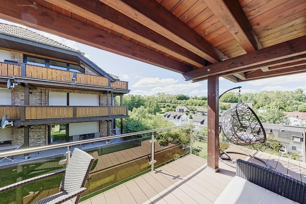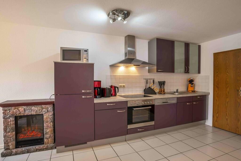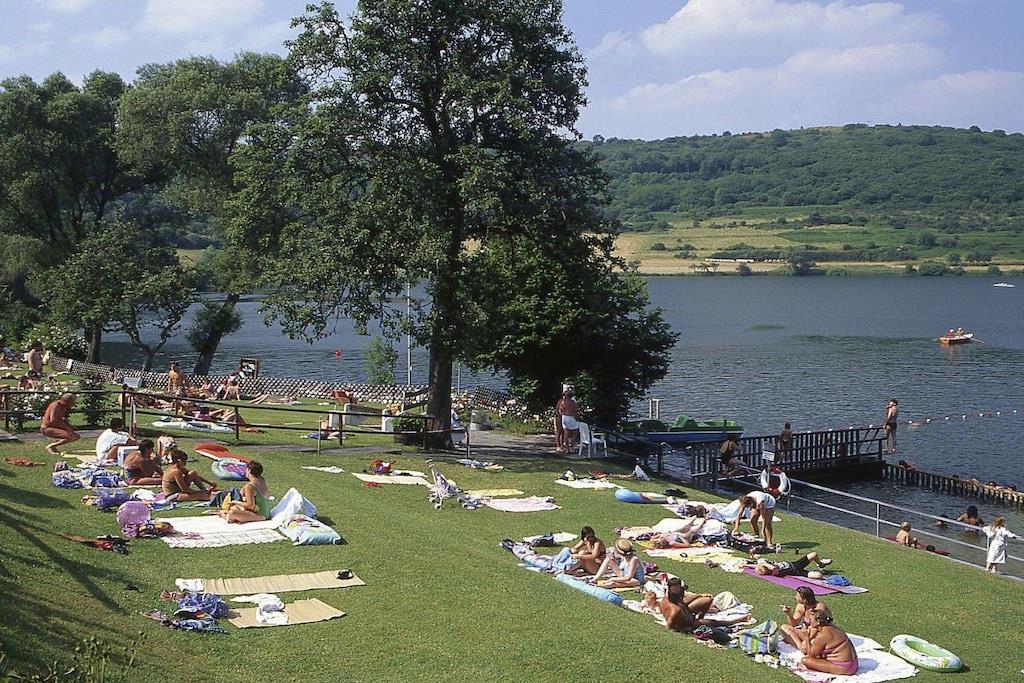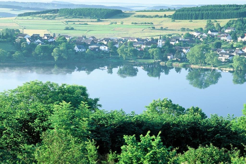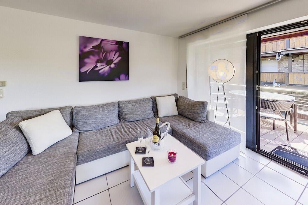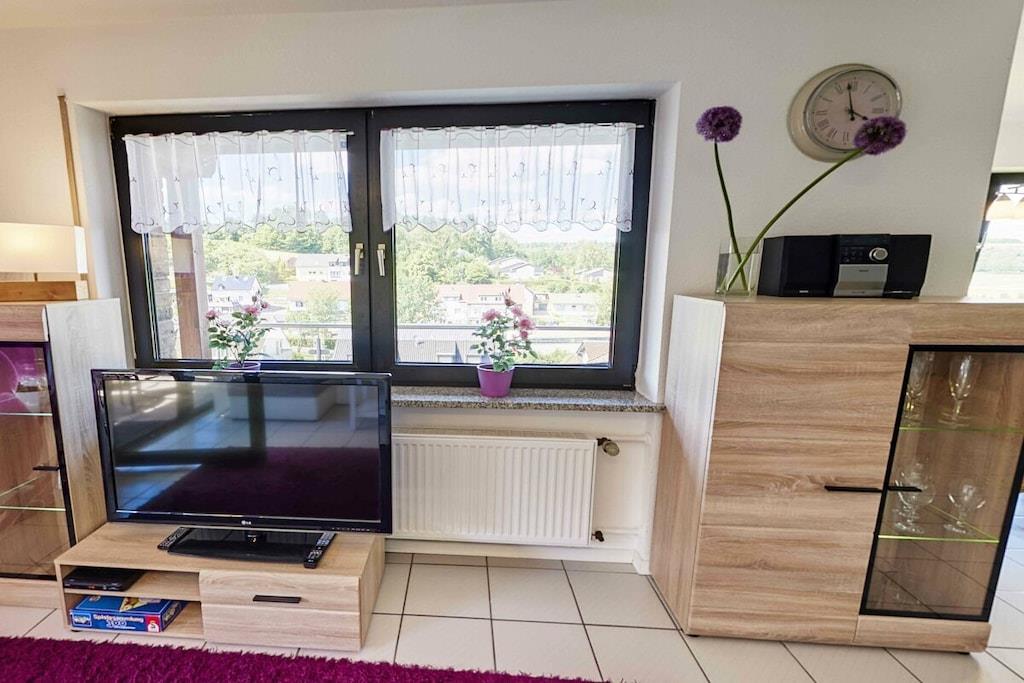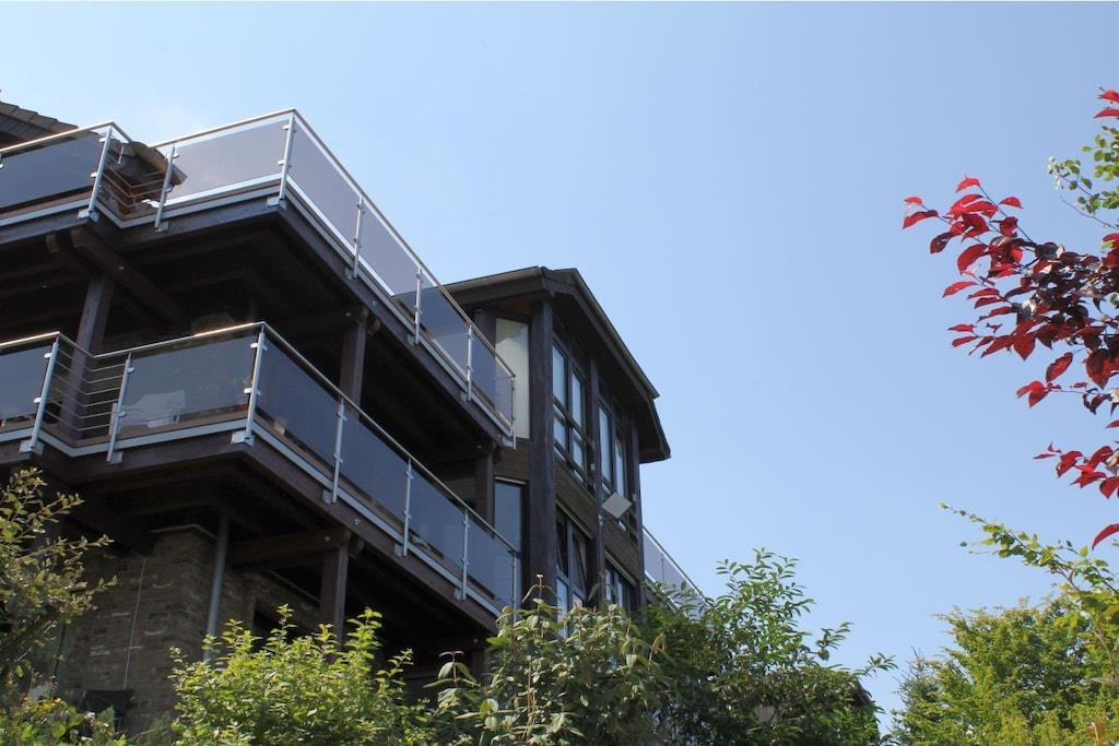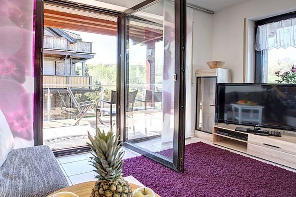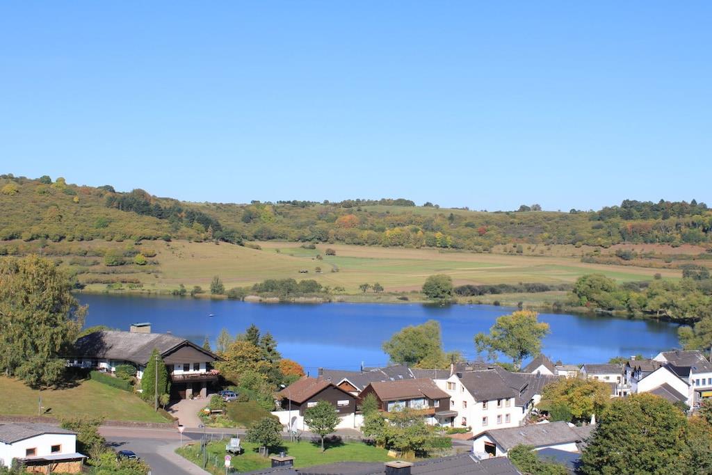 Ferienwohnung Seeblick Diese Ferienwohnung ist hell, modern und elegant eingerichtet. Sie hat einen herrlichen Blick auf den See und den Ort Tal. Bis zum See und dem Ortskern sind es nur wenige Gehminuten. Alle Informationen auch auf unserer Website: www.villa1.de Die Wohnung liegt in einem schönen Wohngebiet. Es handelt sich um eine Nichtraucherwohnung (Raucher bitte auf den überdachten Bakon ausweichen). Die elegante Ferienwohnung verfügt über kostenlosen Internetzugang mit Wlan, Waschmaschine und ein Trockner können im nahe gelegenen Maarberg Resort benutzt werden. Ferienwohnung Seeblick: Die Wohnung ist ca. 76 qm groß und für 2 bis 6 Personen geeignet. Großer Wohn-Schlafraum mit Doppelschlafsofa, Essecke mit See- und Panoramablick, 2 separate Schlafräume, davon ein Schlafraum mit großem Doppelbett (2,00 m x 1,80 m) und ein Schlafraum mit franz. Doppelbett (1,40 m breit), hochwertige Küche mit Spülmaschine, 4 Platten-Ceranfeld, Backofen, Kühlschrank mit Gefrierfach, 2 Kaffeemaschinen: 1 x Kaffeemaschine Sanseo und 1 x Filtermaschine, Abstellraum mit Reinigungsmittel etc. Dusche und WC und Waschtisch, zusätzliches Gäste-WC mit kleinem Waschtisch, Diele, Garderobe, Zentralheizung, Im Wohnraum: Digitalfernsehen mit Flachbildschirm (107 cm, HD-Fernsehen, 2 Satelliten: Astra und Hotbird mit sehr vielen deutschen und internationalen Sendern), Digital-Radio mit vielen deutschen und internationalen Sendern, Die Wohnung verfügt über einen WIFI Internetzugang. Internet / Wlan / Wifi: Kostenlos nutzbar in allen Räumen! DVD-Player, CD-Player, Stereoanlage, Spiele, separater Eingang. Fernseher auch in beiden Schlafzimmern Außenbereich: Großer überdachter Balkon Richtung Westen, ins Tal und Richtung See, mit herrlichem Blick auf den See und den Ort, Gartenmöbel und Esstisch auch auf dem Balkon, Zugang zum Balkon von Wohnzimmer, von Essecke und von dem kleineren Schlafzimmer aus, Parkraum direkt vor dem Hauseingang. Zudem ist eine Garage für Fahrräder oder Motorräder nutzbar. Zur Ausstattung der Wohnung gehören: Mikrowelle, 2 Kaffeemaschinen, Toaster und Wasserkocher. Töpfe und Pfannen sowie Besteck und Geschirr für die höchstmögliche Personenzahl sind selbstverständlich vorhanden. Kinderbett und Hochstuhl können kostenlos bereitgestellt werden. Toilettenpapier ist selbstverständlich vorhanden. Die Wohnung hat eine Zentralheizung und natürlich einen separaten Eingang. Zahlung: Sie können bei uns in folgender Form zahlen: - Per Überweisung im Vorfeld - Per Einzug mit Kreditkarte (Visa, Mastercard) - Per Paypal über unsere e-mail Adresse - Bei kurzfristig getätigten Buchungen können Sie auch vor Ort an unserer Reception im Haupthaus (Maarberg Resort in Schalkenmehren) in bar, mit EC-Karte oder mit der Kreditkarte (Visa, Mastercard) zahlen. Die Anreise kann ab 13 Uhr erfolgen. Die Abreise sollte bis 10.00 Uhr erfolgen. In Einzelfällen können Ausnahmen abgesprochen werden Alle Infos direkt auf unserer website: www.villa1.de