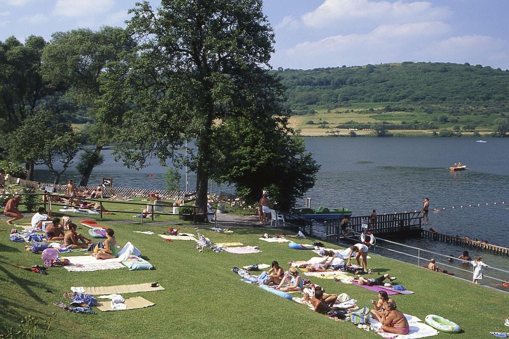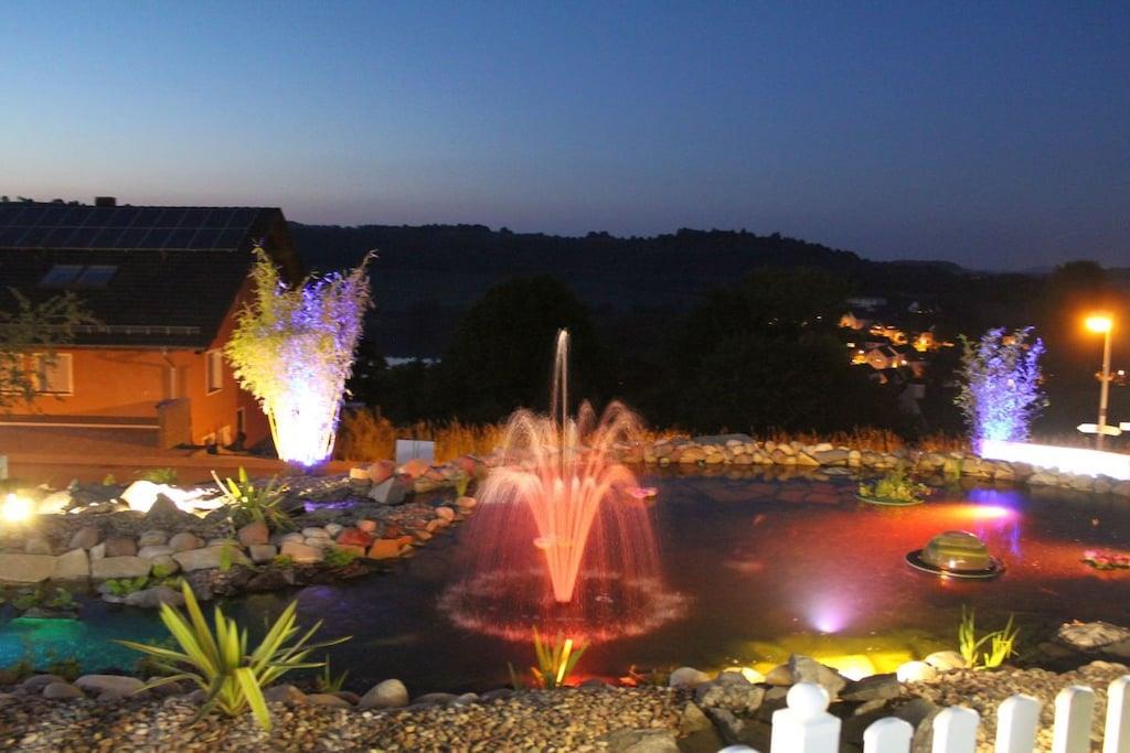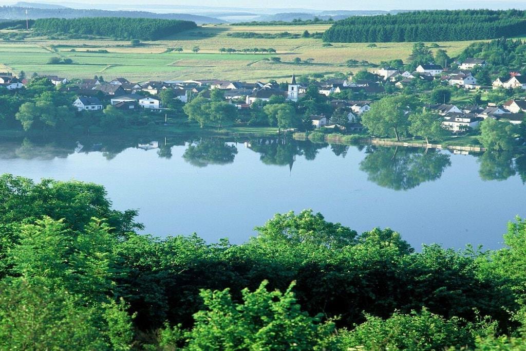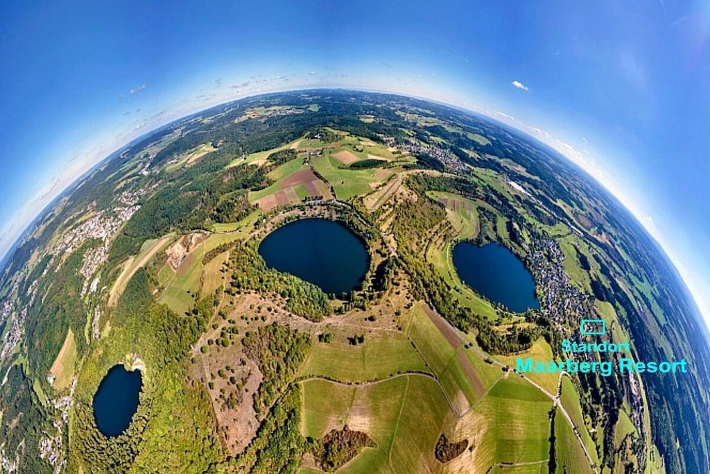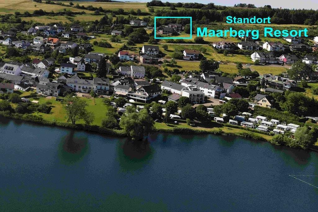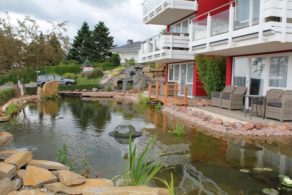 Studio Vulkanpanorama im Maarberg Resort Elegantes Studio in der Apartmentanlage "Maarberg Resort" in Schalkenmehren am See. Herrlicher Seeblick. Mit 2 Personen-Whirlpool und Dampfdusche! Nichtraucherwohnung Die Apartmentanlage "Maarberg Resort" liegt ruhig am Ortrand von Schalkenmehren am See in Hanglage am Ende einer Wohngebietsstrasse. Direkt am Waldrand. Bis zum See und zum Ortskern sind es nur ca. 600 m. Im Ort gibt es gute Restaurants, Cafes und eine Einkaufsmöglichkeit. In der 5 km entfernten Kreisstadt Daun finden Sie zusätzlich viele Einkaufsmöglichkeiten und Supermärkte. Internet / Wlan / Wifi: Kostenlos nutzbar in allen Räumen! Im Haus: Empfangshalle mit Reception, Sitzmöglichkeiten und Spielen (liegen zur Nutzung bereit). Eine neue Sauna und Jacuzzi befinden sich im Untergeschoss (kostenlose Nutzung). Sie können diese Einrichtungen auch alleine nutzen (abschließbar). Zudem steht im Untergeschoss ein Raum mit Waschmaschine, Wäschetrockner, Bügeleisen und Bügelbrett zur Verfügung. In der Empfangshalle erhalten Sie neben Wanderkarten und Ansichtskarten auch kostenloses Informationsmaterial zu den vielen Ausflugszielen und Freizeitmöglichkeiten in der Region. Zudem befindet sich in der Empfangshalle ein Getränkekühlschrank mit Getränken zur Wegnahme auf Vertrauensbasis. Der Außenbereich wird Sie begeistern! Zwei wundervoll und aufwendig angelegte Zierteiche mit Kois und anderen Fischen, 2 Wasserfälle, 2 Bachläufe und eine gepflegte Zierkiesanlage gehören zur Anlage. In den Teichen befinden sich auch Schildkröten. Sitzen Sie gemütlich bei einem Kaffee oder einem Cocktail auf dem Balkon oder der Terrasse und schauen Sie den Fischen und den Schildkröten zu. Oder blicken Sie ins Tal auf den See. Weiter im Außenbereich zu finden: genügende Parkmöglichkeiten, ein Fahrradabstellplatz. Ein Grillplatz mit Blick auf den See befindet sich hinter dem Haus. Studio Vulkanpanorama im Maarberg Resort: Elegantes Studio für 2 Personen. ca. 31 qm Wohnfläche, Terrasse Richtung See und Zierteich. Das Studio Vulkanpanorama liegt ebenerdig (3 Stufen vor der Terrasse) und bietet einen schönen Blick auf den See, die herrliche Landschaft und den gepflegten Zierteich. Sitzen Sie in der Wohnung oder auf der Terrasse und lassen Sie sich von dem Blick verzaubern. Im schönen Wohn/Schlafraum finden Sie ein hochwertige Boxspringbett (180 x 200 cm Doppelbett). Zudem gibt es einen großen, 127 cm HD/3D Fernseher der neuen Generation. Sie haben die Auswahl von ca. 3.000 verschiedenen Fernseh- und Radiosendern in vielen Sprachen von 4 verschiedenen Satelliten. Zudem gibt es einen 3D Blueray-Player und DVD-Player. Auch eine Musikanlage mit Radio, CD usw. befindet sich auf der Wohnung. Es gibt einen kostenfreien Internetzugang mit WIFI (Wlan). Die hell und freundlich eingerichtete Wohnung vermittelt Ihnen eine naturverbundene Atmosphäre (mit Holz und Stein). Es handelt sich um eine Nichtraucherwohnung (Raucher bitte die Terrasse oder Außenbereich benutzen) Die Einbauküche hat einen 4 Plattenherd (Ceranfeld) und Backofen, Spülmaschine, Kühlschrank mit Gefrierfach, Mikrowelle, 2 Kaffeemaschinen (Filter und eine Bosch-Tassimo Maschine). Toaster, Wasserkocher usw. Töpfe und Pfannen sowie Besteck und Geschirr für die höchstmögliche Personenzahl sind selbstverständlich vorhanden. Ein Kinderbett und Hochstuhl können kostenlos bereitgestellt werden. Die Essecke ist für 2 Personen geeignet. Der Schrank verfügt über einen Ganzkörperspiegel. Sie können mit einem Schlüßel der Terrassentüre über die Terrasse und den Zierteich (kleine Brücke) direkt zum Parkplatz oder ins Freie gehen. Somit haben Sie nochmals einen separaten Eingang über die Terrasse. Das Bad ist besonders exklusiv gestaltet! Es verfügt über einen 2 Personen-Whirlpool. Verwöhnen Sie sich selbst im Whirlpool zusätzlich mit einer Lichttherapie, und vielen weiteren Funktionen. Auch ein Radio ist integriert. Spezielles Badesalz für den Whirlpool ist kostenlos vorhanden. Im Bad befindet sich auch ein DVD-Player. Schauen Sie beim gemütlichen Bad einen schönen Film. Für den besonderen Genuss haben wir eine DVD mit Kaminfeuer, Sonnenaufgängen oder Aquariumfischen bereitliegen. Eine separate Dampfdusche sorgt für einen besonderen Genuss. Integriert ist hier eine Dampffunktion, ähnlich einer Dampfsauna (mit Sitz), zudem eine Regendusche, seitliche Massagedüsen und Fußmassagedüsen. Radio, Lichttherapie usw. Die im gesamten Bad, blau leuchtenden Boden-LED´s bieten eine tolle Atmosphäre. Waschplatz mit einem modernem Glaswaschbecken, Schubladenunterschrank. Ein großer, beleuchteter Spiegel mit Schminkspiegel und digitaler LED-Uhr, ein Hotelföhn und eine Personenwaage sind vorhanden. Moderne Heizung (Chrom) mit Handtuchwärmer. Modernes WC mit Absenktechnik. Zur Wohnung gehört eine Terrasse mit 2 Loungesesseln und einem Cocktail- bzw. Kaffeetisch. Falls Sie auf der Terrasse auch richtig gut Essen möchten, finden Sie einen weiteren Esstisch als Klapptisch zur Wegnahme auf jeder Etage vor den Wohnungen. Die Wohnung hat eine Zentralheizung und 2 separate Eingänge. 1 x über den Haupteingang des Hauses (Treppenhaus) und zudem direkt über eine Brücke über den Teich nach außen. Zahlung: Sie können bei uns in folgender Form zahlen: - Per Überweisung im Vorfeld - Per Einzug mit Kreditkarte (Visa, Mastercard) - Per Paypal über unsere e-mail Adresse - Bei kurzfristig getätigten Buchungen können Sie auch vor Ort an unserer Reception im Haupthaus (Maarberg Resort in Schalkenmehren) in bar, mit EC-Karte oder mit der Kreditkarte (Visa, Mastercard) zahlen.