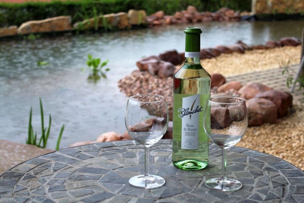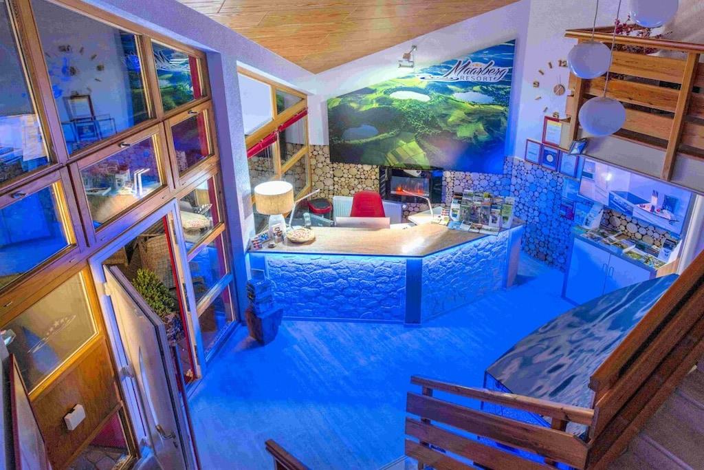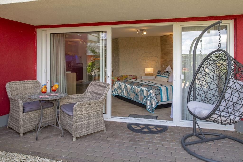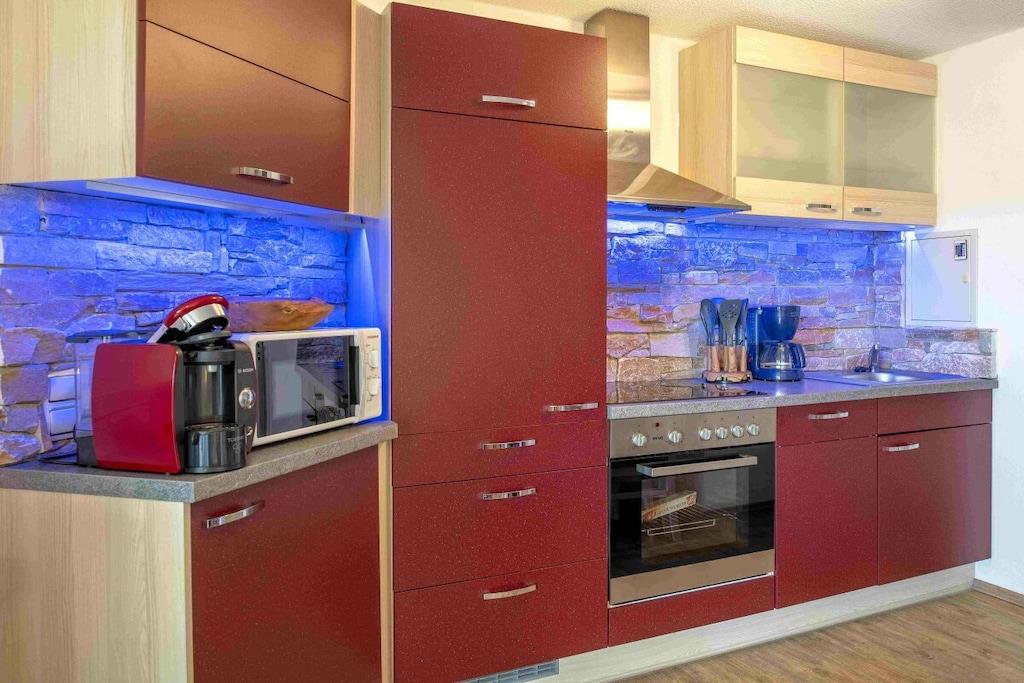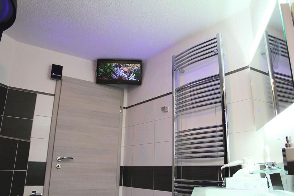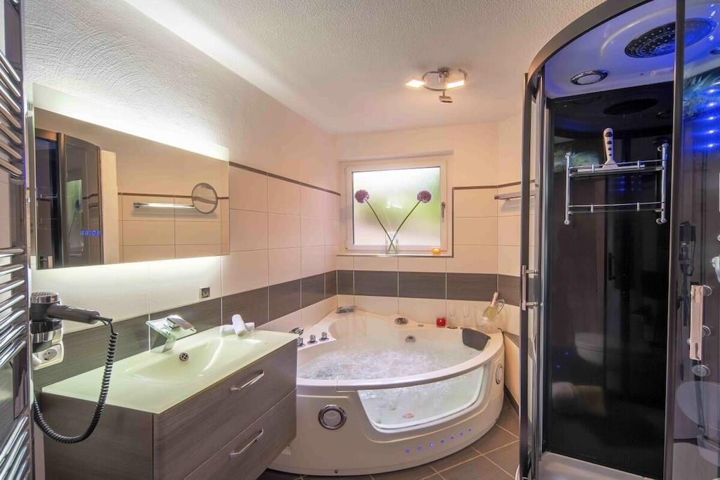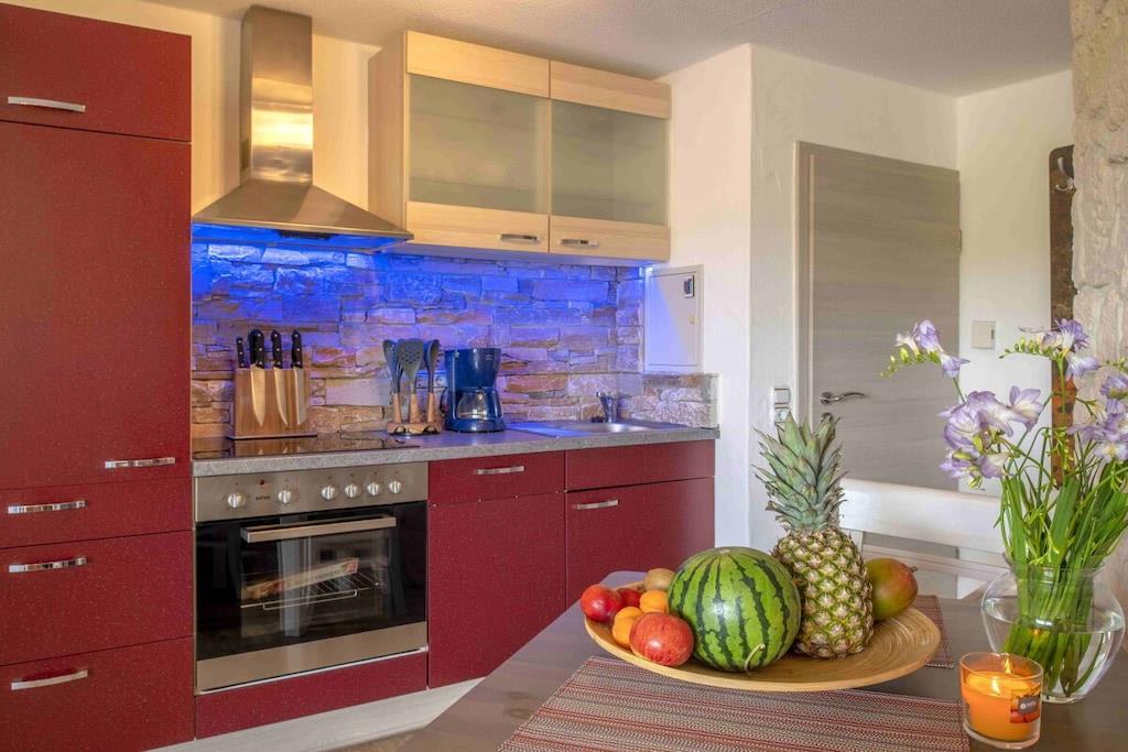 Studio Vulkanpanorama im Maarberg Resort Elegantes Studio in der Apartmentanlage "Maarberg Resort" in Schalkenmehren am See. Herrlicher Seeblick. Mit 2 Personen-Whirlpool und Dampfdusche! Nichtraucherwohnung Die Apartmentanlage "Maarberg Resort" liegt ruhig am Ortrand von Schalkenmehren am See in Hanglage am Ende einer Wohngebietsstrasse. Direkt am Waldrand. Bis zum See und zum Ortskern sind es nur ca. 600 m. Im Ort gibt es gute Restaurants, Cafes und eine Einkaufsmöglichkeit. In der 5 km entfernten Kreisstadt Daun finden Sie zusätzlich viele Einkaufsmöglichkeiten und Supermärkte. Internet / Wlan / Wifi: Kostenlos nutzbar in allen Räumen! Im Haus: Empfangshalle mit Reception, Sitzmöglichkeiten und Spielen (liegen zur Nutzung bereit). Eine neue Sauna und Jacuzzi befinden sich im Untergeschoss (kostenlose Nutzung). Sie können diese Einrichtungen auch alleine nutzen (abschließbar). Zudem steht im Untergeschoss ein Raum mit Waschmaschine, Wäschetrockner, Bügeleisen und Bügelbrett zur Verfügung. In der Empfangshalle erhalten Sie neben Wanderkarten und Ansichtskarten auch kostenloses Informationsmaterial zu den vielen Ausflugszielen und Freizeitmöglichkeiten in der Region. Zudem befindet sich in der Empfangshalle ein Getränkekühlschrank mit Getränken zur Wegnahme auf Vertrauensbasis. Der Außenbereich wird Sie begeistern! Zwei wundervoll und aufwendig angelegte Zierteiche mit Kois und anderen Fischen, 2 Wasserfälle, 2 Bachläufe und eine gepflegte Zierkiesanlage gehören zur Anlage. In den Teichen befinden sich auch Schildkröten. Sitzen Sie gemütlich bei einem Kaffee oder einem Cocktail auf dem Balkon oder der Terrasse und schauen Sie den Fischen und den Schildkröten zu. Oder blicken Sie ins Tal auf den See. Weiter im Außenbereich zu finden: genügende Parkmöglichkeiten, ein Fahrradabstellplatz. Ein Grillplatz mit Blick auf den See befindet sich hinter dem Haus. Studio Vulkanpanorama im Maarberg Resort: Elegantes Studio für 2 Personen. ca. 31 qm Wohnfläche, Terrasse Richtung See und Zierteich. Das Studio Vulkanpanorama liegt ebenerdig (3 Stufen vor der Terrasse) und bietet einen schönen Blick auf den See, die herrliche Landschaft und den gepflegten Zierteich. Sitzen Sie in der Wohnung oder auf der Terrasse und lassen Sie sich von dem Blick verzaubern. Im schönen Wohn/Schlafraum finden Sie ein hochwertige Boxspringbett (180 x 200 cm Doppelbett). Zudem gibt es einen großen, 127 cm HD/3D Fernseher der neuen Generation. Sie haben die Auswahl von ca. 3.000 verschiedenen Fernseh- und Radiosendern in vielen Sprachen von 4 verschiedenen Satelliten. Zudem gibt es einen 3D Blueray-Player und DVD-Player. Auch eine Musikanlage mit Radio, CD usw. befindet sich auf der Wohnung. Es gibt einen kostenfreien Internetzugang mit WIFI (Wlan). Die hell und freundlich eingerichtete Wohnung vermittelt Ihnen eine naturverbundene Atmosphäre (mit Holz und Stein). Es handelt sich um eine Nichtraucherwohnung (Raucher bitte die Terrasse oder Außenbereich benutzen) Die Einbauküche hat einen 4 Plattenherd (Ceranfeld) und Backofen, Spülmaschine, Kühlschrank mit Gefrierfach, Mikrowelle, 2 Kaffeemaschinen (Filter und eine Bosch-Tassimo Maschine). Toaster, Wasserkocher usw. Töpfe und Pfannen sowie Besteck und Geschirr für die höchstmögliche Personenzahl sind selbstverständlich vorhanden. Ein Kinderbett und Hochstuhl können kostenlos bereitgestellt werden. Die Essecke ist für 2 Personen geeignet. Der Schrank verfügt über einen Ganzkörperspiegel. Sie können mit einem Schlüßel der Terrassentüre über die Terrasse und den Zierteich (kleine Brücke) direkt zum Parkplatz oder ins Freie gehen. Somit haben Sie nochmals einen separaten Eingang über die Terrasse. Das Bad ist besonders exklusiv gestaltet! Es verfügt über einen 2 Personen-Whirlpool. Verwöhnen Sie sich selbst im Whirlpool zusätzlich mit einer Lichttherapie, und vielen weiteren Funktionen. Auch ein Radio ist integriert. Spezielles Badesalz für den Whirlpool ist kostenlos vorhanden. Im Bad befindet sich auch ein DVD-Player. Schauen Sie beim gemütlichen Bad einen schönen Film. Für den besonderen Genuss haben wir eine DVD mit Kaminfeuer, Sonnenaufgängen oder Aquariumfischen bereitliegen. Eine separate Dampfdusche sorgt für einen besonderen Genuss. Integriert ist hier eine Dampffunktion, ähnlich einer Dampfsauna (mit Sitz), zudem eine Regendusche, seitliche Massagedüsen und Fußmassagedüsen. Radio, Lichttherapie usw. Die im gesamten Bad, blau leuchtenden Boden-LED´s bieten eine tolle Atmosphäre. Waschplatz mit einem modernem Glaswaschbecken, Schubladenunterschrank. Ein großer, beleuchteter Spiegel mit Schminkspiegel und digitaler LED-Uhr, ein Hotelföhn und eine Personenwaage sind vorhanden. Moderne Heizung (Chrom) mit Handtuchwärmer. Modernes WC mit Absenktechnik. Zur Wohnung gehört eine Terrasse mit 2 Loungesesseln und einem Cocktail- bzw. Kaffeetisch. Falls Sie auf der Terrasse auch richtig gut Essen möchten, finden Sie einen weiteren Esstisch als Klapptisch zur Wegnahme auf jeder Etage vor den Wohnungen. Die Wohnung hat eine Zentralheizung und 2 separate Eingänge. 1 x über den Haupteingang des Hauses (Treppenhaus) und zudem direkt über eine Brücke über den Teich nach außen. Zahlung: Sie können bei uns in folgender Form zahlen: - Per Überweisung im Vorfeld - Per Einzug mit Kreditkarte (Visa, Mastercard) - Per Paypal über unsere e-mail Adresse - Bei kurzfristig getätigten Buchungen können Sie auch vor Ort an unserer Reception im Haupthaus (Maarberg Resort in Schalkenmehren) in bar, mit EC-Karte oder mit der Kreditkarte (Visa, Mastercard) zahlen.