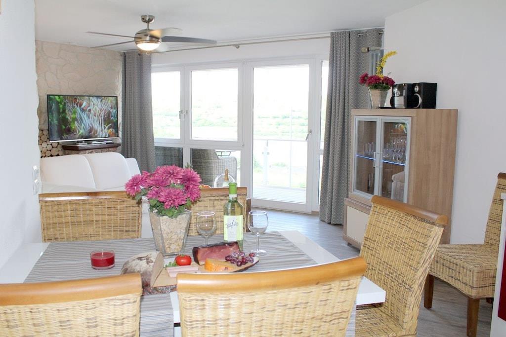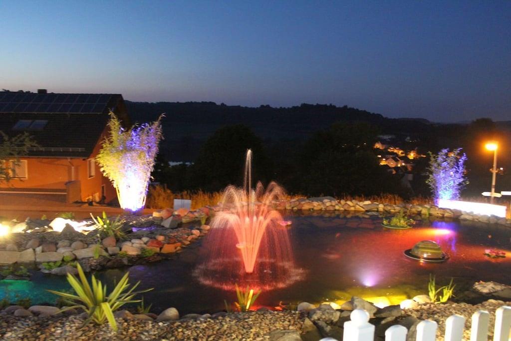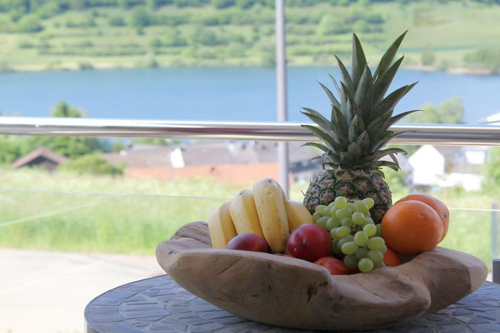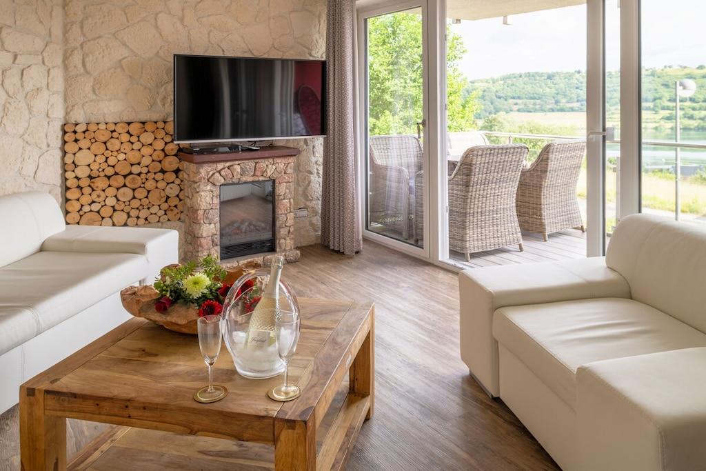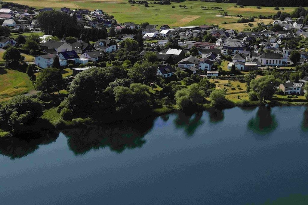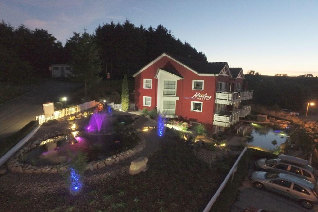 Stilvolle Ferienwohnung im "Maarberg Resort" in Schalkenmehren am See. Mit 2 Personen-Whirlpool, Nichtraucherwohnung. Alle Informationen auch auf unserer Website www.villa1.de Elegante, komplett neu eingerichtete Ferienwohnung mit ca. 58 m² Wohnfläche, Balkon mit Blick auf den See und den Zierteich. Die Ferienwohnung Maarpanorama liegt im Mittelgeschoß (Ebenerdig zum Haupteingang) und bietet einen atemberaubenden Blick auf den See, die herrliche Landschaft und den gepflegten Zierteich. Sitzen Sie in der Ferienwohnung oder auf dem Balkon und lassen Sie sich von dem Blick verzaubern. Im schönen Wohnraum finden Sie eine neue Sofagarnitur mit Bettfunktion und einen großen, 127 cm HD/3D Fernseher der neuen Generation. Sie haben die Auswahl von vielen verschiedenen Fernseh- und Radiosendern in vielen Sprachen von 4 verschiedenen Satelliten. Zudem gibt es einen 3D Blueray Player und DVD-Player. Auch eine Musikanlage mit Radio, CD usw. befindet sich in der Wohnung. Die Wohnung verfügt über einen WIFI Internetzugang. Internet / Wlan / Wifi: Kostenlos nutzbar! Die hell und freundlich eingerichtete Ferienwohnung vermittelt einen naturverbundenen Flair mit viel Holz und Stein. Zudem verbreitet der Elektrokamin und ein eleganter Deckenventilator eine besondere, gemütliche Atmosphäre. So erhalten Sie auch an kalten und nassen Tagen eine besondere Urlaubsatmosphäre. Es handelt sich um eine Nichtraucherwohnung (Raucher bitte den Balkon oder Außenbereich benutzen) Die neue Einbauküche hat einen 4 Plattenherd (Ceranfeld) und Backofen, Spülmaschine, Kühlschrank mit Gefrierfach, Mikrowelle, 2 Kaffeemaschinen (1 x Filtermaschine und 1 x Bosch-Tassimo Maschine), Toaster, Wasserkocher usw. Töpfe und Pfannen sowie Besteck und Geschirr für die höchstmögliche Personenzahl sind selbstverständlich vorhanden. Ebenso Toilettenpapier, Geschirrtücher und ähnliches. Ein Kinderbett und Hochstuhl können kostenlos bereitgestellt werden. Die Essecke ist für bis zu 6 Personen geeignet. Die Ferienwohnung verfügt über 2 Separate Schlafzimmer mit hochwertigen Boxspringbetten (180 cm x 200 cm und 140 cm x 200 cm). So steht einem guten Schlaf nichts mehr im Wege. Das zweite Schlafzimmer verfügt über ein franz. Doppelbett mit 140 cm Breite. Zudem blicken Sie auch aus dem größeren Schlafzimmer auf den See! Zudem gibt es Ganzkörperspiegel in den Schlafzimmern. Im Wohnraum befindet sich als zusätzliche Schlafmöglichkeit ein neues Doppelschlafsofa. Im hellen Bad finden Sie einen 2 Personen-Whirlpool. Verwöhnen Sie sich selbst im Whirlpool mit einer Lichttherapie und vielen weiteren Funktionen. Auch ein Radio ist integriert. Spezielles Badesalz für den Whirlpool ist kostenlos vorhanden. Im Bad befindet sich ein Flachbild-TV. Schauen Sie beim gemütlichen Bad einen schönen Film auf dem TV oder legen Sie eine gute DVD ein. Für den besonderen Genuss haben wir eine DVD mit Kaminfeuer, Sonnenaufgängen oder Aquariumfischen bereitliegen. Im Whirlpool integriert ist eine Duschvorrichtung, seitliche Massagedüsen und LED´s. Die im gesamten Bad, blau leuchtenden Boden-LED´s bieten eine tolle Atmosphäre. Ein großer, beleuchteter Spiegel, ein Hotelföhn und eine Personenwaage sind vorhanden. Moderne Heizung mit Handtuchwärmer. Zur Ferienwohnung gehört ein schöner Balkon mit Loungesesseln und einem Cocktail- bzw. Kaffeetisch. Falls Sie auf dem Balkon auch richtig gut Essen möchten, finden Sie einen weiteren Esstisch als Klapptisch zur Wegnahme auf jeder Etage bereitstehen. Die Wohnung hat eine Zentralheizung und natürlich einen separaten Eingang. Im Haus: Empfangshalle mit Reception, Sitzmöglichkeiten und Spielen (liegen zur Nutzung bereit). Eine schöne Sauna und ein Jacuzzi befinden sich im Untergeschoss (kostenlose Nutzung). Sie können diese Einrichtungen auch alleine nutzen (abschließbar). Zudem steht im Untergeschoss ein Raum mit Waschmaschine, Wäschetrockner, Bügeleisen und Bügelbrett zur Verfügung. In der Empfangshalle erhalten Sie neben Wanderkarten und Ansichtskarten auch kostenloses Informationsmaterial zu den vielen Ausflugszielen und Freizeitmöglichkeiten in der Region. Zudem befindet sich in der Empfangshalle ein Getränkekühlschrank mit Getränken zur Wegnahme auf Vertrauensbasis. Der Außenbereich wird Sie begeistern! Zwei wundervoll und aufwendig angelegte Zierteiche mit Kois und anderen Fischen, 2 Wasserfälle, 2 Bachläufe und eine gepflegte Zierkiesanlage gehören zur Anlage. Im oberen Teich befinden sich auch Schildkröten. Sitzen Sie gemütlich bei einem Kaffee oder einem Cocktail auf dem Balkon oder der Terrasse und schauen Sie den Fischen und den Schildkröten zu. Oder blicken Sie ins Tal auf den See. Weiter im Außenbereich zu finden: genügende Parkmöglichkeiten, ein Fahrradabstellplatz innen (abschließbar) und außen. Die Apartmentanlage "Maarberg Resort" liegt herrlich in Hanglage, am Ortrand von Schalkenmehren am See, ruhig am Waldrand. Bis zum See und zum Ortskern sind es nur ca. 600 m. Im Ort gibt es gute Restaurants, Cafes und eine Einkaufsmöglichkeit. In der 5 km entfernten Kreisstadt Daun finden Sie zusätzlich viele Einkaufsmöglichkeiten und Supermärkte. Die Wohnung hat eine Zentralheizung und natürlich einen separaten Eingang. Zahlung: Sie können bei uns in folgender Form zahlen: - Per Überweisung im Vorfeld - Per Einzug mit Kreditkarte (Visa, Mastercard) - Per Paypal über unsere e-mail Adresse - Bei kurzfristig getätigten Buchungen können Sie auch vor Ort an unserer Reception im Haupthaus (Maarberg Resort in Schalkenmehren) in bar, mit EC-Karte oder mit der Kreditkarte (Visa, Mastercard) zahlen.