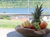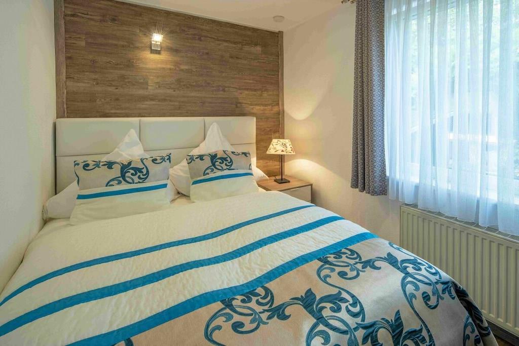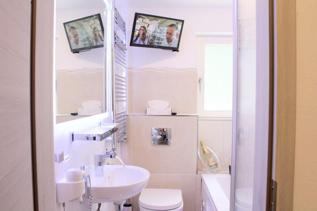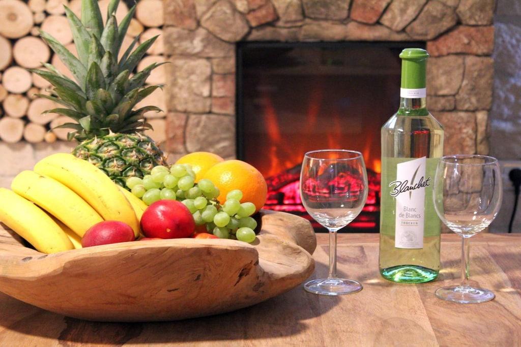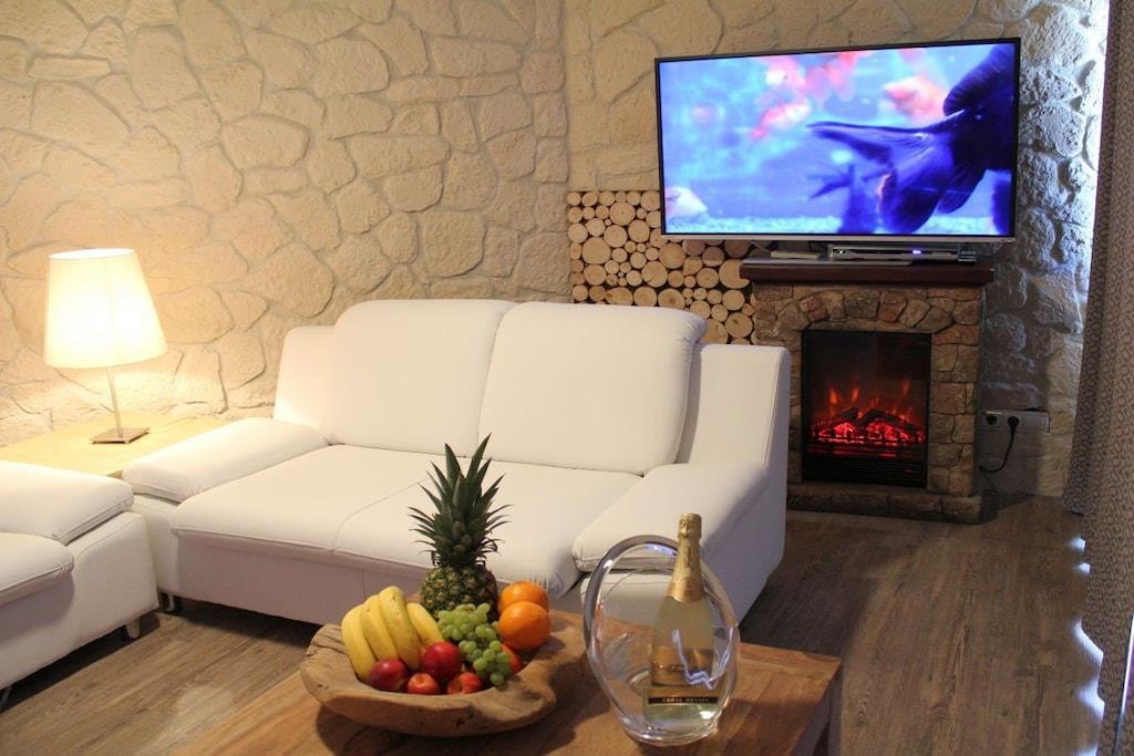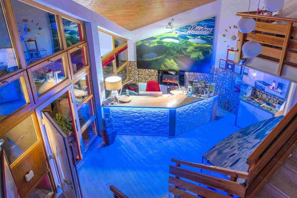 Stilvolle Ferienwohnung im "Maarberg Resort" in Schalkenmehren am See. Mit 2 Personen-Whirlpool, Nichtraucherwohnung. Alle Informationen auch auf unserer Website www.villa1.de Elegante, komplett neu eingerichtete Ferienwohnung mit ca. 58 m² Wohnfläche, Balkon mit Blick auf den See und den Zierteich. Die Ferienwohnung Maarpanorama liegt im Mittelgeschoß (Ebenerdig zum Haupteingang) und bietet einen atemberaubenden Blick auf den See, die herrliche Landschaft und den gepflegten Zierteich. Sitzen Sie in der Ferienwohnung oder auf dem Balkon und lassen Sie sich von dem Blick verzaubern. Im schönen Wohnraum finden Sie eine neue Sofagarnitur mit Bettfunktion und einen großen, 127 cm HD/3D Fernseher der neuen Generation. Sie haben die Auswahl von vielen verschiedenen Fernseh- und Radiosendern in vielen Sprachen von 4 verschiedenen Satelliten. Zudem gibt es einen 3D Blueray Player und DVD-Player. Auch eine Musikanlage mit Radio, CD usw. befindet sich in der Wohnung. Die Wohnung verfügt über einen WIFI Internetzugang. Internet / Wlan / Wifi: Kostenlos nutzbar! Die hell und freundlich eingerichtete Ferienwohnung vermittelt einen naturverbundenen Flair mit viel Holz und Stein. Zudem verbreitet der Elektrokamin und ein eleganter Deckenventilator eine besondere, gemütliche Atmosphäre. So erhalten Sie auch an kalten und nassen Tagen eine besondere Urlaubsatmosphäre. Es handelt sich um eine Nichtraucherwohnung (Raucher bitte den Balkon oder Außenbereich benutzen) Die neue Einbauküche hat einen 4 Plattenherd (Ceranfeld) und Backofen, Spülmaschine, Kühlschrank mit Gefrierfach, Mikrowelle, 2 Kaffeemaschinen (1 x Filtermaschine und 1 x Bosch-Tassimo Maschine), Toaster, Wasserkocher usw. Töpfe und Pfannen sowie Besteck und Geschirr für die höchstmögliche Personenzahl sind selbstverständlich vorhanden. Ebenso Toilettenpapier, Geschirrtücher und ähnliches. Ein Kinderbett und Hochstuhl können kostenlos bereitgestellt werden. Die Essecke ist für bis zu 6 Personen geeignet. Die Ferienwohnung verfügt über 2 Separate Schlafzimmer mit hochwertigen Boxspringbetten (180 cm x 200 cm und 140 cm x 200 cm). So steht einem guten Schlaf nichts mehr im Wege. Das zweite Schlafzimmer verfügt über ein franz. Doppelbett mit 140 cm Breite. Zudem blicken Sie auch aus dem größeren Schlafzimmer auf den See! Zudem gibt es Ganzkörperspiegel in den Schlafzimmern. Im Wohnraum befindet sich als zusätzliche Schlafmöglichkeit ein neues Doppelschlafsofa. Im hellen Bad finden Sie einen 2 Personen-Whirlpool. Verwöhnen Sie sich selbst im Whirlpool mit einer Lichttherapie und vielen weiteren Funktionen. Auch ein Radio ist integriert. Spezielles Badesalz für den Whirlpool ist kostenlos vorhanden. Im Bad befindet sich ein Flachbild-TV. Schauen Sie beim gemütlichen Bad einen schönen Film auf dem TV oder legen Sie eine gute DVD ein. Für den besonderen Genuss haben wir eine DVD mit Kaminfeuer, Sonnenaufgängen oder Aquariumfischen bereitliegen. Im Whirlpool integriert ist eine Duschvorrichtung, seitliche Massagedüsen und LED´s. Die im gesamten Bad, blau leuchtenden Boden-LED´s bieten eine tolle Atmosphäre. Ein großer, beleuchteter Spiegel, ein Hotelföhn und eine Personenwaage sind vorhanden. Moderne Heizung mit Handtuchwärmer. Zur Ferienwohnung gehört ein schöner Balkon mit Loungesesseln und einem Cocktail- bzw. Kaffeetisch. Falls Sie auf dem Balkon auch richtig gut Essen möchten, finden Sie einen weiteren Esstisch als Klapptisch zur Wegnahme auf jeder Etage bereitstehen. Die Wohnung hat eine Zentralheizung und natürlich einen separaten Eingang. Im Haus: Empfangshalle mit Reception, Sitzmöglichkeiten und Spielen (liegen zur Nutzung bereit). Eine schöne Sauna und ein Jacuzzi befinden sich im Untergeschoss (kostenlose Nutzung). Sie können diese Einrichtungen auch alleine nutzen (abschließbar). Zudem steht im Untergeschoss ein Raum mit Waschmaschine, Wäschetrockner, Bügeleisen und Bügelbrett zur Verfügung. In der Empfangshalle erhalten Sie neben Wanderkarten und Ansichtskarten auch kostenloses Informationsmaterial zu den vielen Ausflugszielen und Freizeitmöglichkeiten in der Region. Zudem befindet sich in der Empfangshalle ein Getränkekühlschrank mit Getränken zur Wegnahme auf Vertrauensbasis. Der Außenbereich wird Sie begeistern! Zwei wundervoll und aufwendig angelegte Zierteiche mit Kois und anderen Fischen, 2 Wasserfälle, 2 Bachläufe und eine gepflegte Zierkiesanlage gehören zur Anlage. Im oberen Teich befinden sich auch Schildkröten. Sitzen Sie gemütlich bei einem Kaffee oder einem Cocktail auf dem Balkon oder der Terrasse und schauen Sie den Fischen und den Schildkröten zu. Oder blicken Sie ins Tal auf den See. Weiter im Außenbereich zu finden: genügende Parkmöglichkeiten, ein Fahrradabstellplatz innen (abschließbar) und außen. Die Apartmentanlage "Maarberg Resort" liegt herrlich in Hanglage, am Ortrand von Schalkenmehren am See, ruhig am Waldrand. Bis zum See und zum Ortskern sind es nur ca. 600 m. Im Ort gibt es gute Restaurants, Cafes und eine Einkaufsmöglichkeit. In der 5 km entfernten Kreisstadt Daun finden Sie zusätzlich viele Einkaufsmöglichkeiten und Supermärkte. Die Wohnung hat eine Zentralheizung und natürlich einen separaten Eingang. Zahlung: Sie können bei uns in folgender Form zahlen: - Per Überweisung im Vorfeld - Per Einzug mit Kreditkarte (Visa, Mastercard) - Per Paypal über unsere e-mail Adresse - Bei kurzfristig getätigten Buchungen können Sie auch vor Ort an unserer Reception im Haupthaus (Maarberg Resort in Schalkenmehren) in bar, mit EC-Karte oder mit der Kreditkarte (Visa, Mastercard) zahlen.