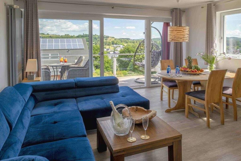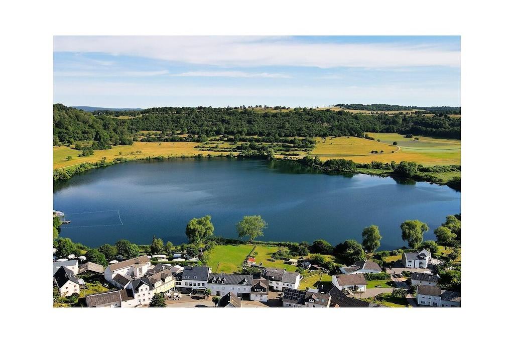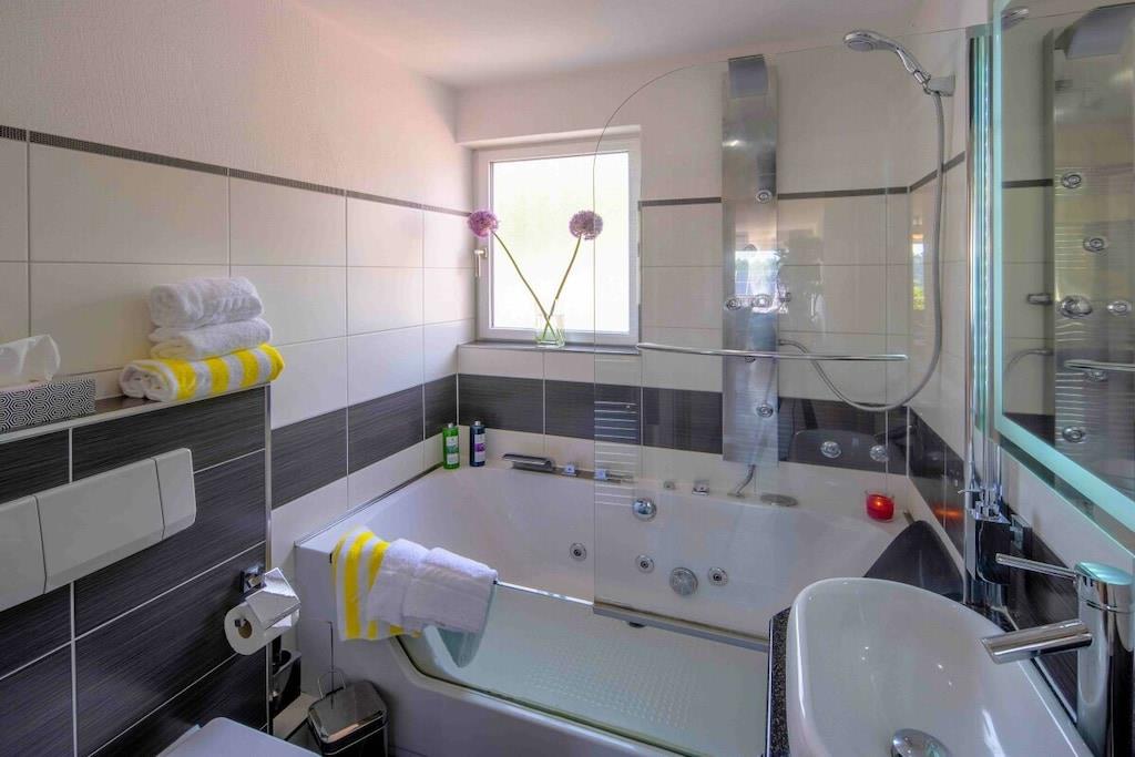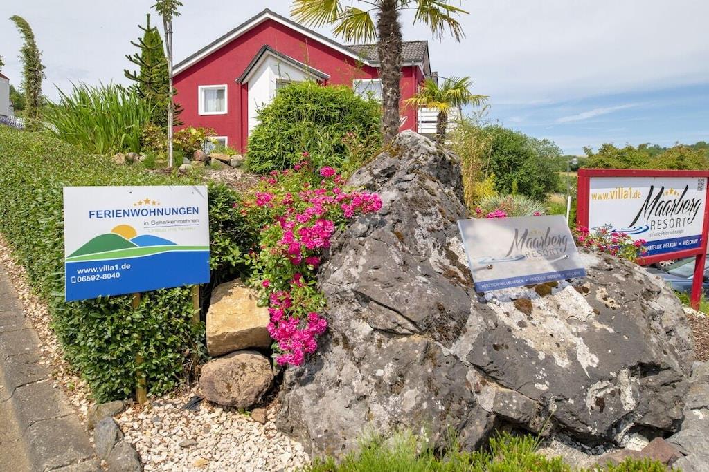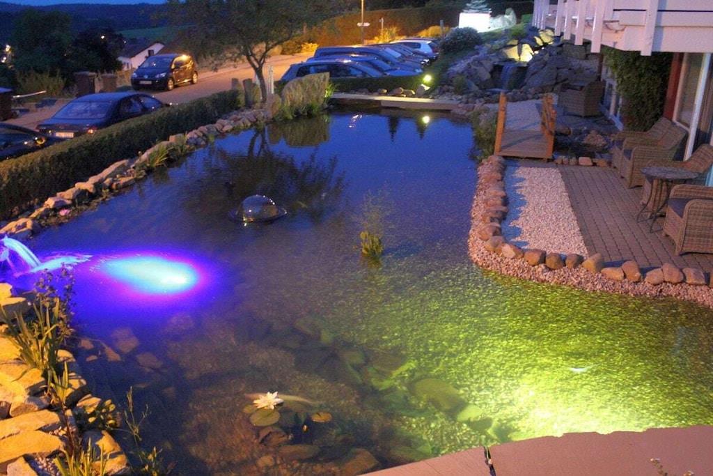 Stilfuld ferielejlighed i lejlighedskomplekset "Maarberg Resort" i Schalkenmehren am See. Med 2-personers spabad! Ikke-ryger lejlighed. Lejlighedskomplekset "Maarberg Resort" er nyrenoveret og istandsat. Det er smukt beliggende i udkanten af Schalkenmehren am See. En rolig beliggenhed på en bjergskråning i udkanten af skoven. Søen og bymidten ligger kun omkring 400 meter væk. Byen byder på gode restauranter, caféer og et shoppingområde. I bymidten Daun, 5 km væk, finder du også mange butikker og supermarkeder. Fra nogle af lejlighederne i Maarberg Resort kan du nyde en smuk udsigt over søen. Hver lejlighed har Wi-Fi. Internet/Wi-Fi: Gratis brug i alle værelser! I bygningen: Lobby med reception, siddepladser og spil (tilgængelige til brug). Den nye sauna og jacuzzi er placeret i kælderen i "Maarberg Resort" (fri brug). Du kan også bruge disse faciliteter alene (aflåselige). Der er også et rum i kælderen med vaskemaskine, tørretumbler, strygejern og strygebræt. I receptionshallen finder du vandrekort og postkort samt gratis information om de mange udflugtsmål og fritidsaktiviteter i regionen. Der er også et køleskab med drikkevarer i receptionshallen, hvor drikkevarer kan købes på betingelse af køb. Udendørsområdet vil glæde dig! To smukt og udsmykkede pryddamme med koi og andre fisk, to vandfald, to bække og et velholdt dekorativt grusområde er en del af ejendommen. Der er også skildpadder i den øvre dam. Sid komfortabelt med en kaffe eller cocktail på balkonen eller terrassen og se på fiskene og skildpadderne. Eller kig ned i dalen ved søen. Yderligere udendørsområder inkluderer rigelig parkering og en cykelparkering. En grillplads med udsigt over søen er placeret bag huset. Maarhöhe Ferielejlighed i Maarberg Resort: Elegant, helt nyindrettet ferielejlighed til 2 til 6 personer. Cirka 54 kvm boligareal, balkon ud mod søen og den nederste pryddamme med en vidunderlig panoramaudsigt over søen, de to pryddamme, vandfaldene, bække og det dekorative grusområde. Maarhöhe ferielejlighed ligger på øverste etage (1 trappe op). I den smukke stue finder du et nyt sofasæt, der kan laves om til en seng, og et stort 127 cm HD/3D-tv af den nyeste generation. Du kan vælge mellem cirka 3.000 forskellige tv- og radiokanaler på mange sprog fra 4 forskellige satellitter. Der er også en 3D Blu-ray-afspiller og DVD-afspiller. Et musikanlæg med radio, CD osv. er også placeret i lejligheden. Internetadgang med Wi-Fi er tilgængelig. Den lyse og indbydende lejlighed udstråler et naturligt præg med masser af træ og sten. Den elektriske pejs og en elegant loftsventilator skaber også en særlig, hyggelig atmosfære. Dette skaber en særlig feriestemning, selv på kolde og våde dage. Dette er en ikke-ryger lejlighed (rygere bedes benytte balkonen eller udendørsområdet). Det nye køkken har et 4-brænder komfur (keramisk kogeplade) og ovn, opvaskemaskine, køleskab med fryser, mikrobølgeovn, 2 kaffemaskiner (filter- og pod-maskine, Bosch Tassimo). Brødrister, elkedel osv. Gryder og pander samt bestik og service til det maksimale antal personer er naturligvis til rådighed. En barneseng og højstol kan stilles til rådighed gratis. Spiseområdet er egnet til 4 personer. Lejligheden har 2 separate soveværelser med boxmadras af høj kvalitet (180 cm x 200 cm og 140 cm x 200 cm). Intet står i vejen for en god nats søvn. Det andet soveværelse har en 140 cm bred fransk dobbeltseng. Du kan også nyde udsigten over søen fra det større soveværelse! Der er også spejle i fuld længde i soveværelserne. Stuen har en ny dobbelt sovesofa for ekstra soveplads. Badeværelset har spabad! Det lyse badeværelse har spabad. Forkæl dig selv i spabadet. Badeværelset er udstyret med satellit-tv med dvd-afspiller. Der er også radio med USB-port. Specielle badesalte til spabadet stilles til rådighed gratis. Spabadet har et brusetilbehør med regnbruser, sidemassagedyser og LED-lys. De blå LED-gulvlamper i hele badeværelset skaber en vidunderlig atmosfære. Der er et stort, oplyst LED-spejl, en hotelhårtørrer og en badevægt. Moderne varme med håndklædetørrer. Lejligheden har en dejlig balkon med liggestole og et cocktail- eller sofabord. Hvis du gerne vil nyde et rigtig godt måltid på balkonen, finder du et andet spisebord, der kan foldes ned til hver etage.