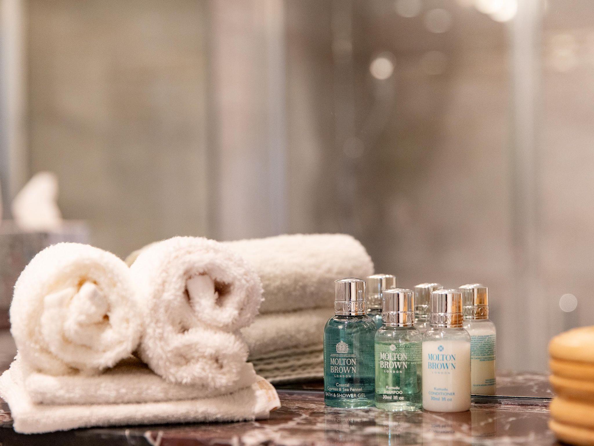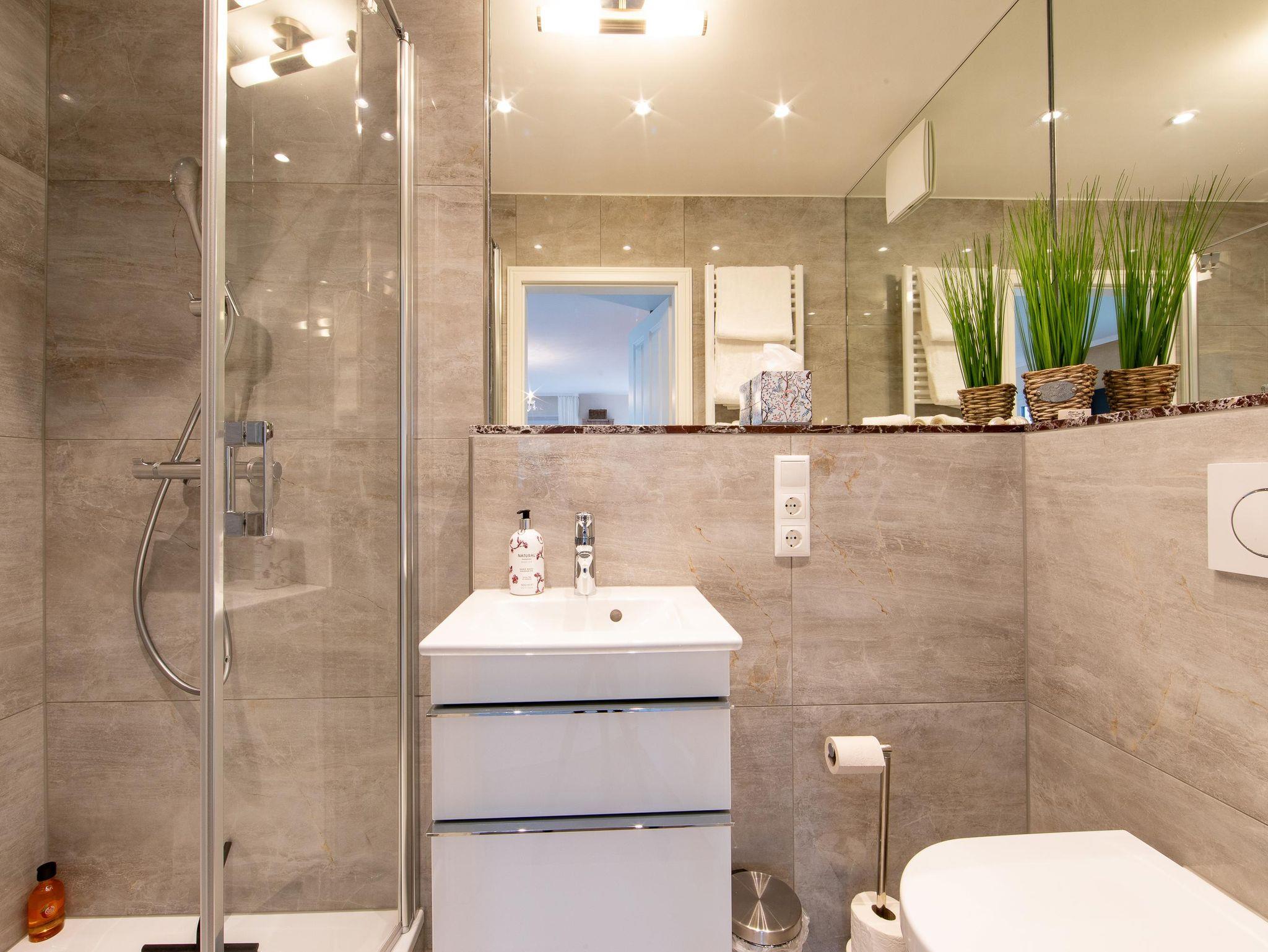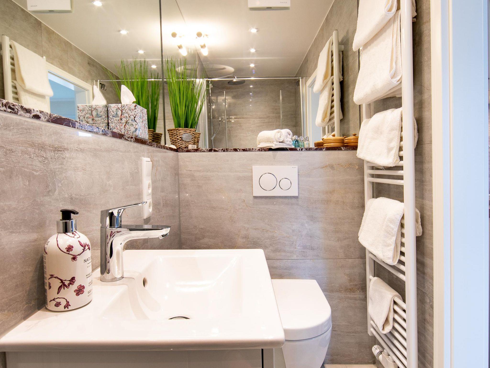 • Exklusives Marmorbad mit ebenerdiger Dusche und WC, Föhn – pro Person ein Badetuch, 2 Handtücher, Gästetuch und Waschlappen