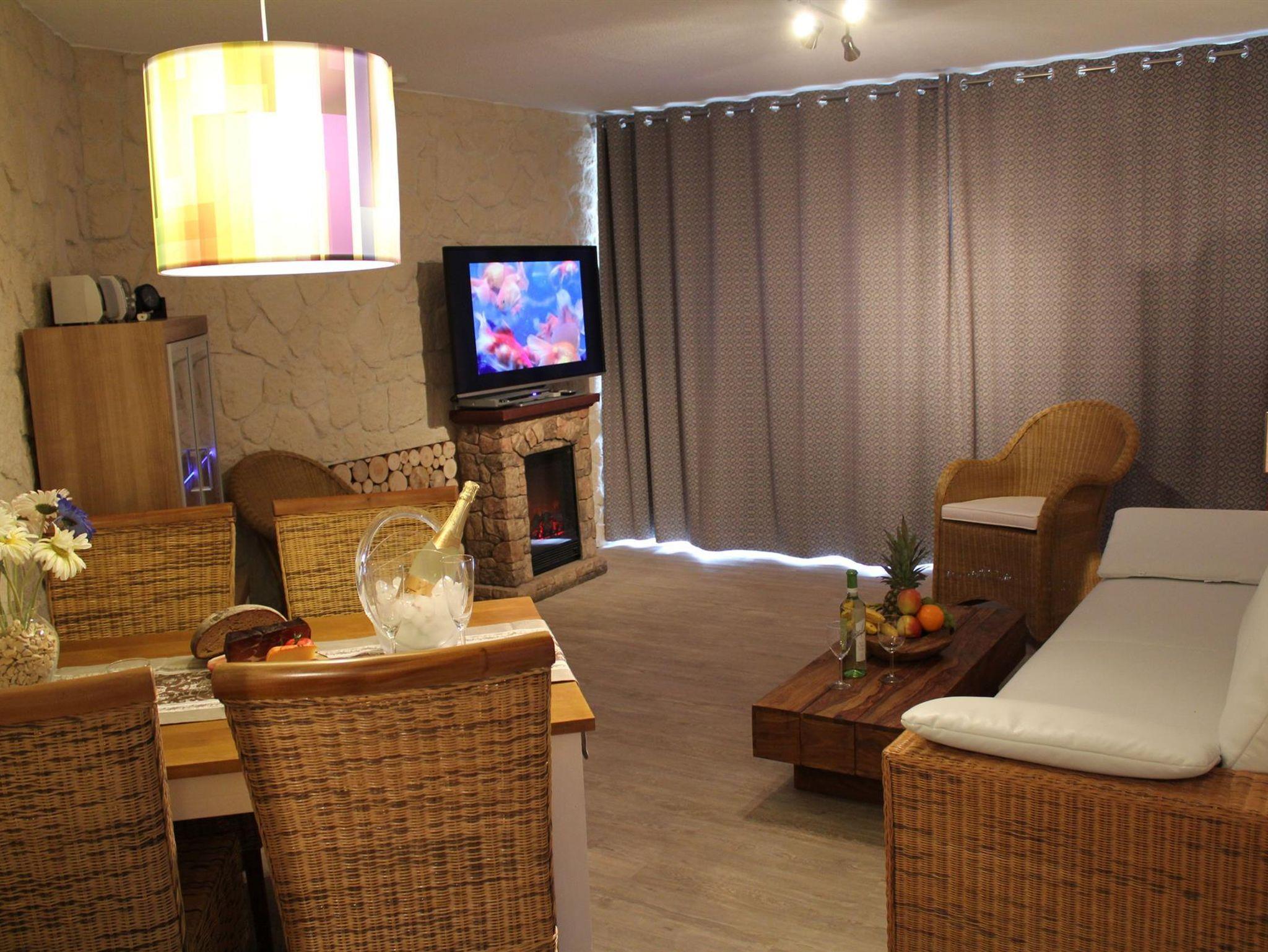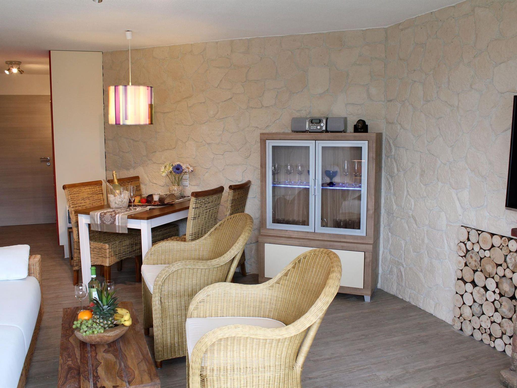 Die hell und freundlich eingerichtete Wohnung vermittelt einen naturverbundenen Flair mit viel Holz und Stein. Zudem verbreitet der Elektrokamin und ein eleganter Deckenventilator eine besondere, gemütliche Atmosphäre. So erhalten Sie auch an kalten und nassen Tagen eine besondere Urlaubsatmosphäre.
