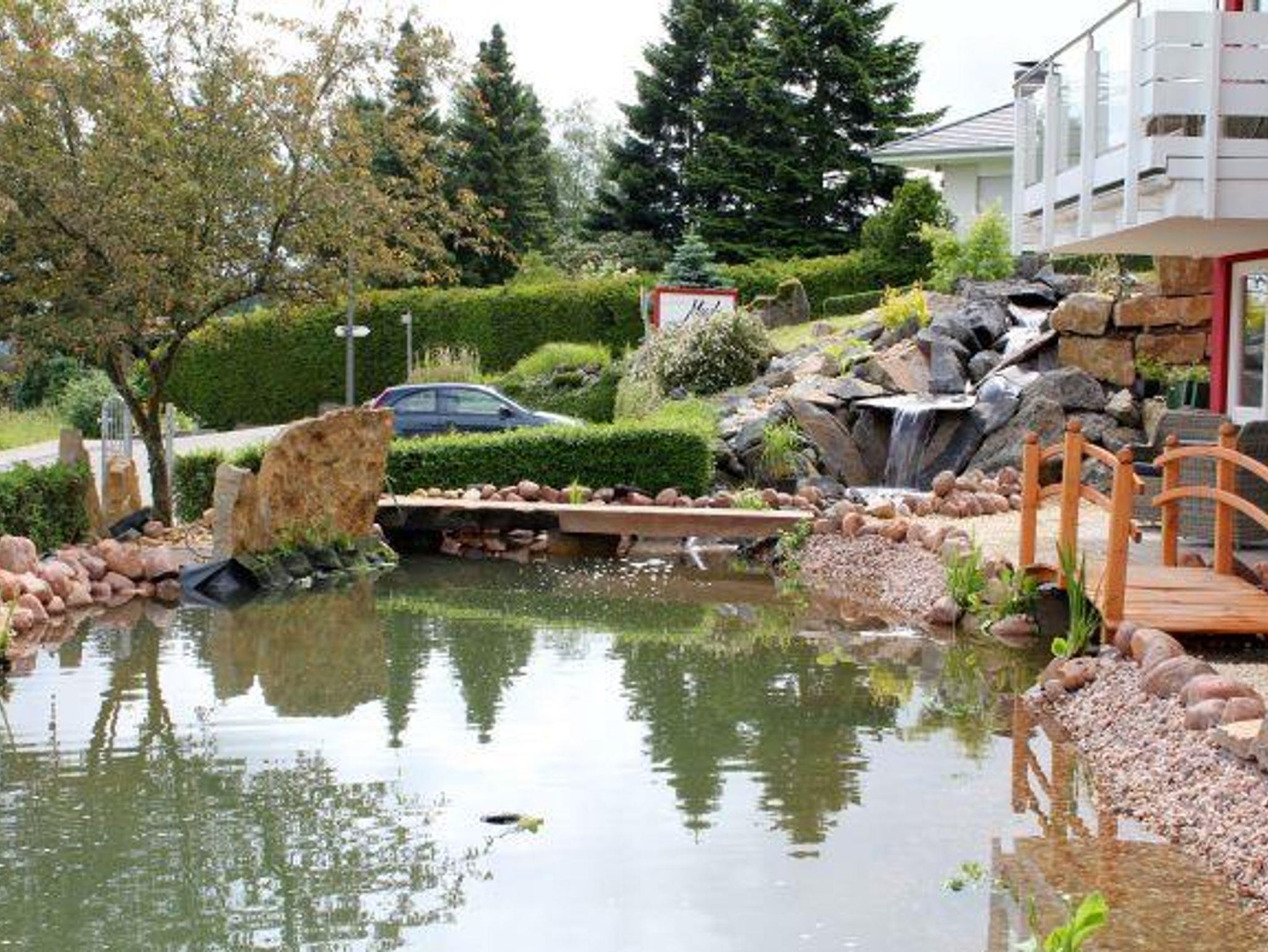 Ein wundervoller und aufwendig angelegter Zierteich mit Kois und anderen Fischen, 2 Wasserfällen und einem Bachlauf gehört zur Anlage.