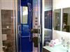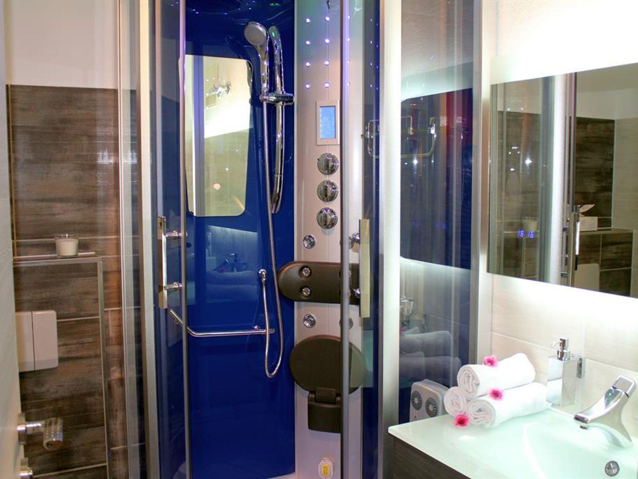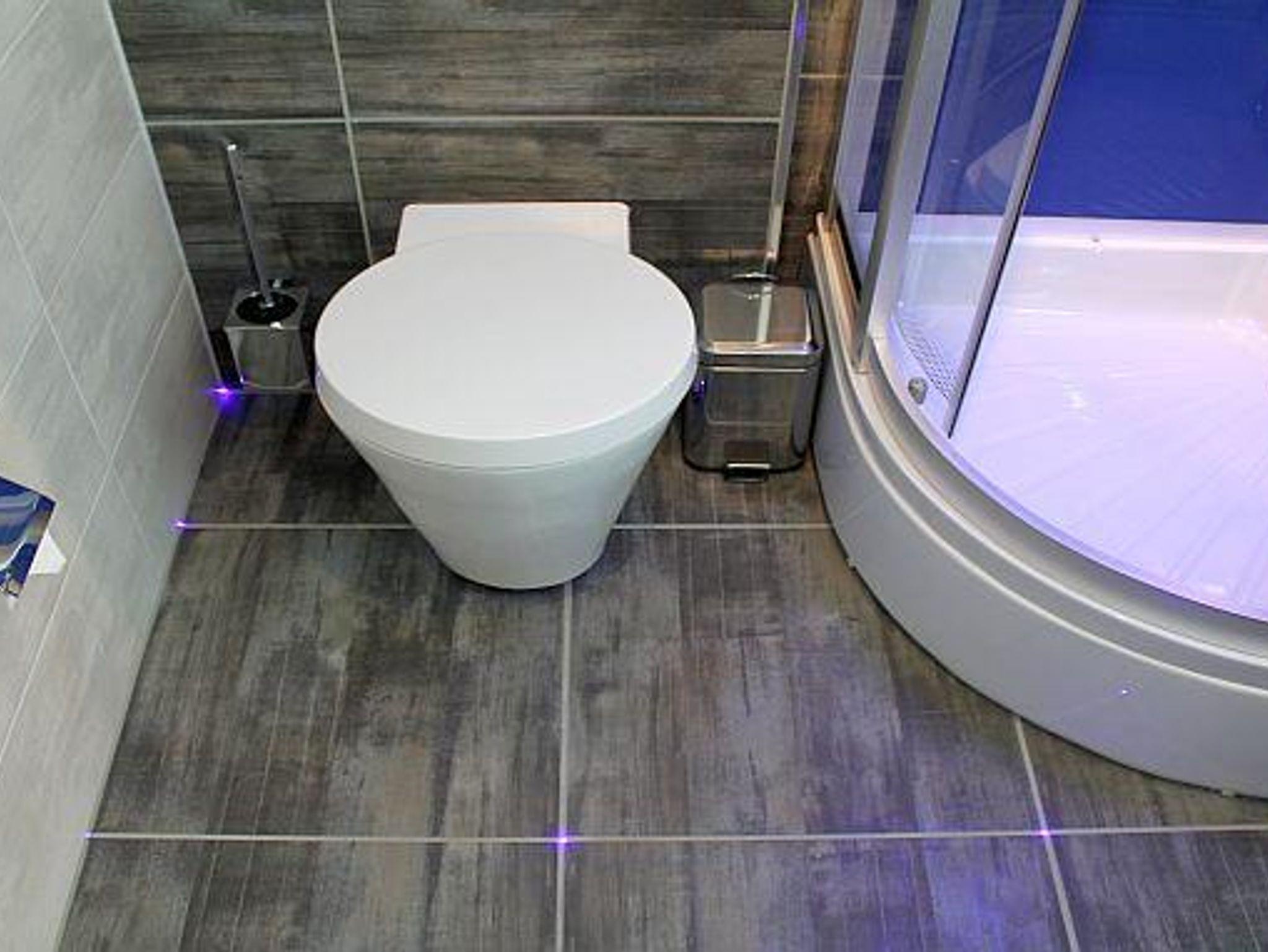 Die im gesamten Bad, blau leuchtenden Boden-LED´s bieten eine tolle Atmosphäre. Ein großer, beleuchteter Spiegel und Schminkspiegel, ein Hotelfön und eine Personenwaage sind vorhanden. Moderne Heizung mit Handtuchwärmer.