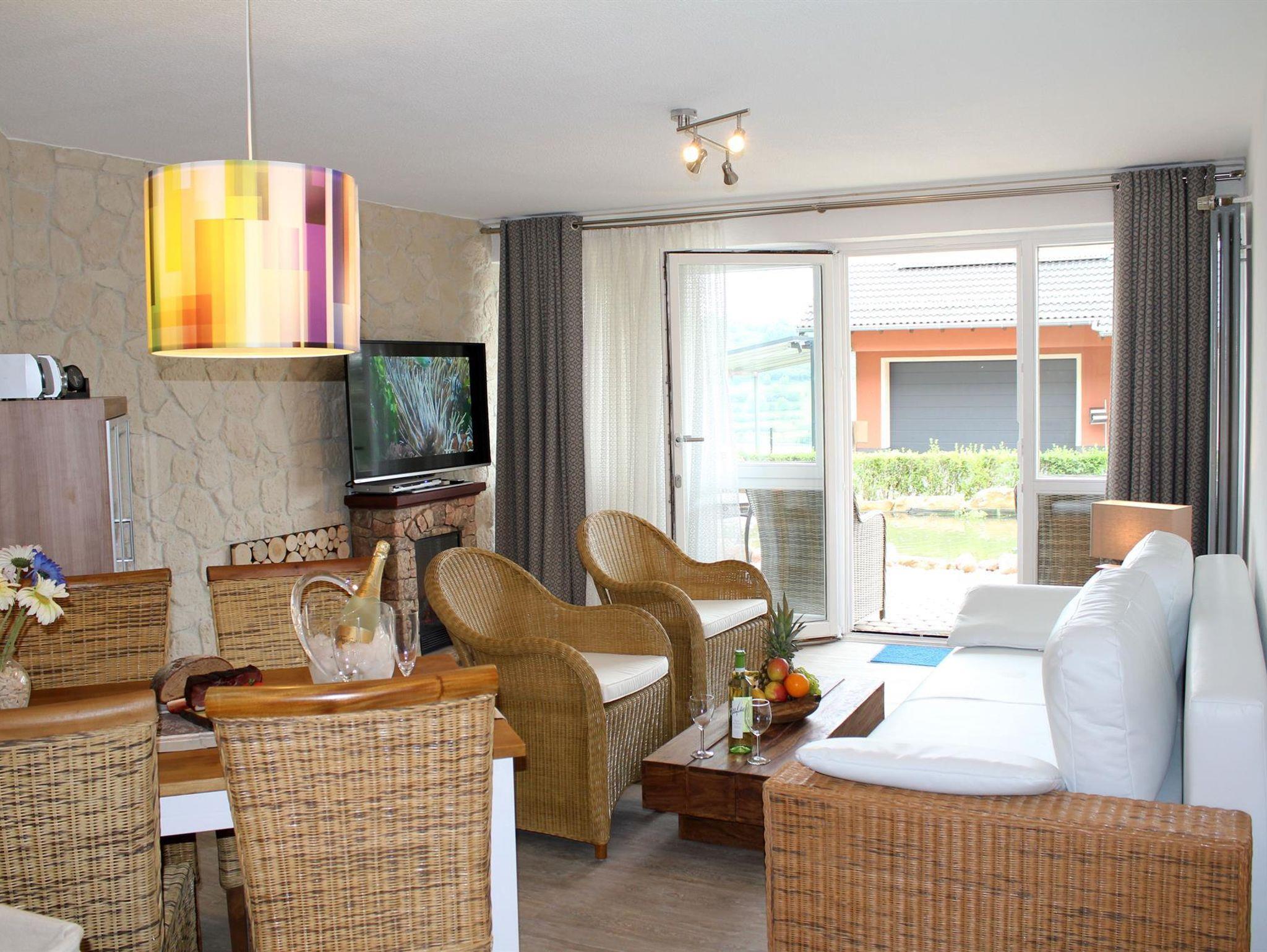 Apartment Seeterrasse im Maarberg Resort: Elegantes, komplett neu eingerichtetes Apartment für 2 bis 4 Personen. ca. 48 qm Wohnfläche, Terrasse Richtung See und Zierteich.
