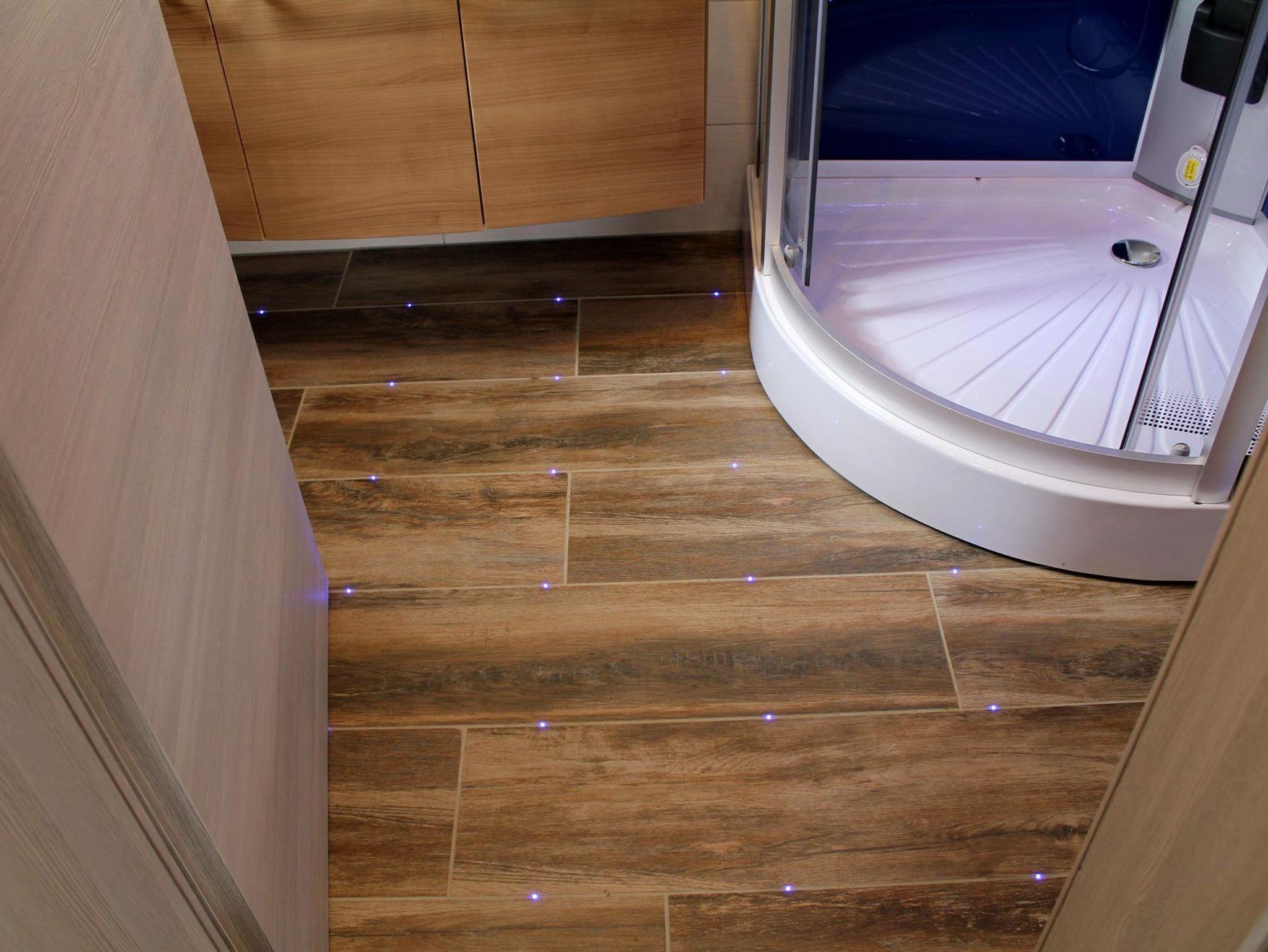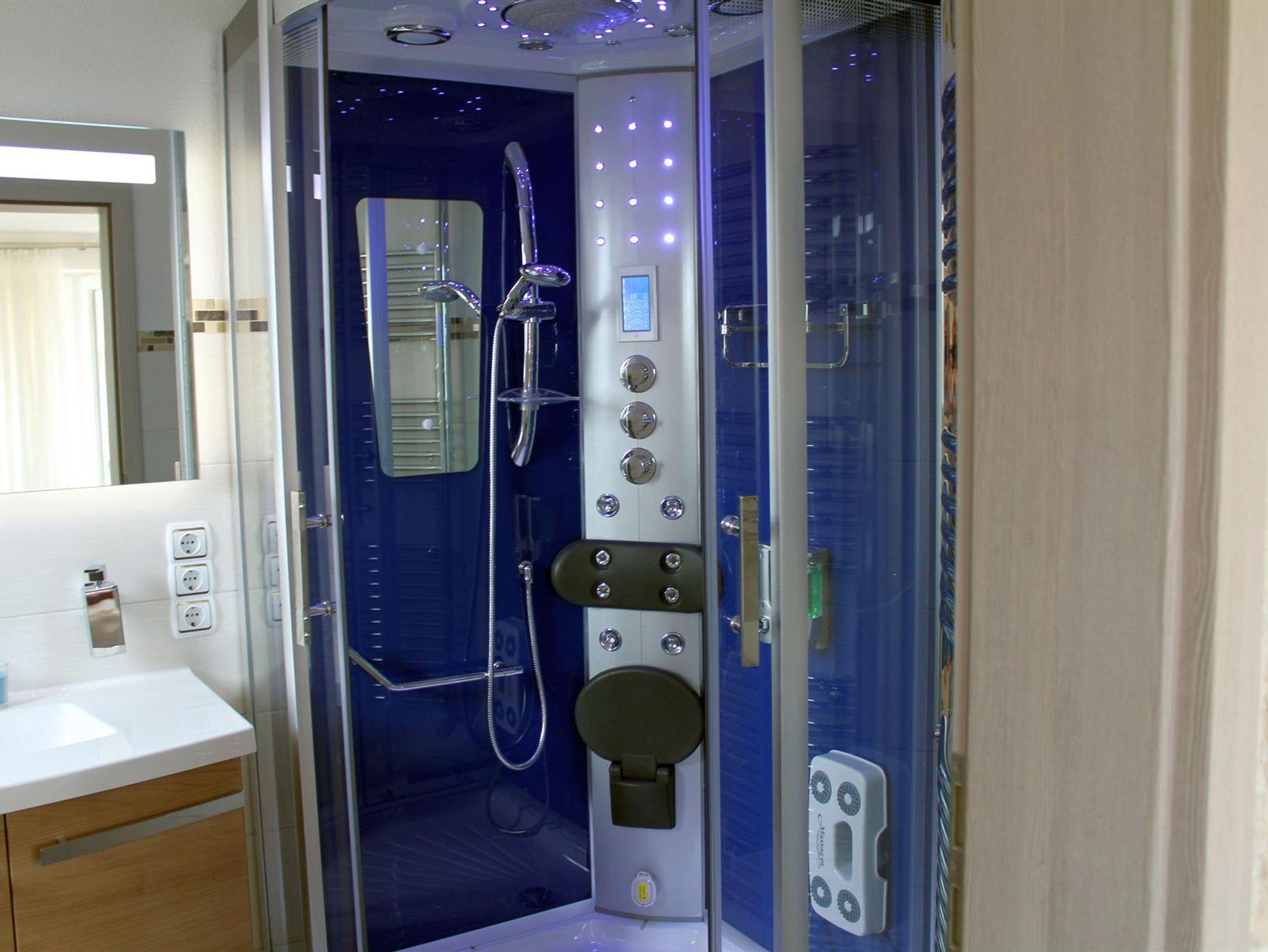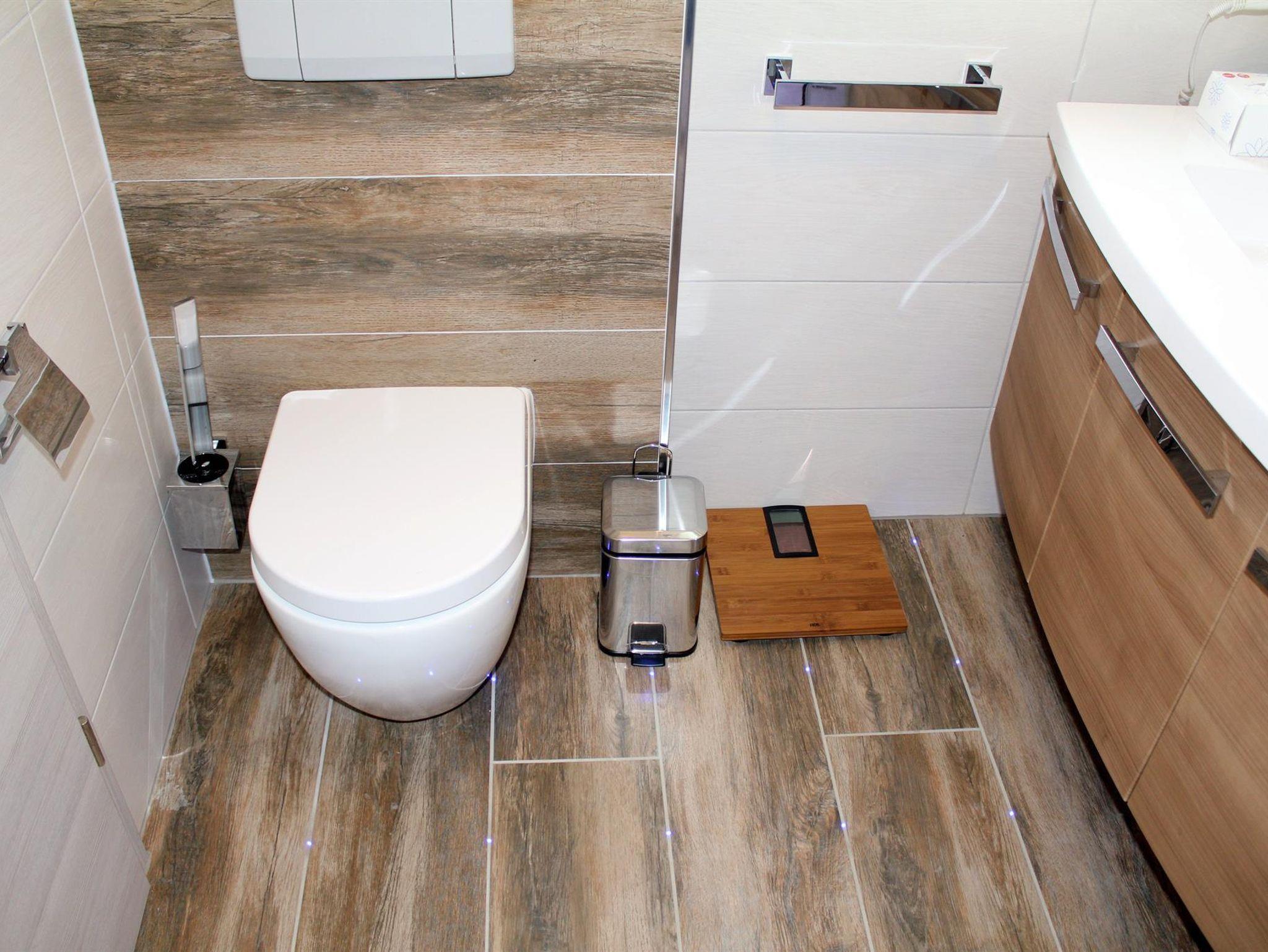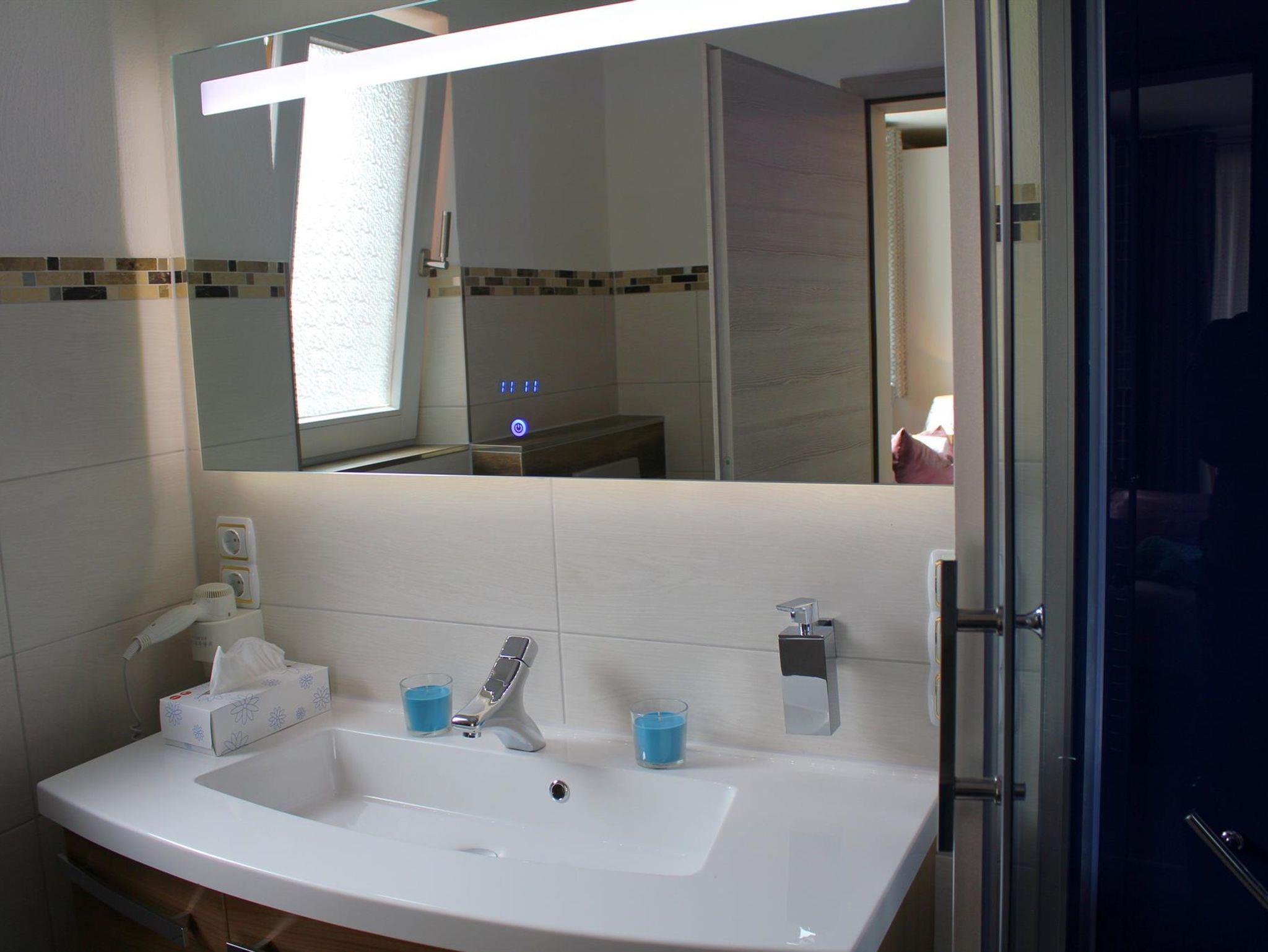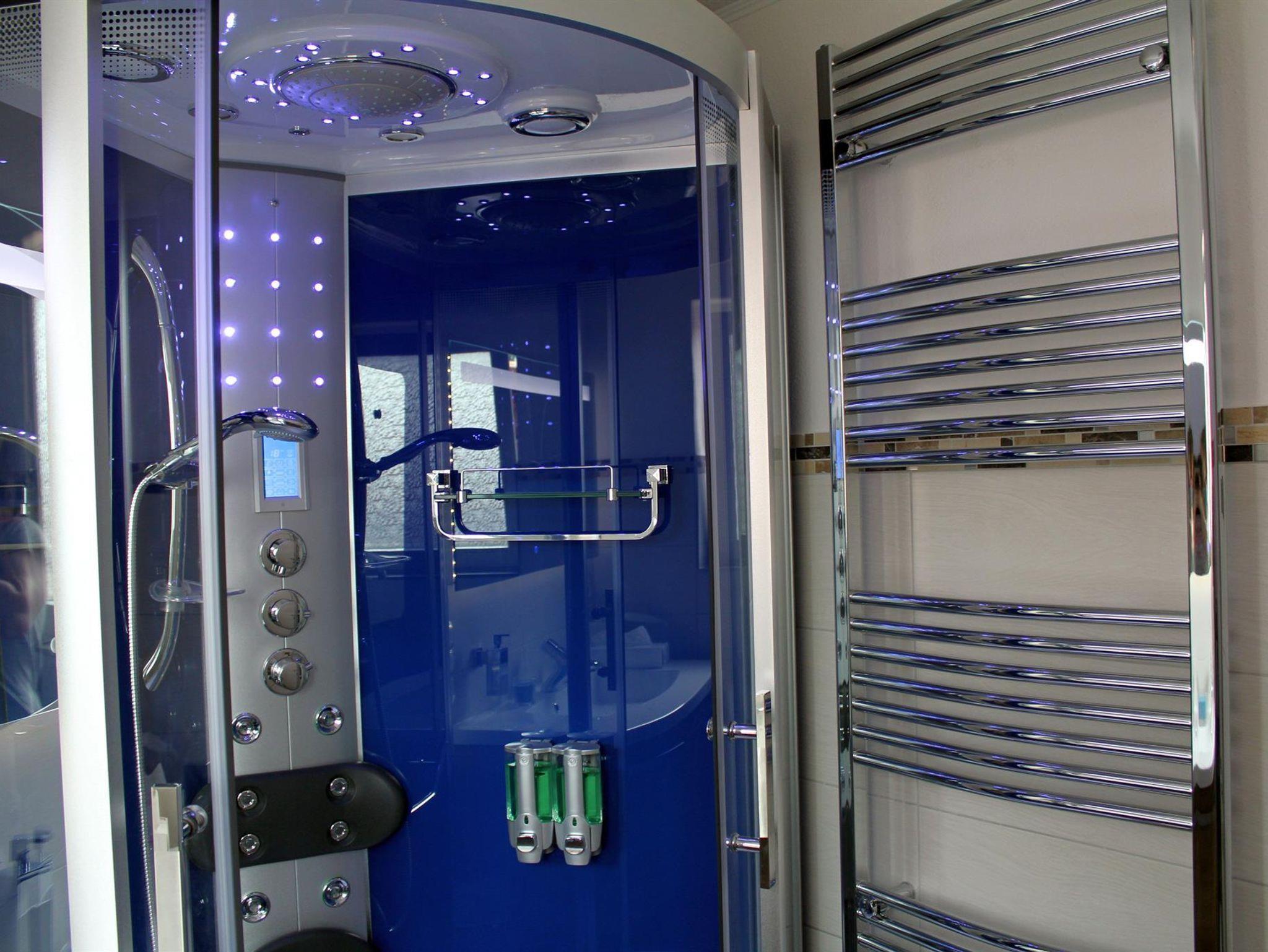 Die im gesamten Bad, blau leuchtenden Boden-LED´s bieten eine tolle Atmosphäre. Ein großer, beleuchteter Spiegel mit Uhrzeit, ein Hotelfön und eine Personenwaage sind vorhanden. Moderne Heizung aus Chrom mit Handtuchwärmer.