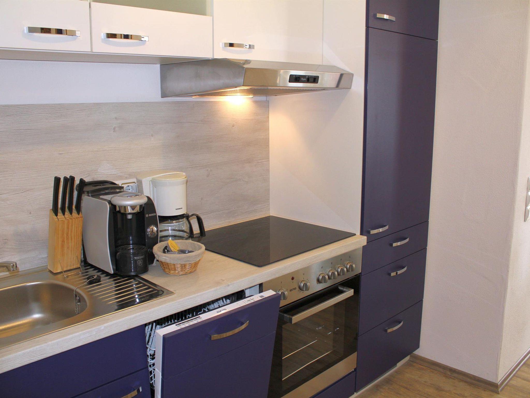Die neue Einbauküche hat einen 4 Plattenherd (Ceranfeld) und Backofen, Spülmaschine, Kühlschrank mit Gefrierfach, Mikrowelle, 2 Kaffeemaschinen (Filter und Pad Maschine, Bosch-Tassimo). Toaster, Wasserkocher usw. Töpfe und Pfannen sowie Besteck und Geschirr für die höchstmögliche Personenzahl sind selbstverständlich vorhanden.