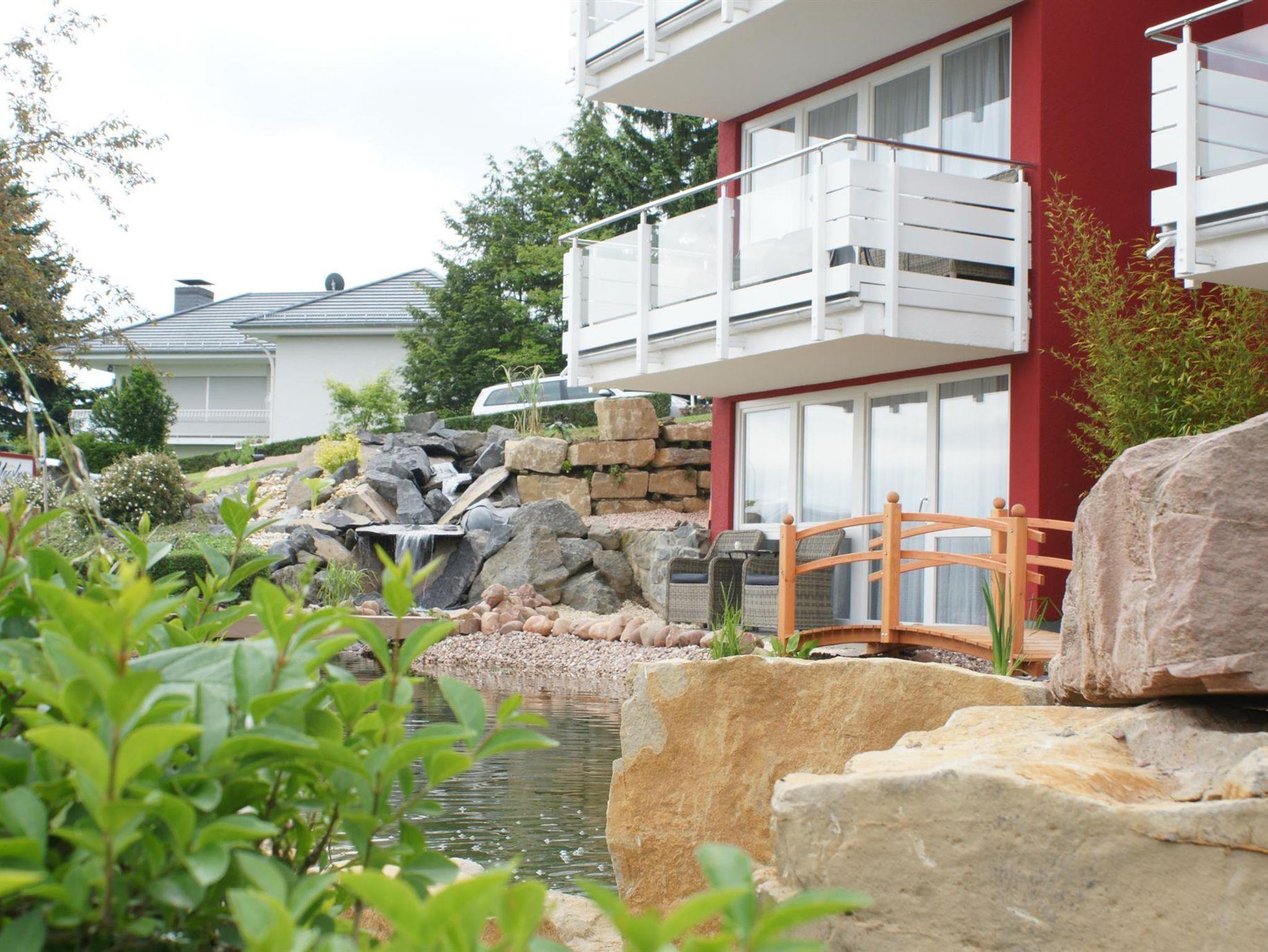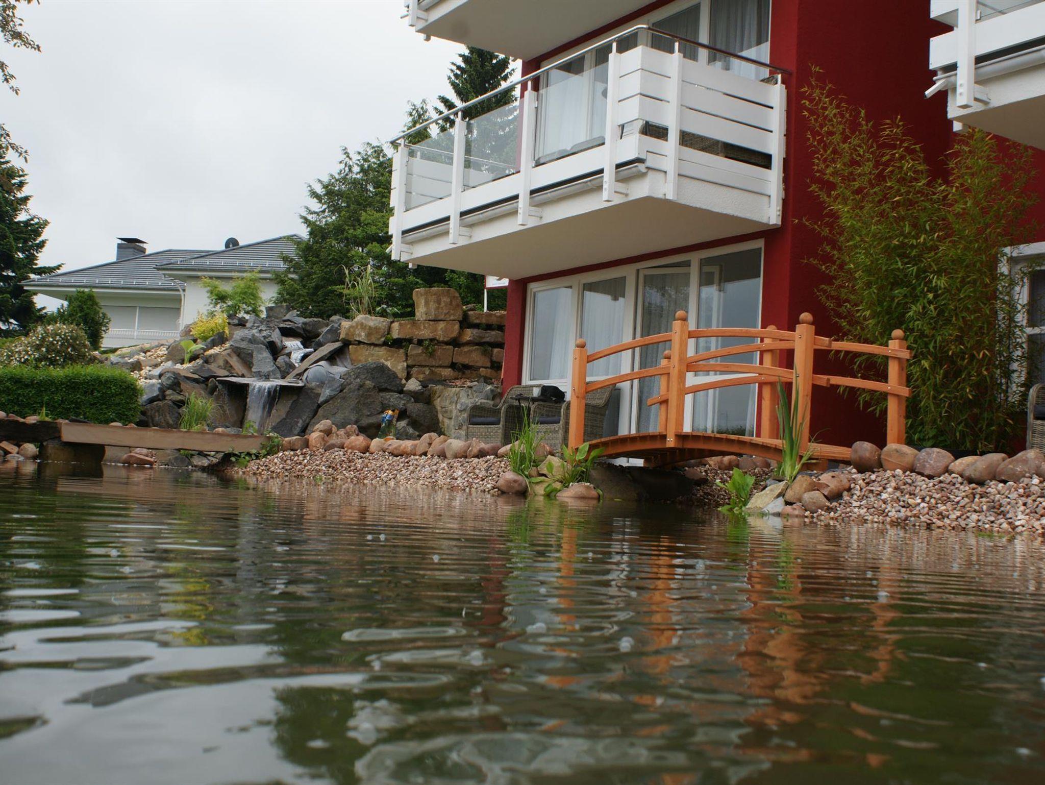 Zwei wundervoll und aufwendig angelegte Zierteiche mit Kois und anderen Fischen, 2 Wasserfälle, 2 Bachläufe und eine gepflegte Zierkiesanlage gehören zur Anlage. Die Aussenanlagen sind abends romantisch angestrahlt. In den Teichen befinden sich auch Schildkröten. Sitzen Sie gemütlich bei einem Kaffee oder einem Cocktail auf dem Balkon oder der Terrasse und schauen Sie den Fischen und den Schildkröten zu. Oder blicken Sie ins Tal auf den See.