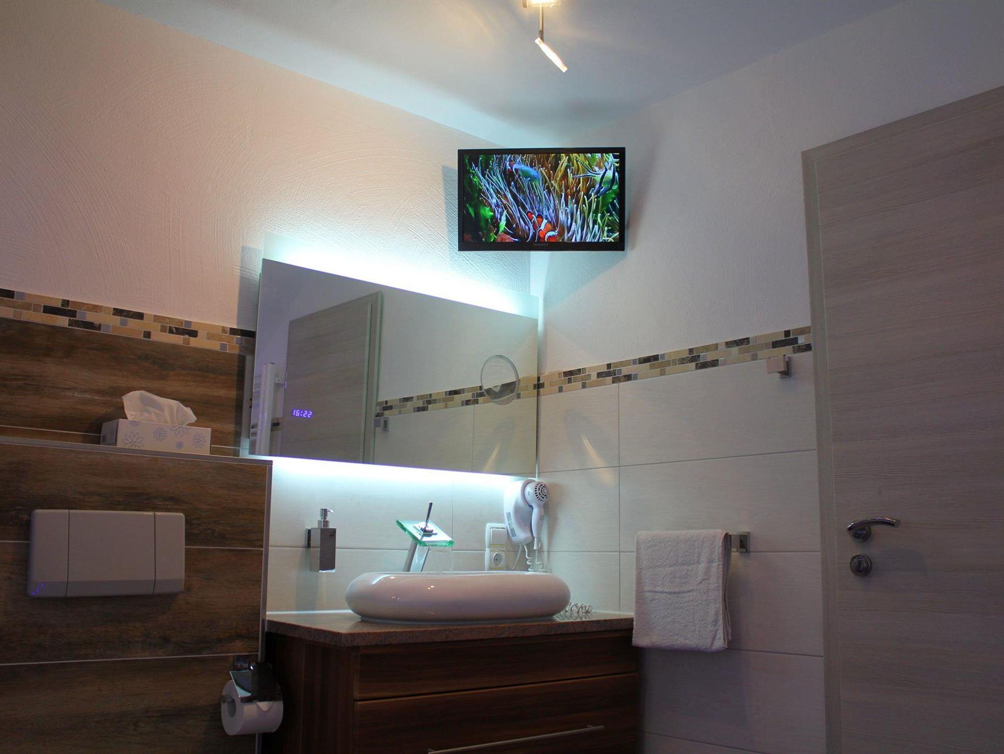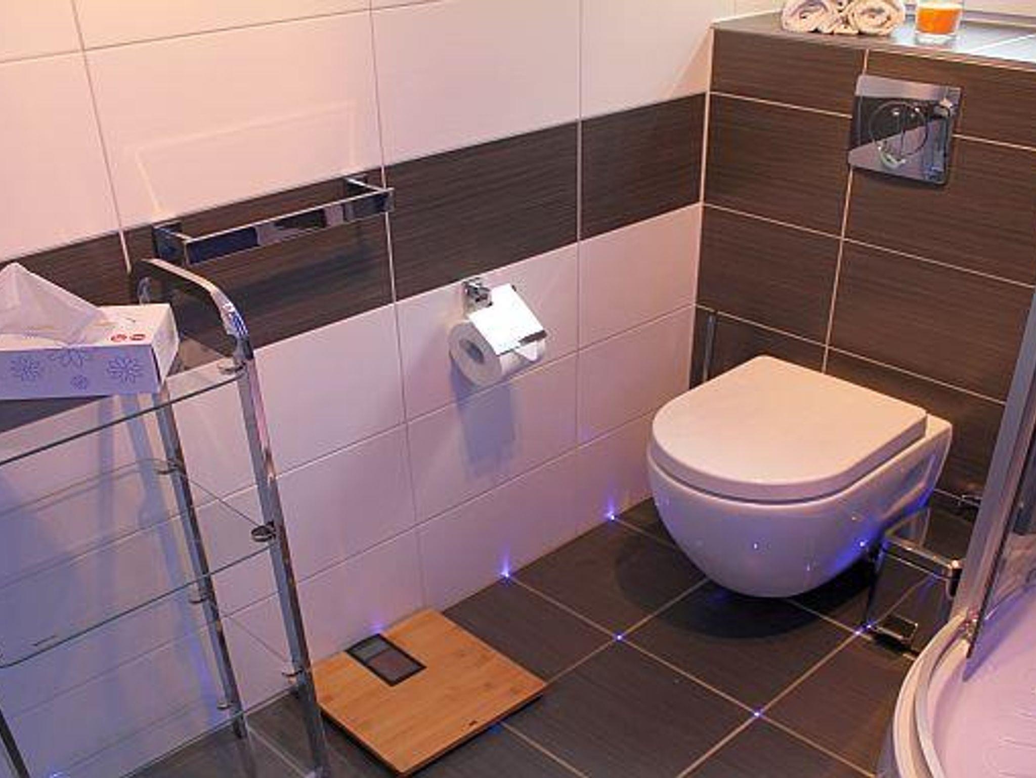 Die im gesamten Bad, blau leuchtenden Boden-LED´s bieten eine tolle Atmosphäre. Ein großer, beleuchteter Spiegel, ein Hotelfön und eine Personenwaage sind vorhanden. Moderne, Chrom-Heizung mit Handtuchwärmer.