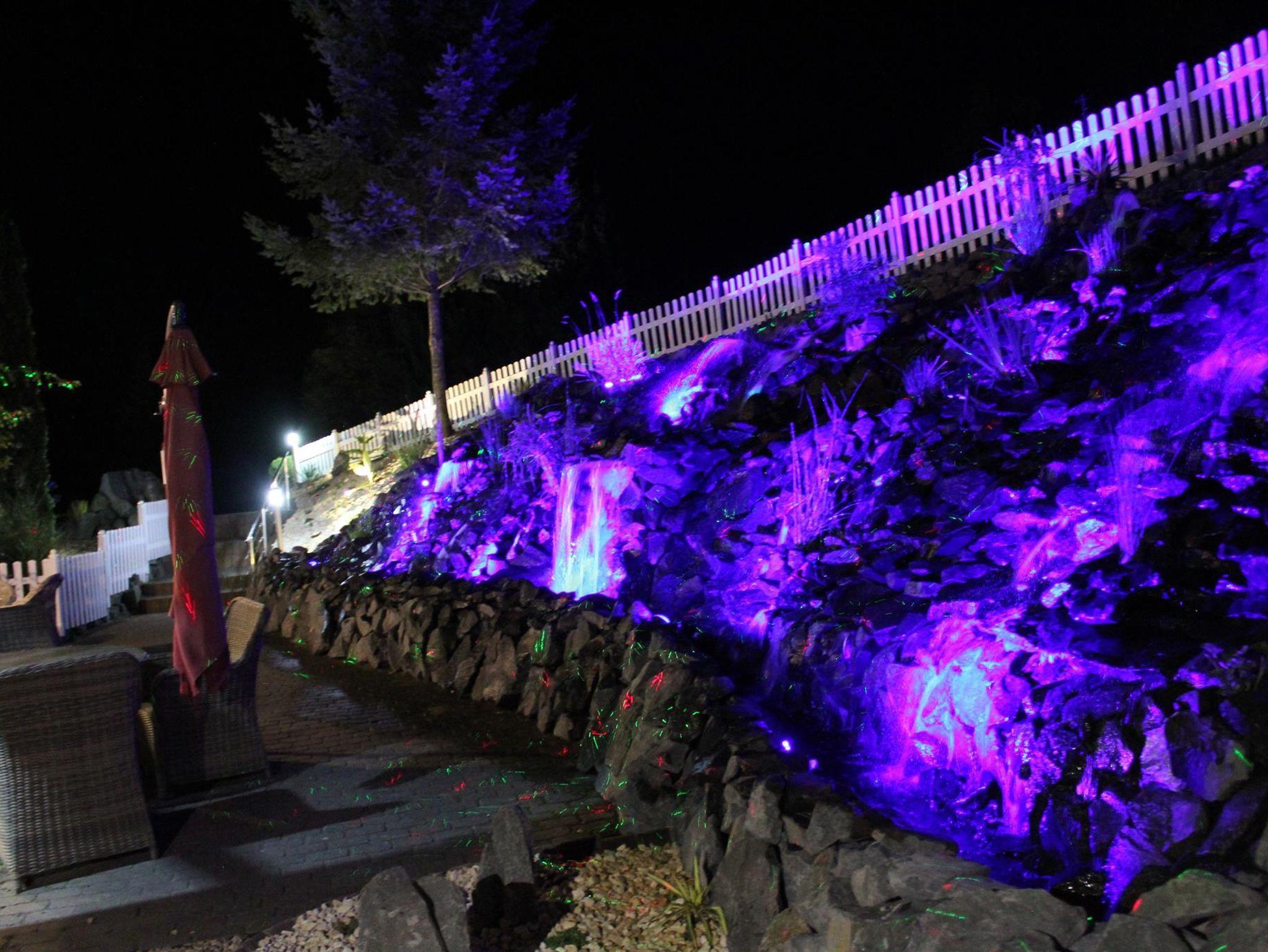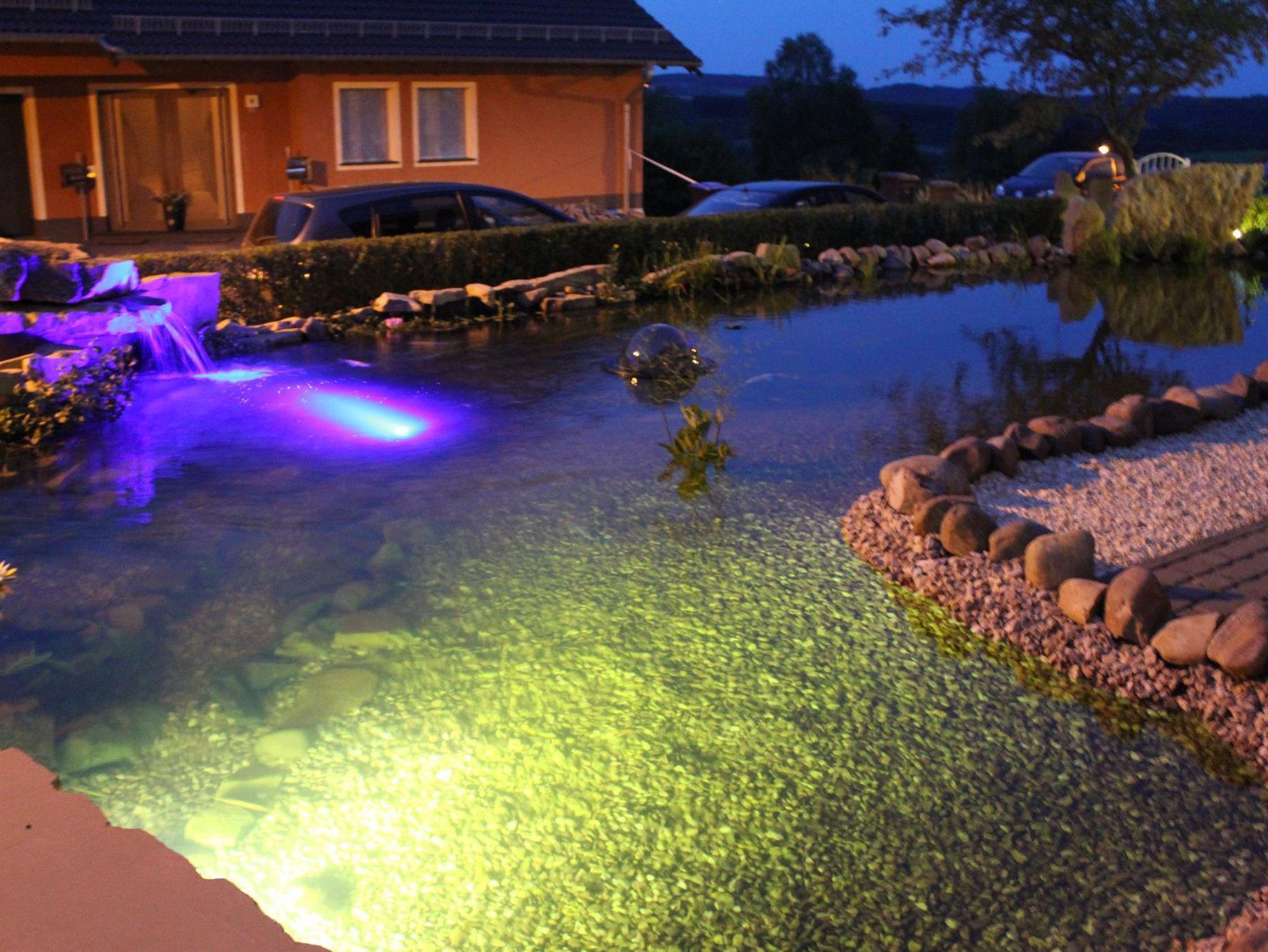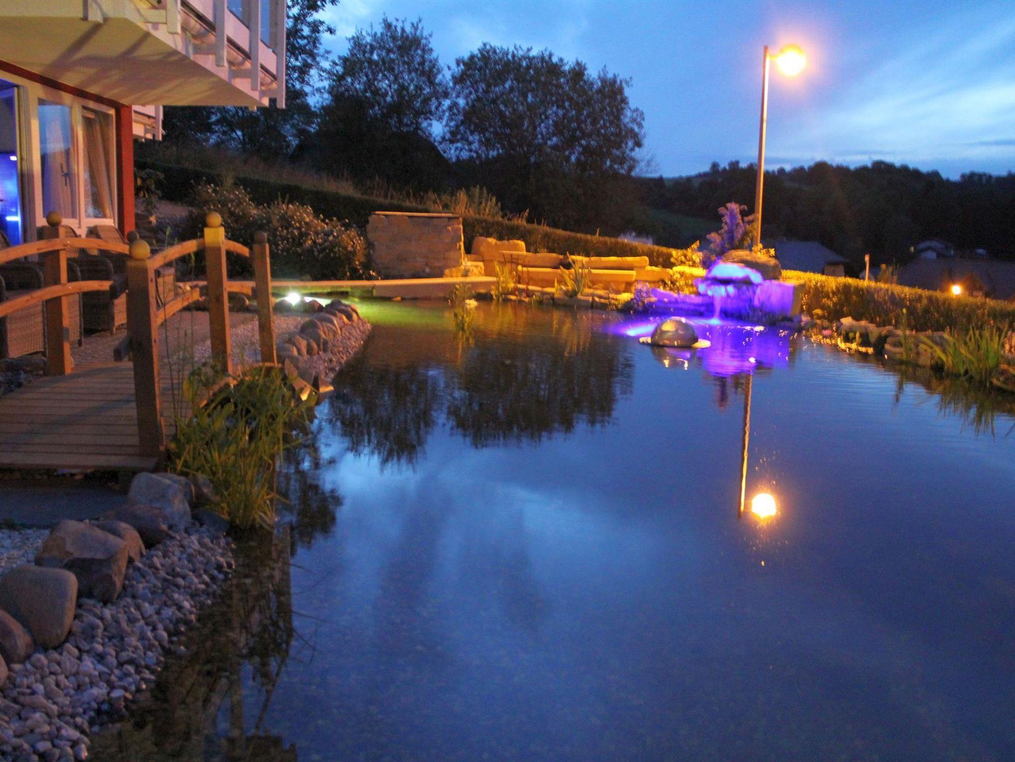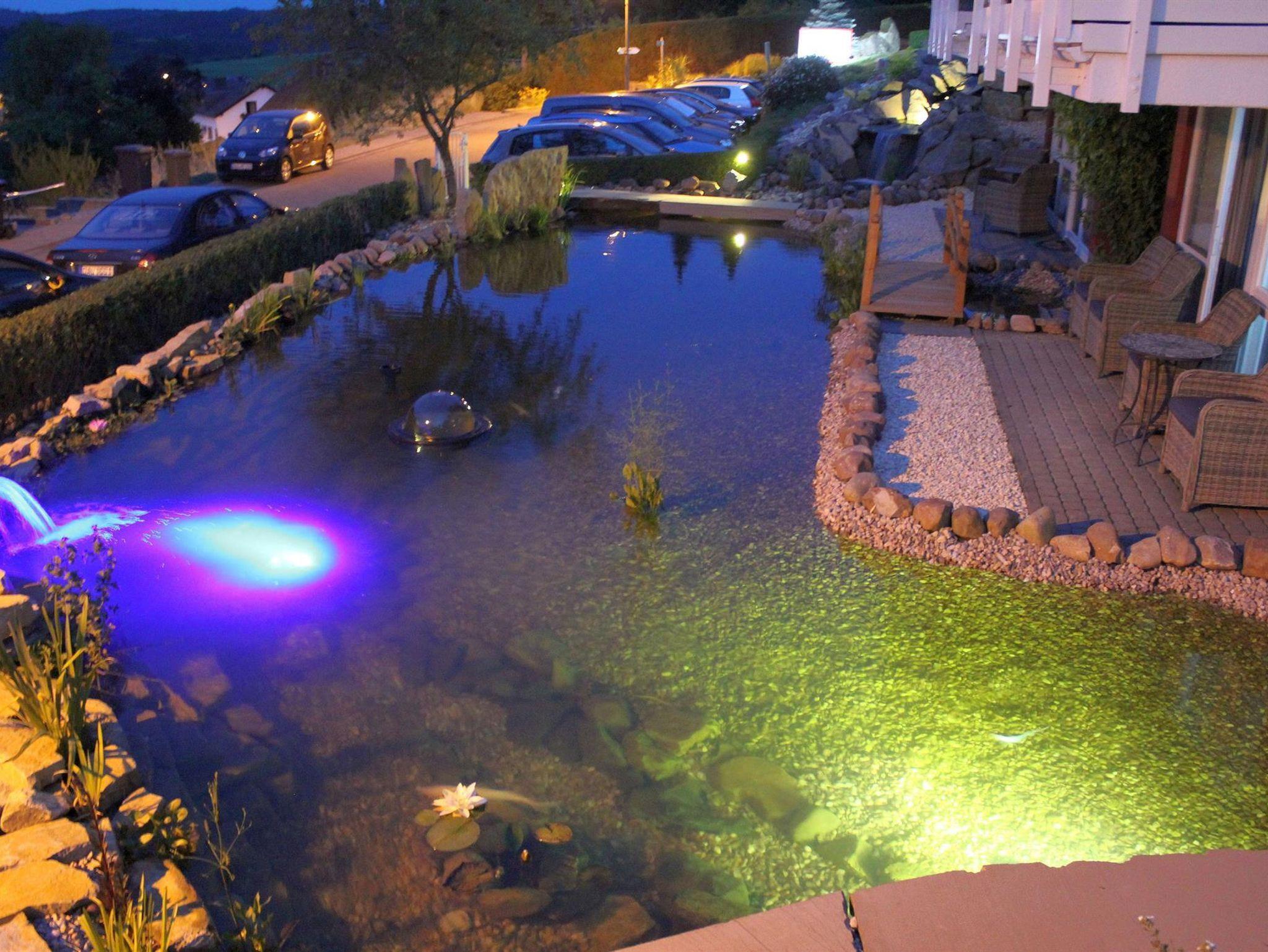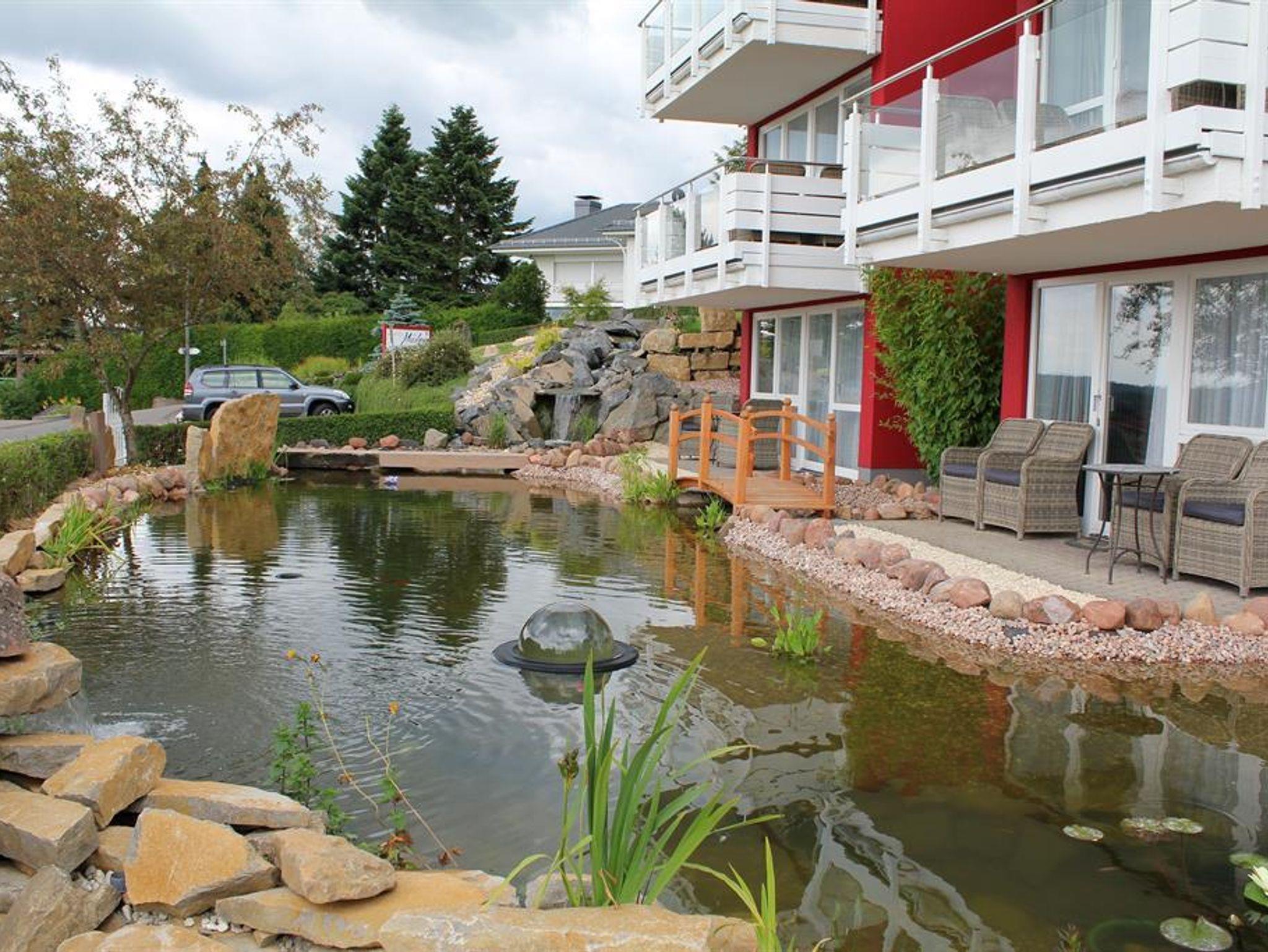 Zwei wundervoll und aufwendig angelegte Zierteiche mit Kois und anderen Fischen, 2 Wasserfälle, 2 Bachläufe und eine gepflegte Zierkiesanlage gehören zur Anlage. Die Aussenanlagen sind abends romantisch angestrahlt. In den Teichen befinden sich auch Schildkröten. Sitzen Sie gemütlich bei einem Kaffee oder einem Cocktail auf dem Balkon oder der Terrasse und schauen Sie den Fischen und den Schildkröten zu. Oder blicken Sie ins Tal auf den See.
