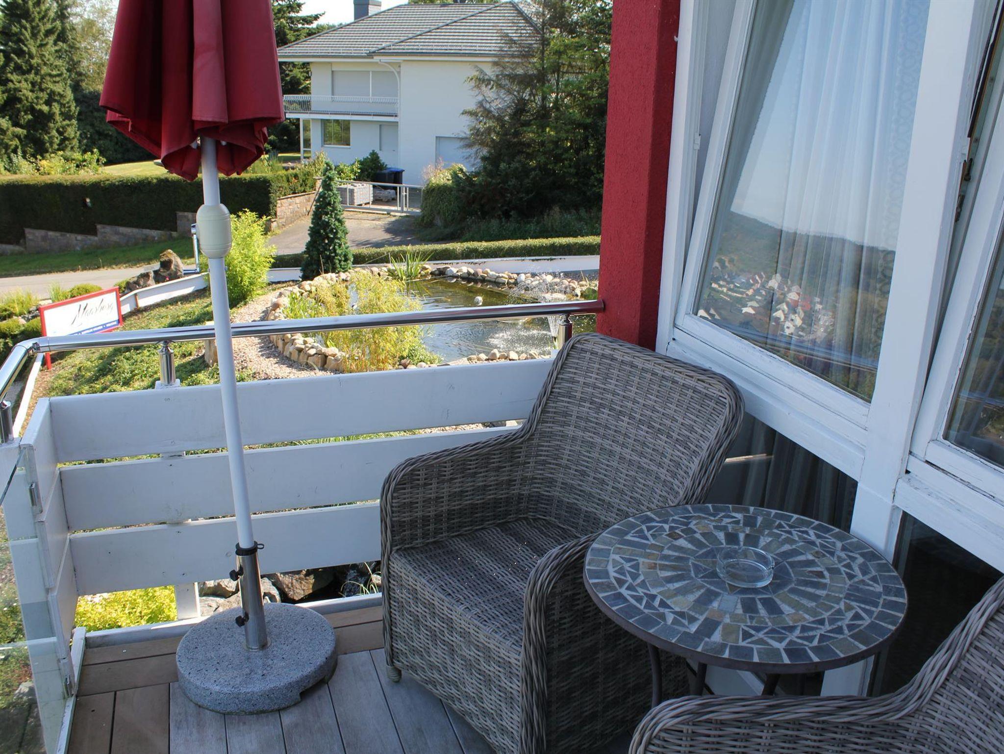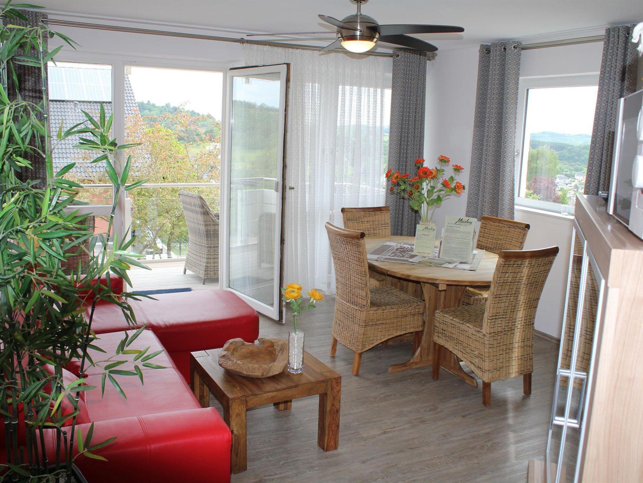 Ferienwohnung Maaridyll im Maarberg Resort: Elegante, komplett neu eingerichtete Ferienwohnung für 2 bis 6 Personen. ca. 54 qm Wohnfläche, Balkon Richtung See und unterem Zierteich mit herrlichem Panoramablick und Blick auf den See, die beiden Zierteiche, die Wasserfälle, Bachläufe und die Zierkiesanlage.
